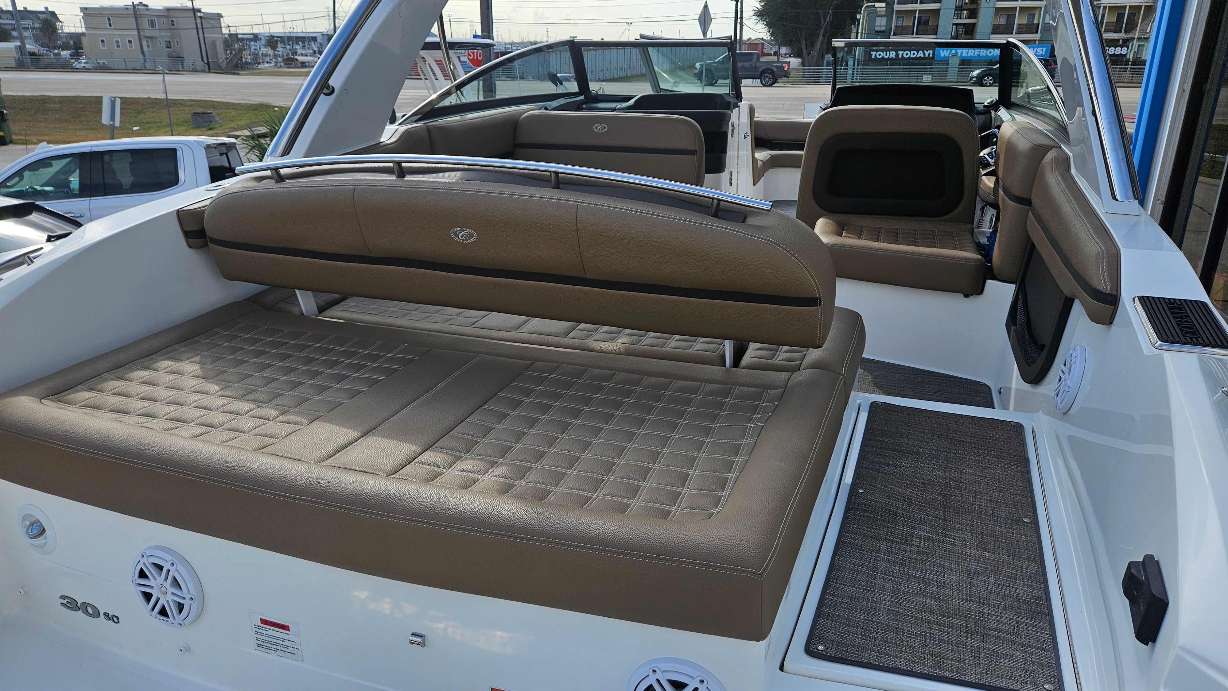 The Cobalt 30 SC is designed with practicality in mind, making ownership easy and enjoyable. The windlass anchor system simplifies the process of securing your boat, saving you time and effort. The aluminum triple axle trailer offers reliable transport, so you can take your boat to new destinations or store it safely when not in use. The twin Yamaha F300 engines provide not only impressive power but also efficient operation, helping you maximize your time on the water while minimizing fuel consumption. The snap-in carpet is easy to clean and maintain, ensuring your boat stays looking its best. With thoughtful features like these, the Cobalt 30 SC is a Bowrider boat for sale that delivers both convenience and performance.