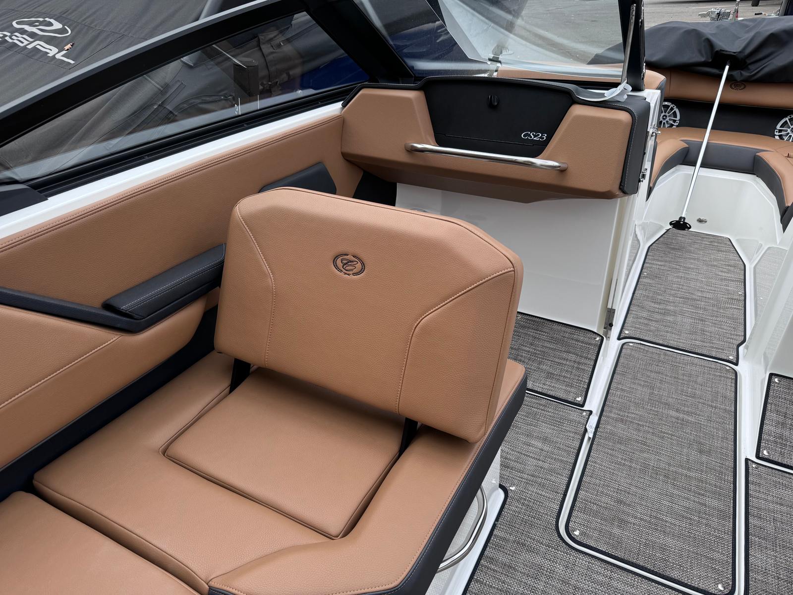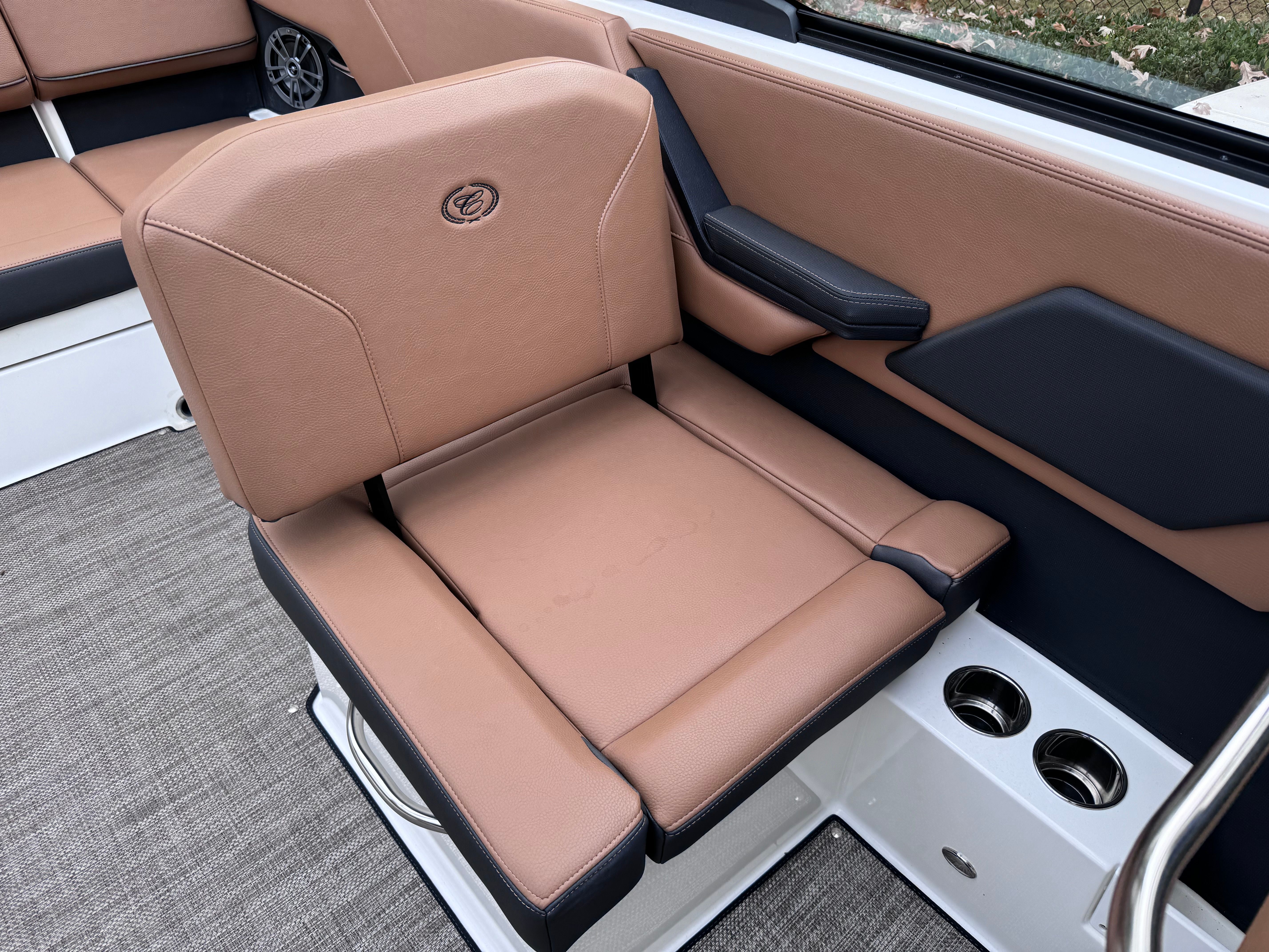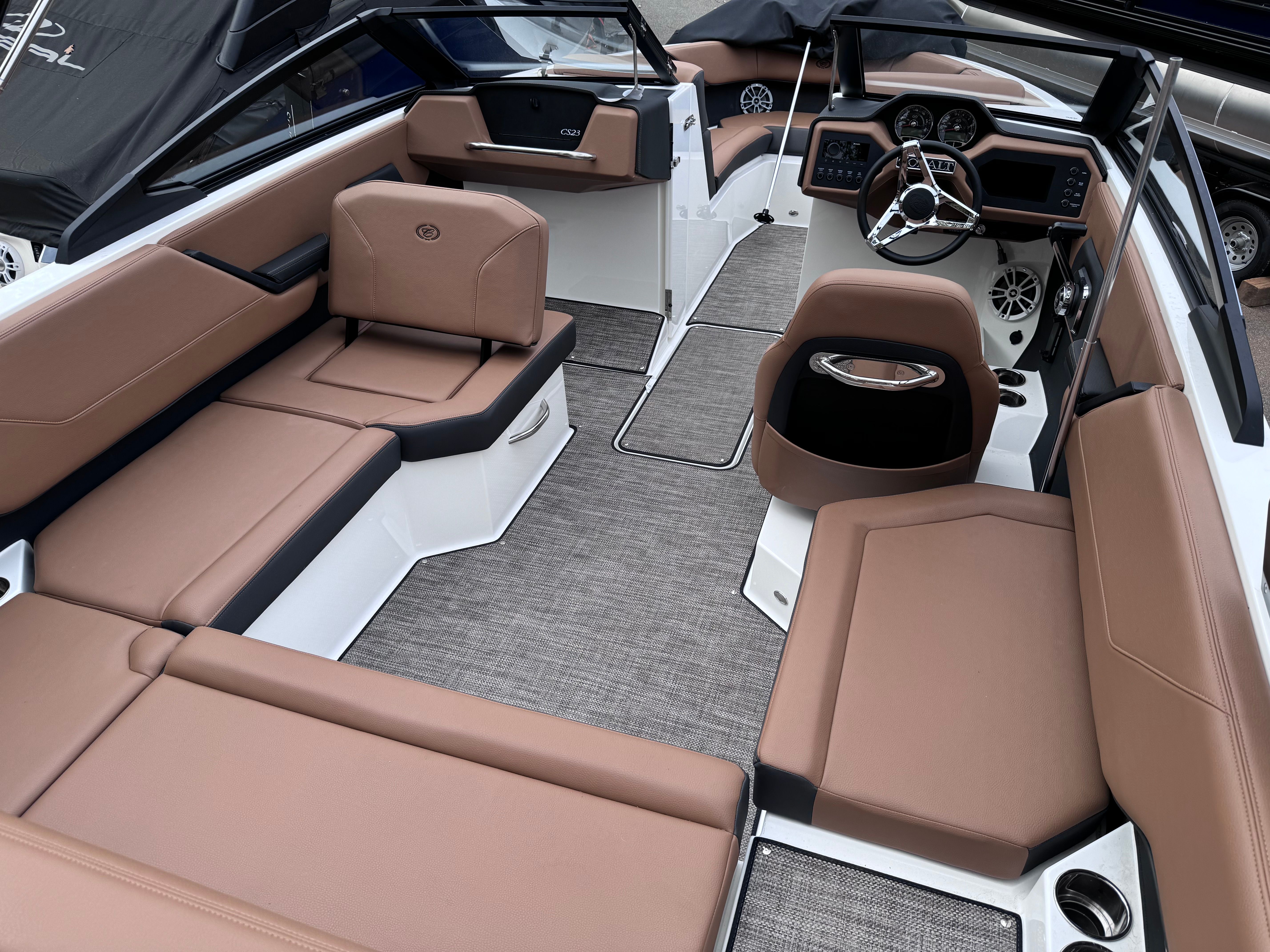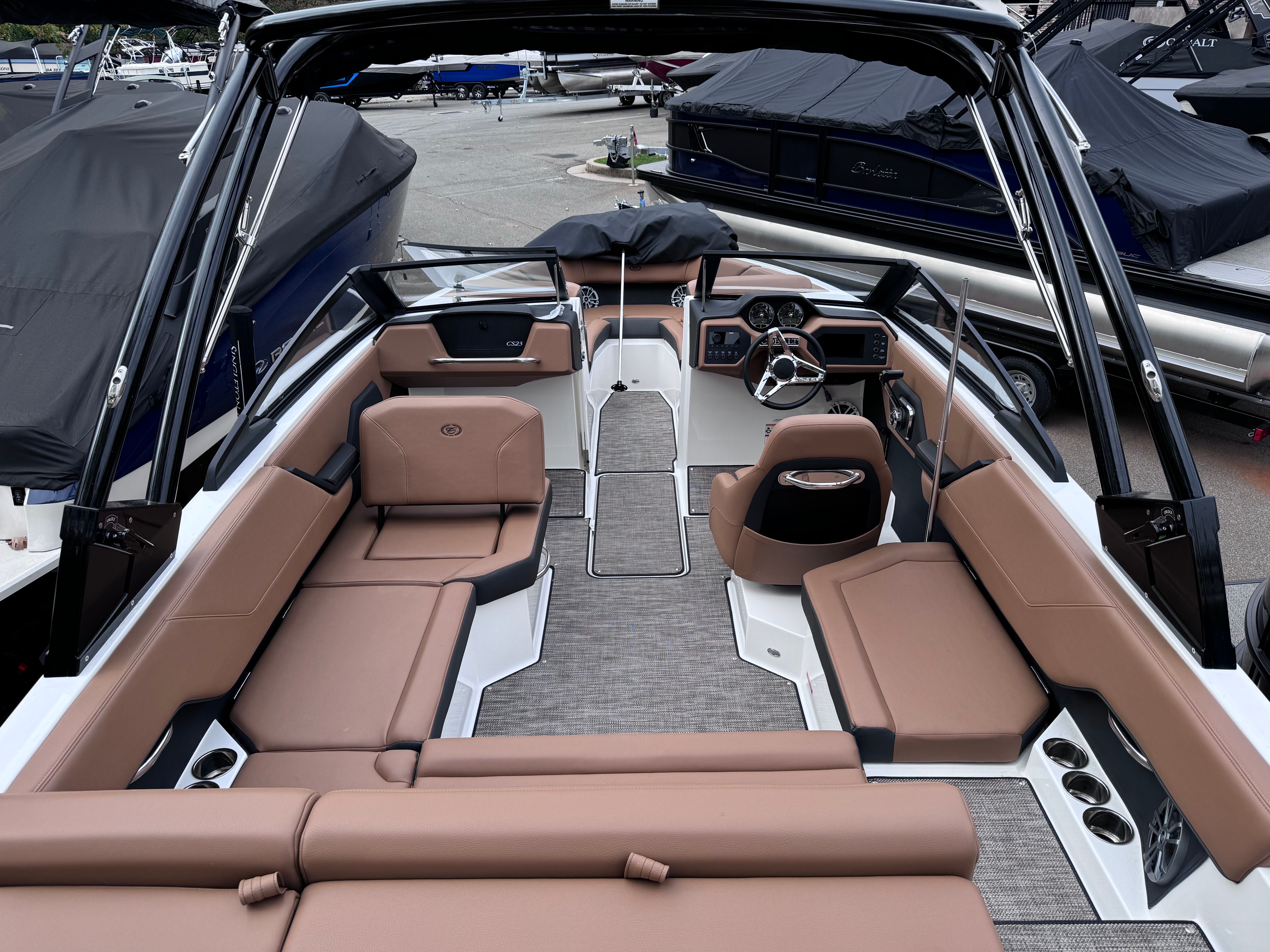 The 2025 Cobalt CS23 is a new 23.42-foot bowrider that showcases the brand’s commitment to quality and innovation. This model is meticulously crafted to deliver a premium boating experience, whether you are cruising with family, entertaining friends, or enjoying solo escapes. The CS23’s contemporary design is complemented by a rich Ebony hull bottom and White Satin accents, making it a true head-turner at any marina or lake. The Carbon and Caramel interior creates a warm, inviting atmosphere, while the Cobalt letters add a touch of signature elegance.