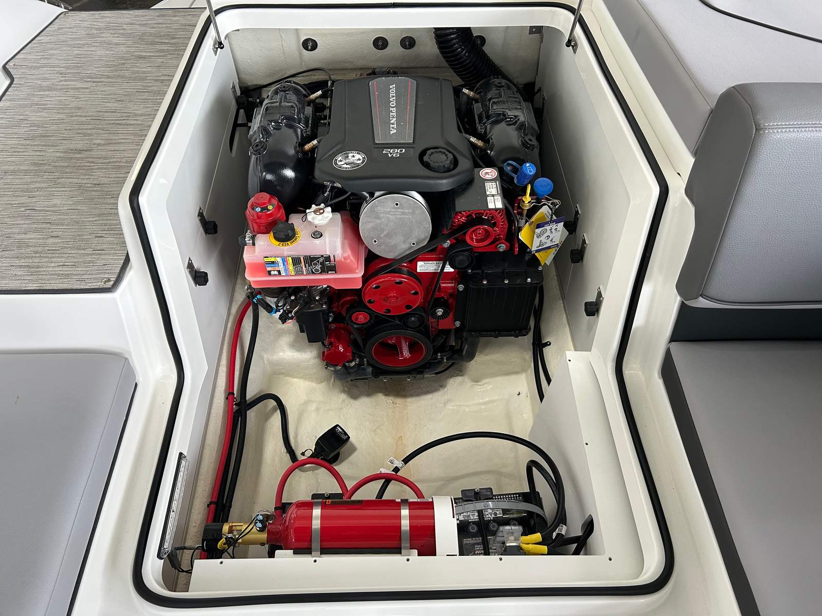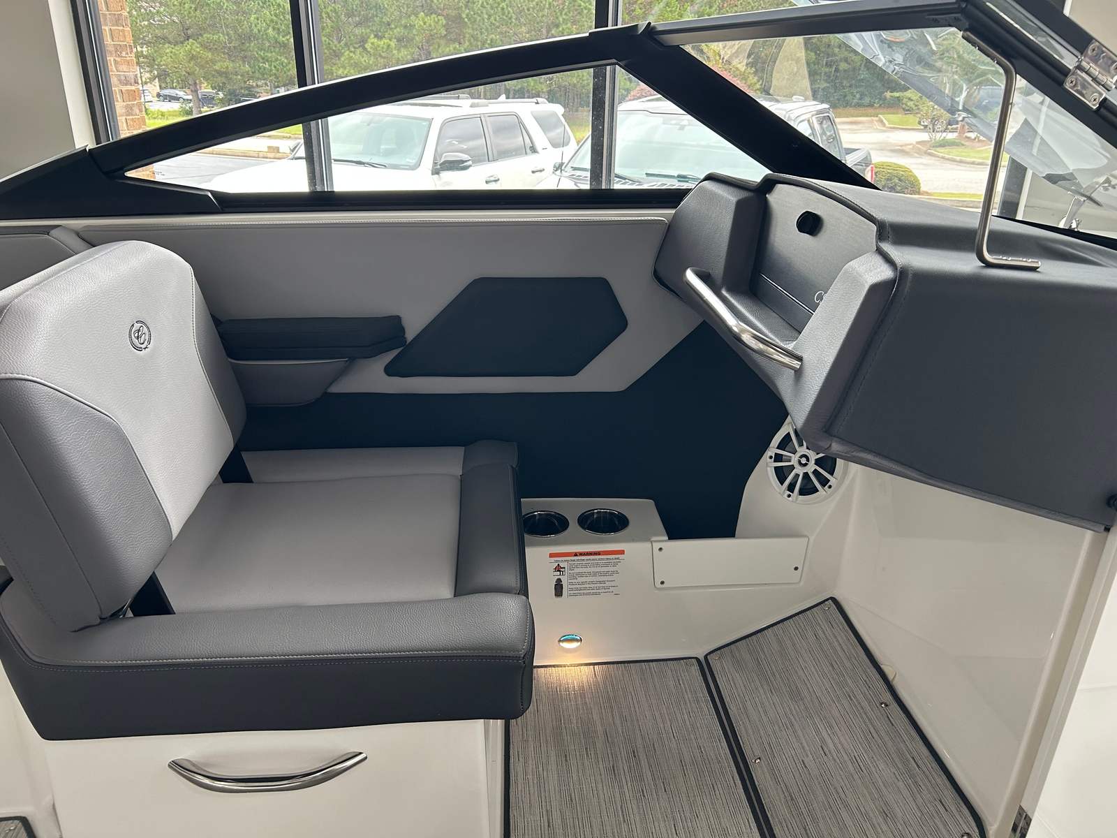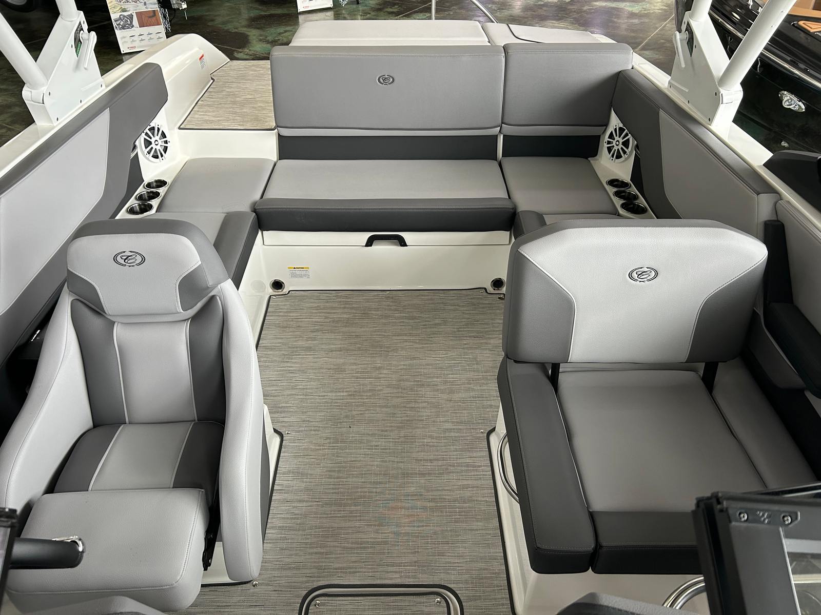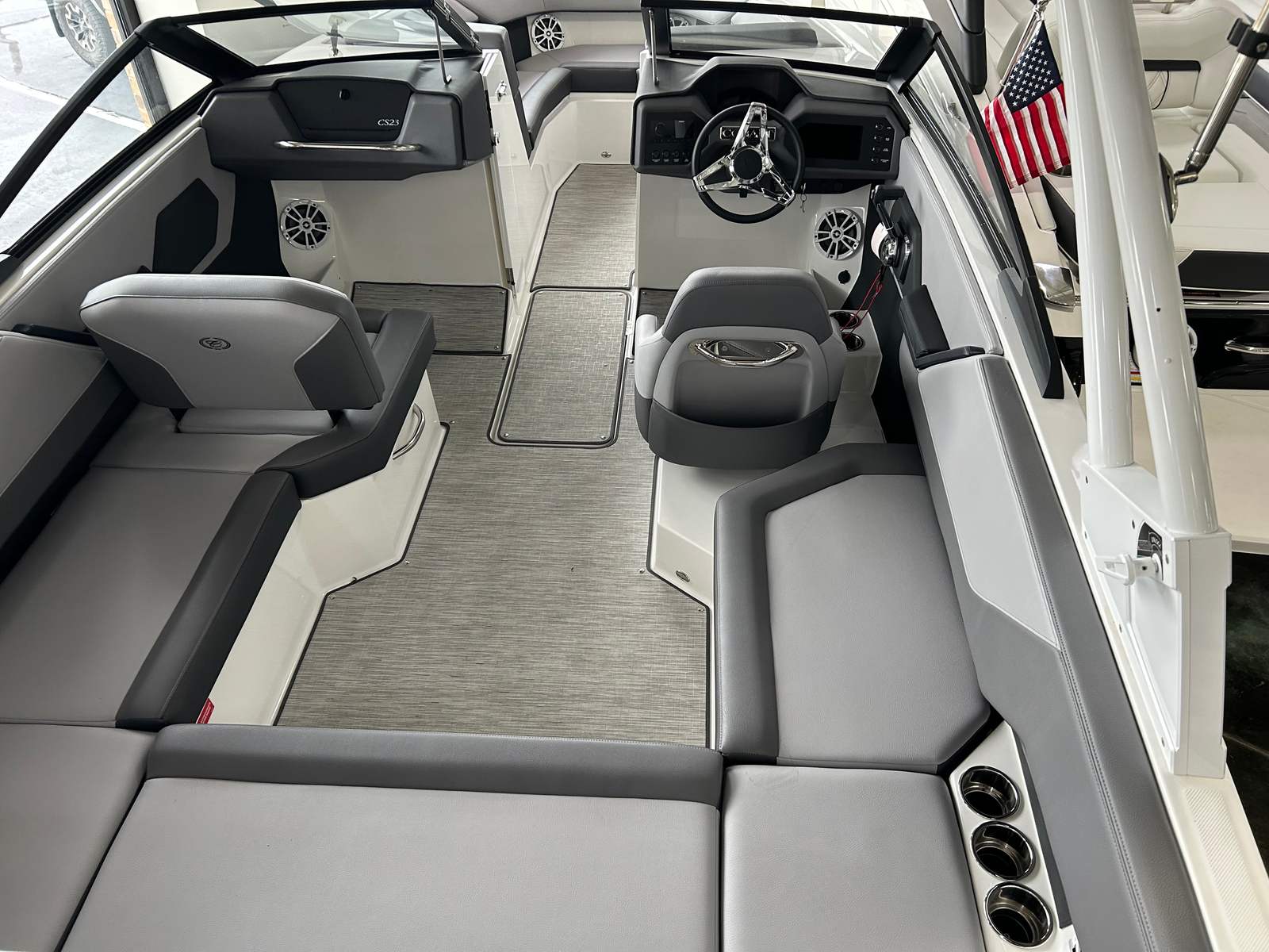 Practicality is at the core of the Cobalt CS23’s design. The boat’s manageable length makes it easy to dock, trailer, and store, while the folding tower allows for convenient storage in garages or boat houses with height restrictions. The Silver Ash seagrass flooring is both stylish and functional, offering a slip-resistant surface that is easy to clean after a day of fun. The depth and water/air temperature gauge package provides valuable information for safe navigation and optimal enjoyment, whether you are fishing, swimming, or simply exploring new waters.The CS23’s layout is designed for versatility, with plenty of storage compartments to keep your gear organized and out of the way. The manual adjustable seat ensures that drivers of all sizes can find a comfortable position, making long days on the water more enjoyable. The automatic fire extinguisher system adds an extra layer of safety, giving you confidence as you embark on new adventures.