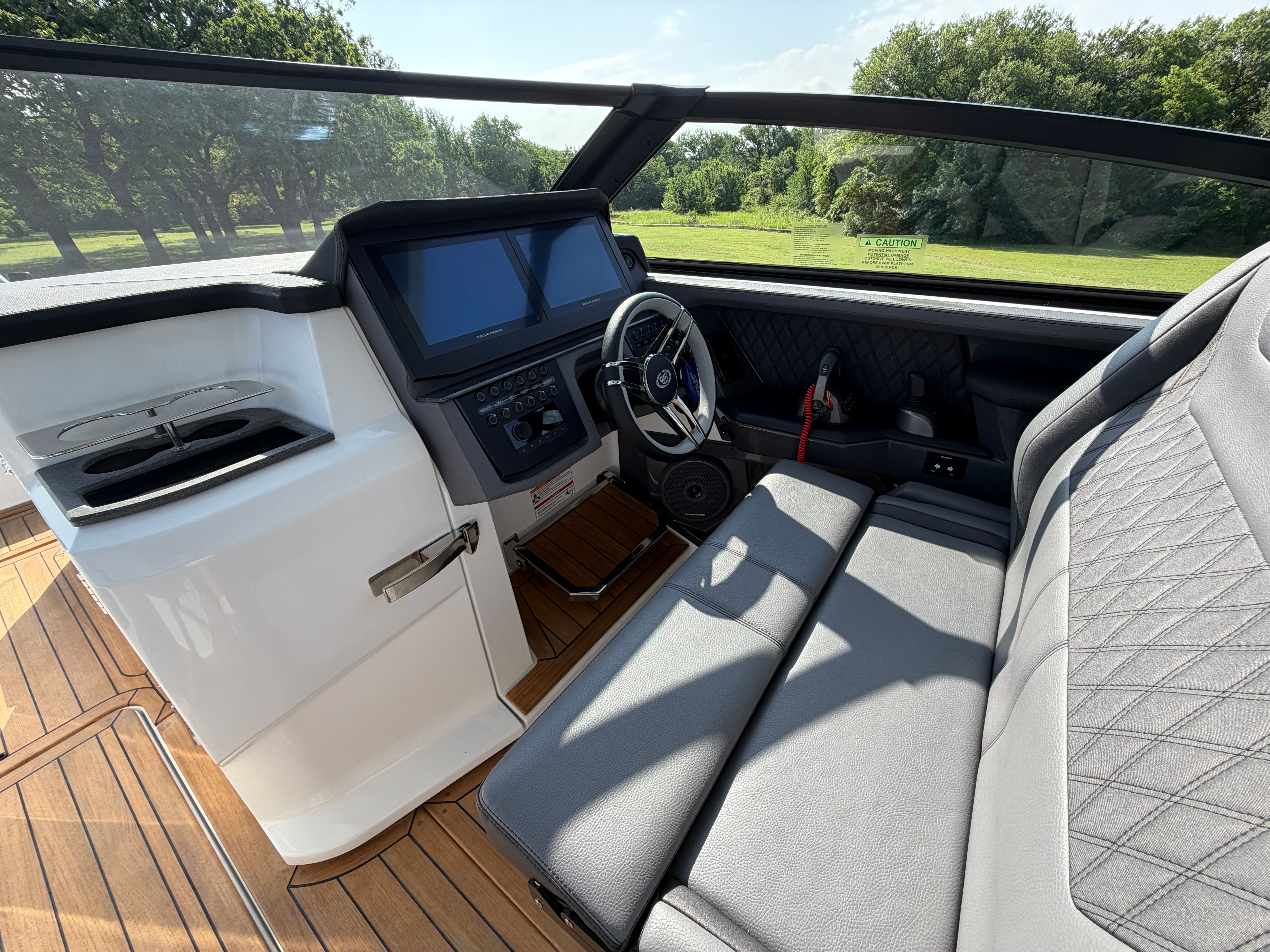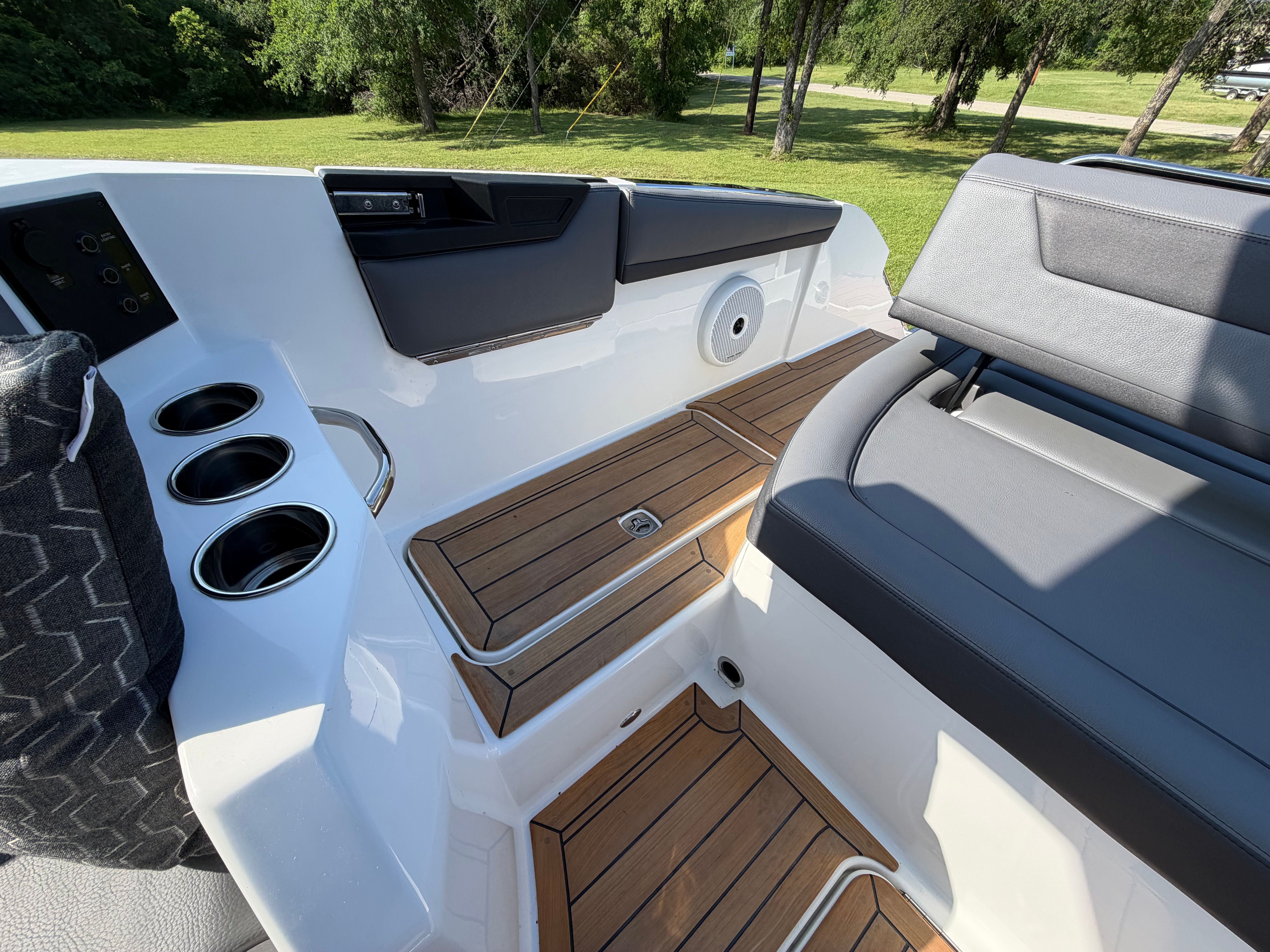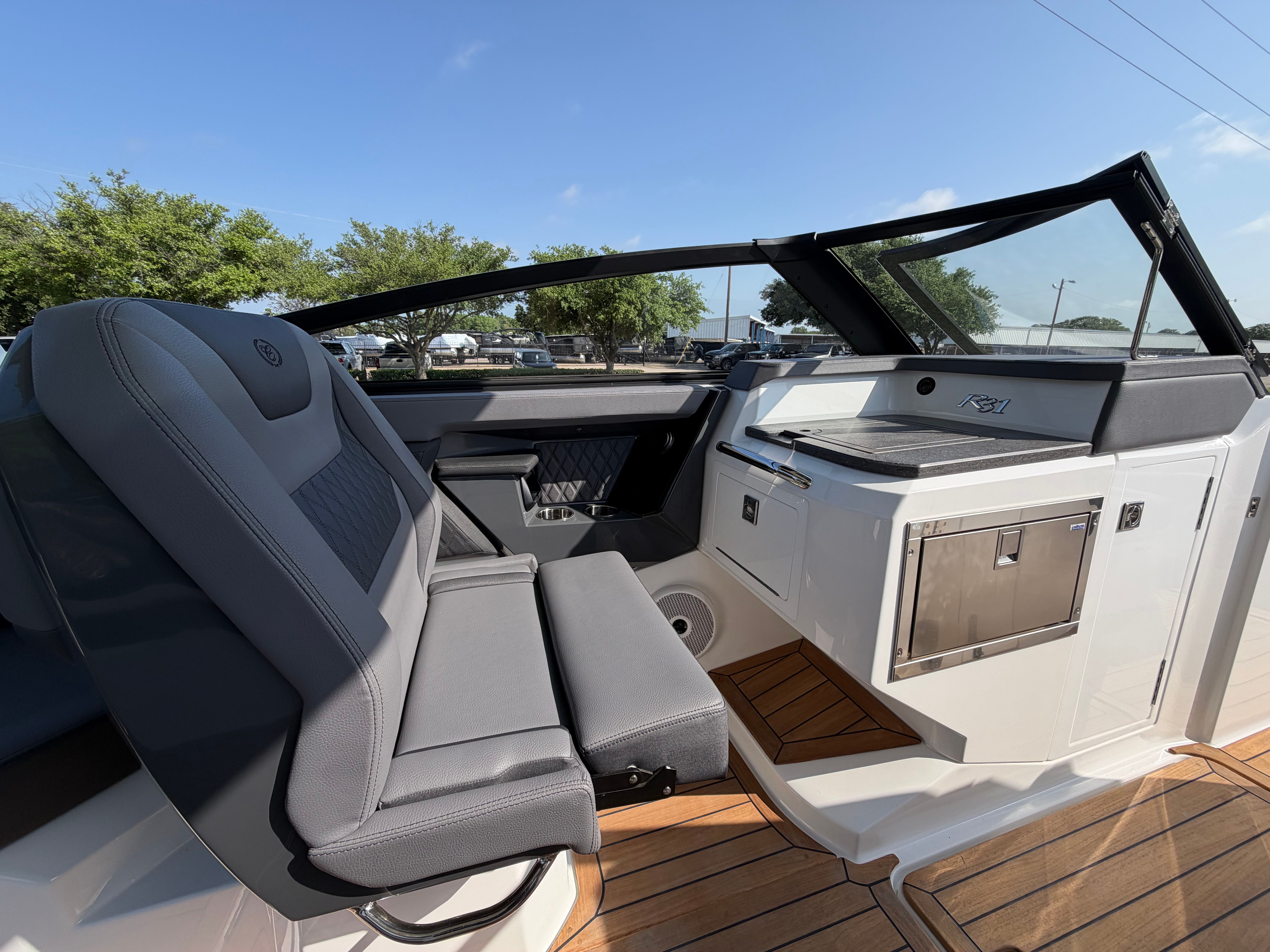 The Cobalt R31 is designed with practicality in mind, offering features that make ownership easy and enjoyable. The battery maintainer and charger ensure your boat is always ready for action, minimizing downtime and maintenance hassles. The air compressor with holder provides quick access for inflating water toys, paddleboards, or other gear, adding convenience for active families and adventurers.Docking is simplified with the rear-facing camera, giving you clear visibility and control in tight spaces. The spacious layout and thoughtful storage solutions make it easy to stow gear, supplies, and personal items, keeping the deck clutter-free and organized. The climate control system at the helm and head ensures comfort during long cruises or overnight stays, while the electric awning offers instant shade and protection.