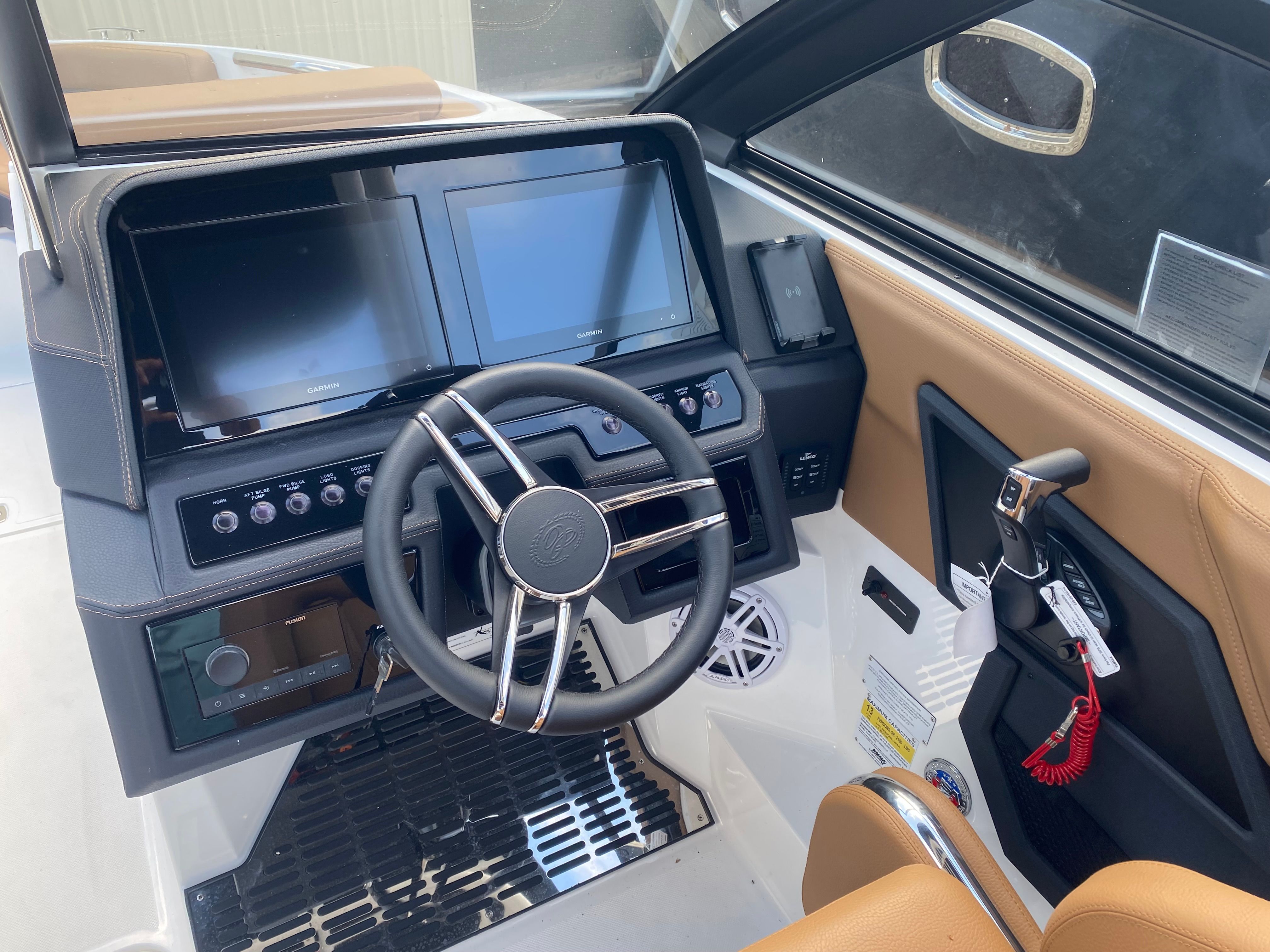 The 2025 Cobalt R4 OB is loaded with special features that enhance both style and functionality. Stainless steel docking lights provide superior visibility and a touch of elegance, making nighttime arrivals and departures safer and more stylish. The black leather and stainless steel steering wheel offers a luxurious feel and precise control, while the battery maintainer/charger ensures your boat is always ready for action.The striking graphite gray accent stripe and white hull bottom create a sophisticated exterior profile, complemented by the ebony bow tonneau cover. Inside, the caramel and carbon interior delivers a warm, inviting atmosphere, perfect for relaxing or entertaining guests. The aft-facing rumble seat is ideal for lounging at anchor or watching the action behind the boat, and the ski tow pylon opens up a world of water sports possibilities. The battery switch with ACR-dual adds an extra layer of convenience and safety, ensuring you have reliable power management on every trip.