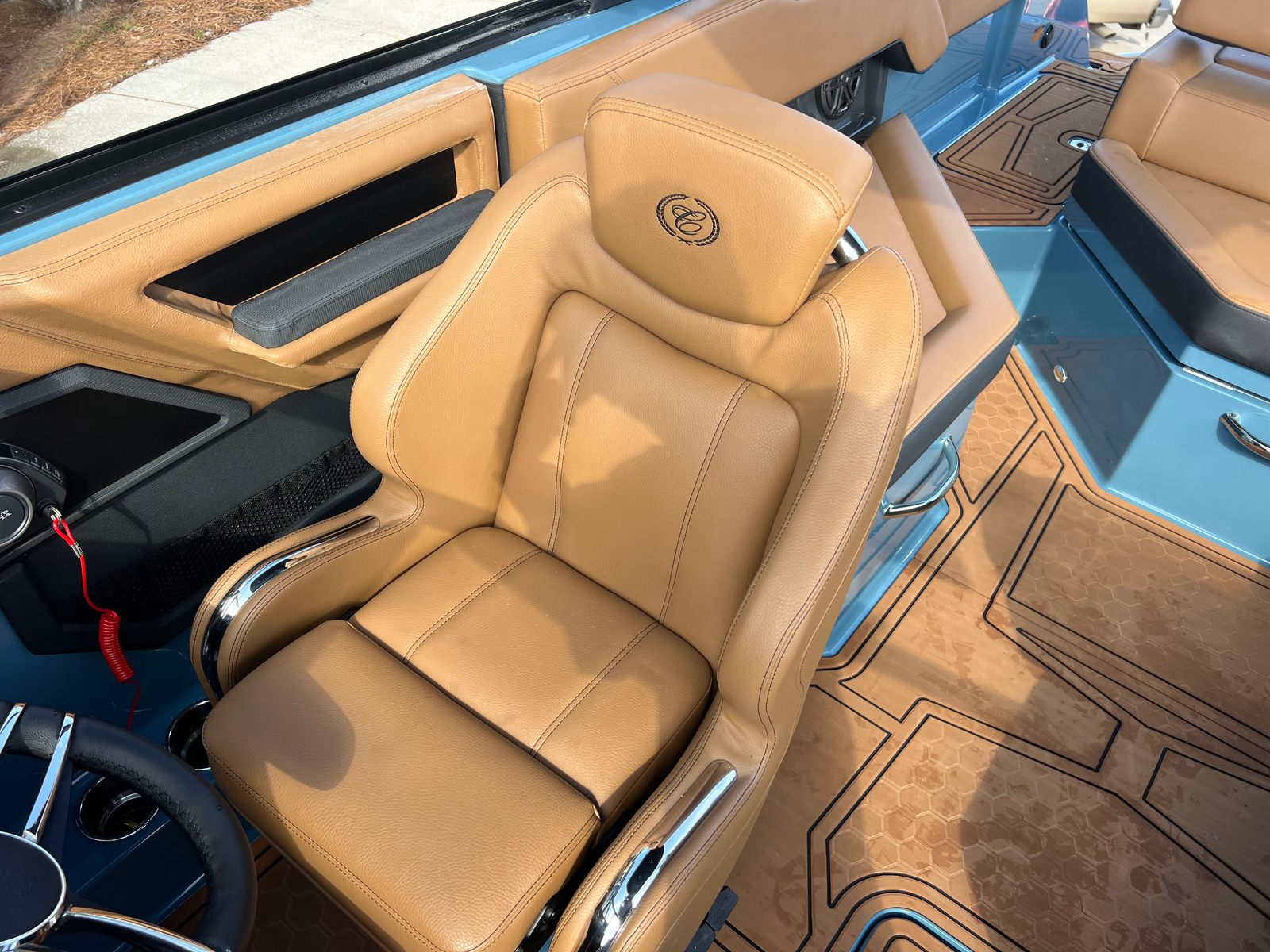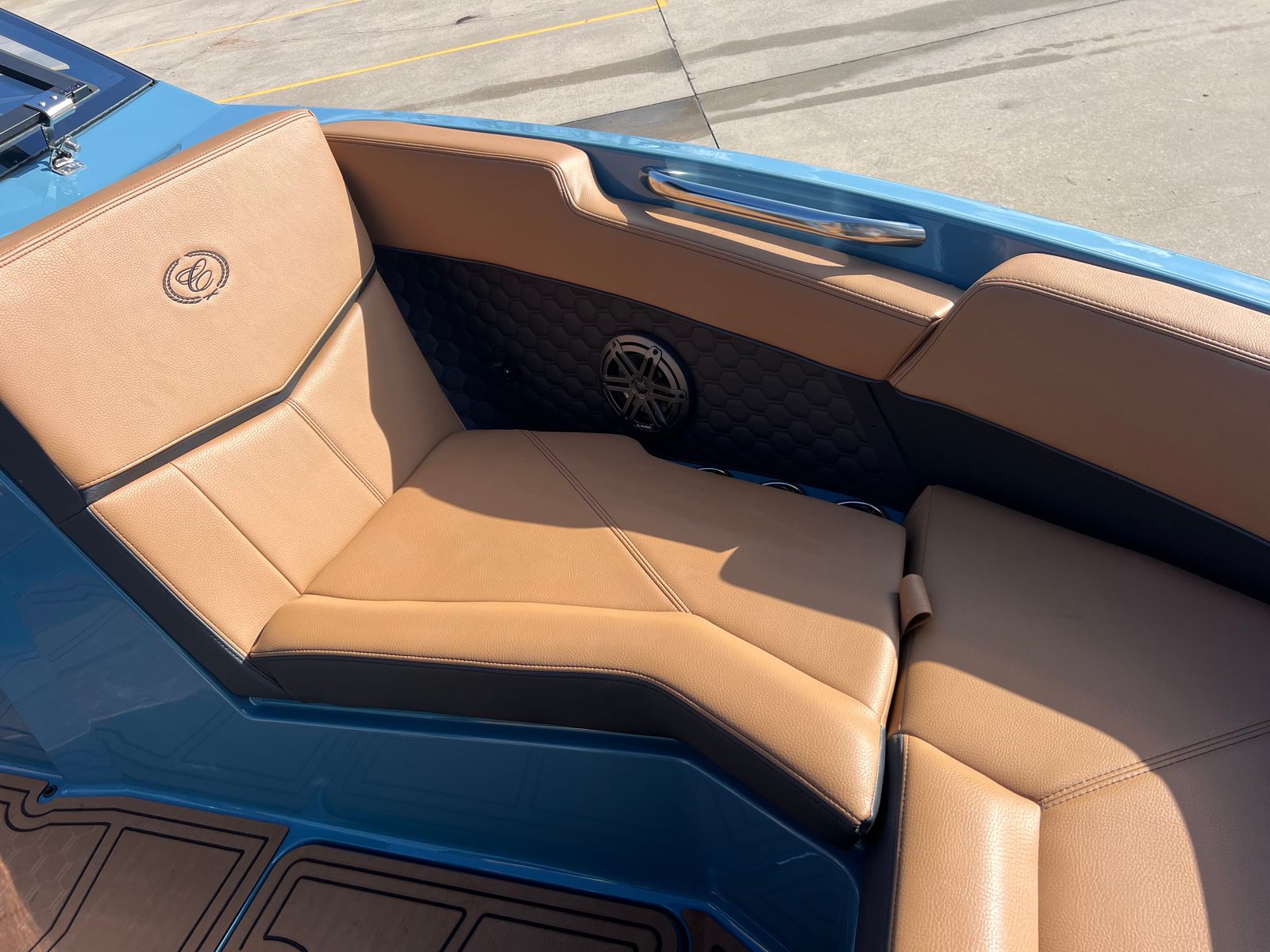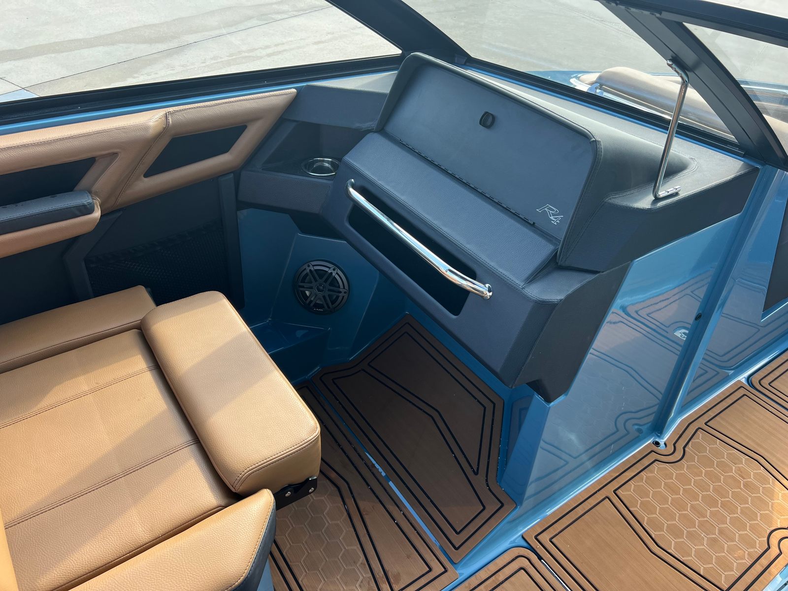 The 2026 Cobalt R4 Surf is a 24.25-foot bowrider that stands out with its sleek lines and modern design. As a brand-new model, it showcases the latest innovations in boating technology and style. The R4 Surf’s Bayside Blue upper surf accent and surf mid hull side, complemented by a rich ebony accent stripe and hull bottom, create a striking visual presence on the water. The swim platform extension in rich ebony further enhances both the look and functionality of this remarkable vessel. Step aboard and you’ll immediately notice the sophisticated interior, featuring a harmonious blend of caramel, carbon, and ebony tones, ensuring every journey is as comfortable as it is stylish.