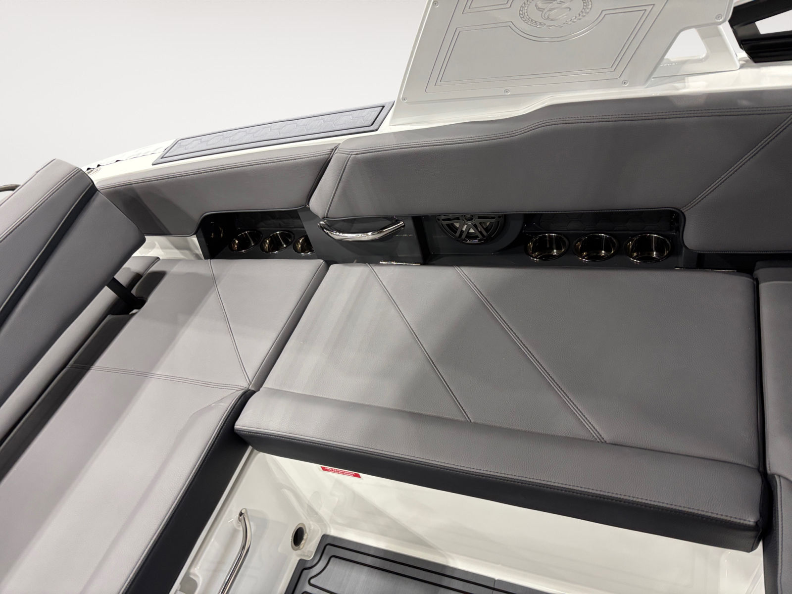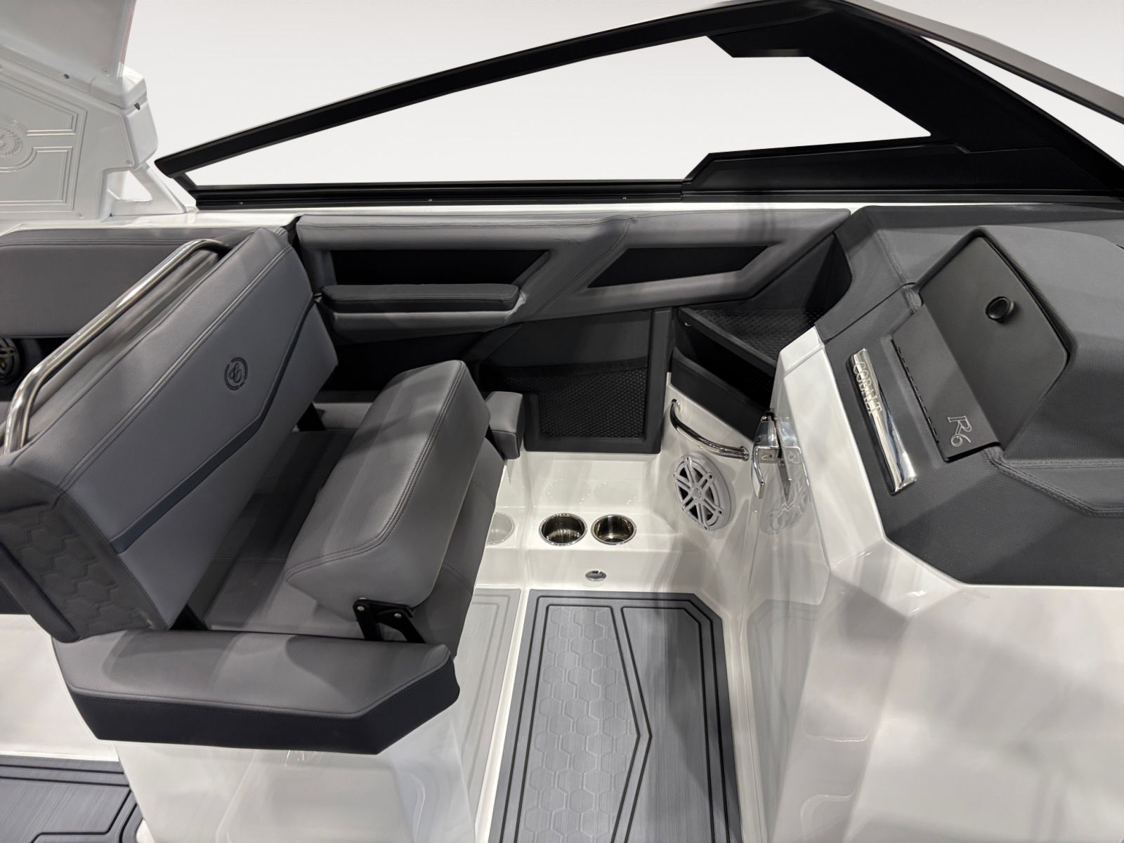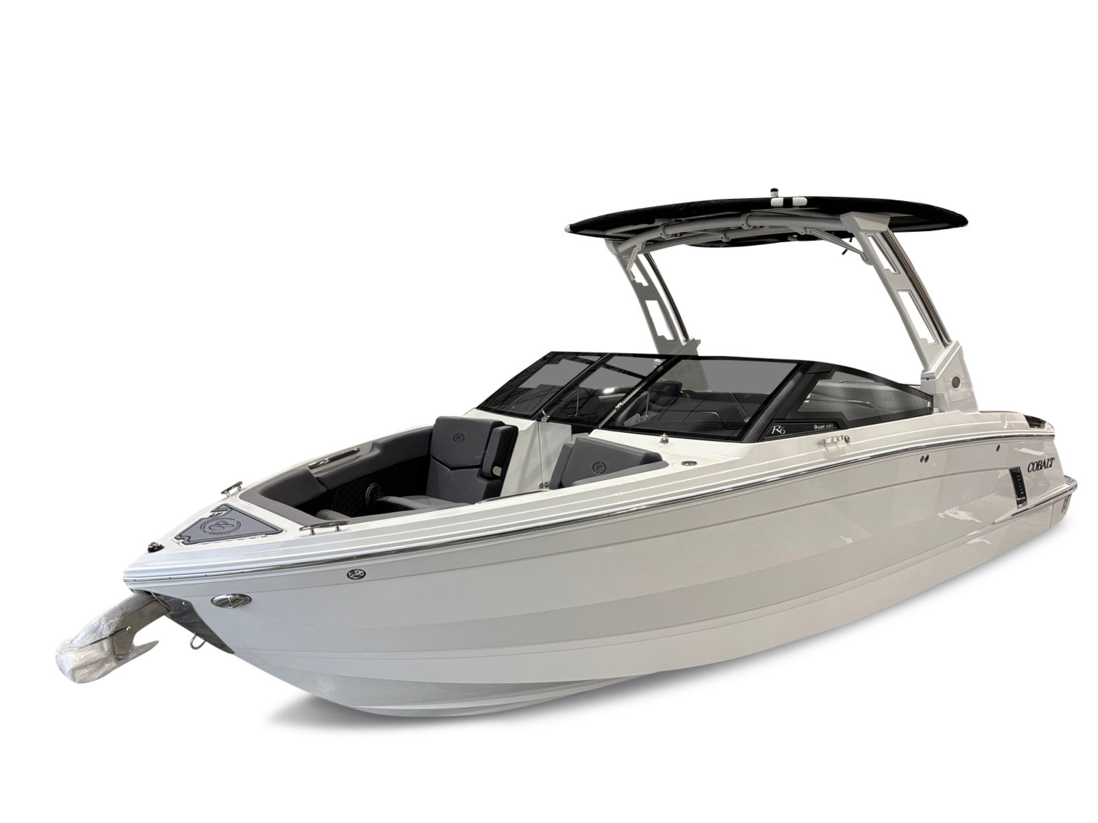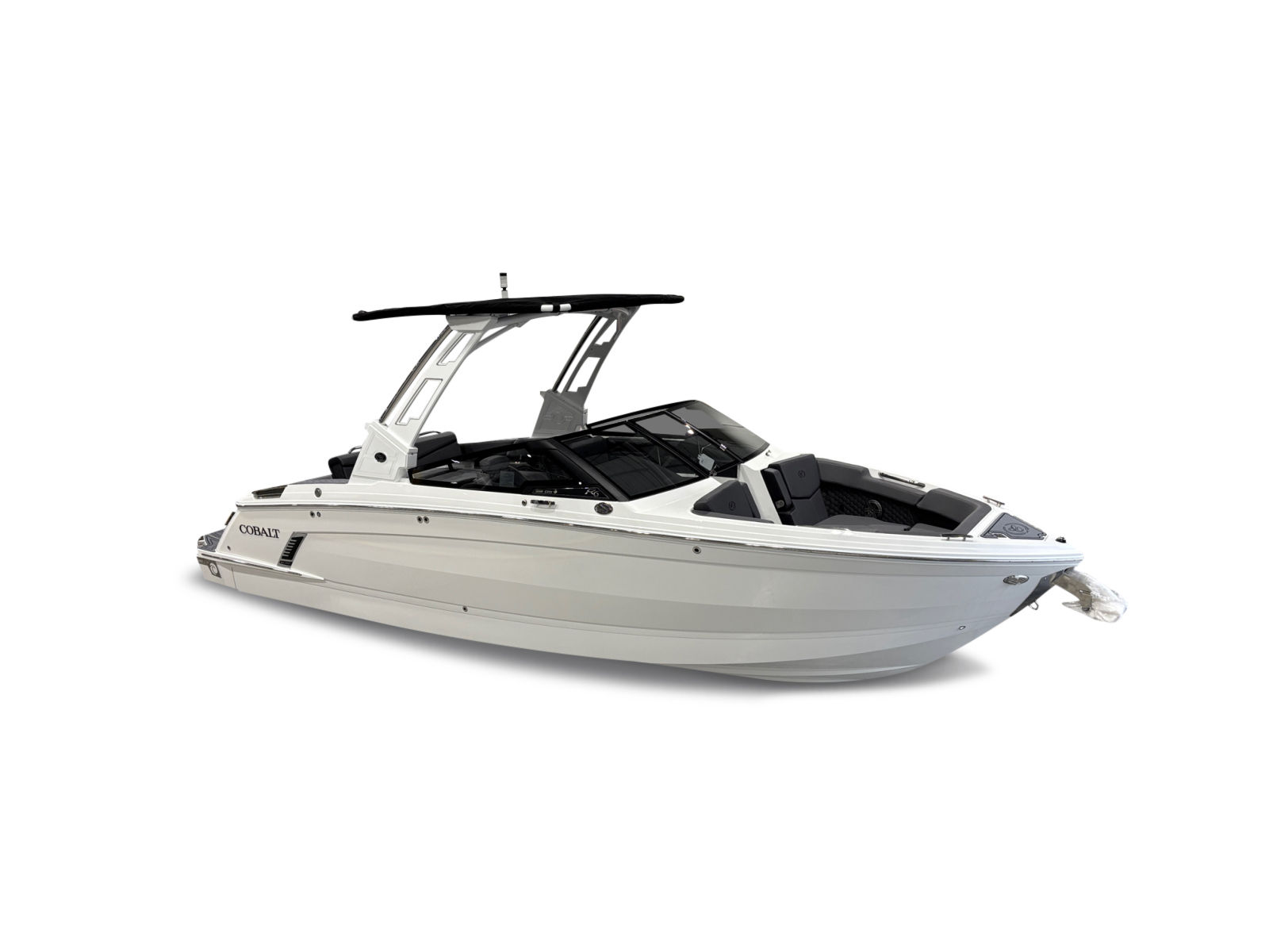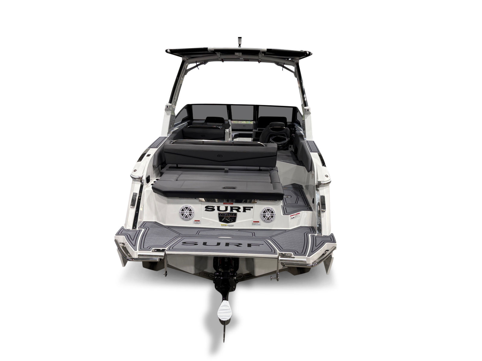 The Cobalt R6 Surf is loaded with premium features that elevate your boating experience. The battery maintainer/charger (110V) ensures your boat is always ready for action, while the rear-facing camera provides enhanced visibility for safer maneuvering and docking. The Cobalt letters in black satin add a touch of sophistication to the boat’s exterior, complemented by stainless steel docking lights that not only enhance safety but also contribute to the boat’s modern aesthetic.The white (folding) El Arch with Prisma and the ebony rotating shade offer both style and functionality, providing shade and comfort for all passengers. The flagpole with flag adds a classic nautical touch, while the glass cockpit with dual Garmin 8610 displays delivers state-of-the-art navigation and control at your fingertips. The head with pump out porta potti ensures convenience during longer outings, and the LED interior accent lighting, featuring customizable R/G/B colors, creates a vibrant and inviting atmosphere for evening cruises.