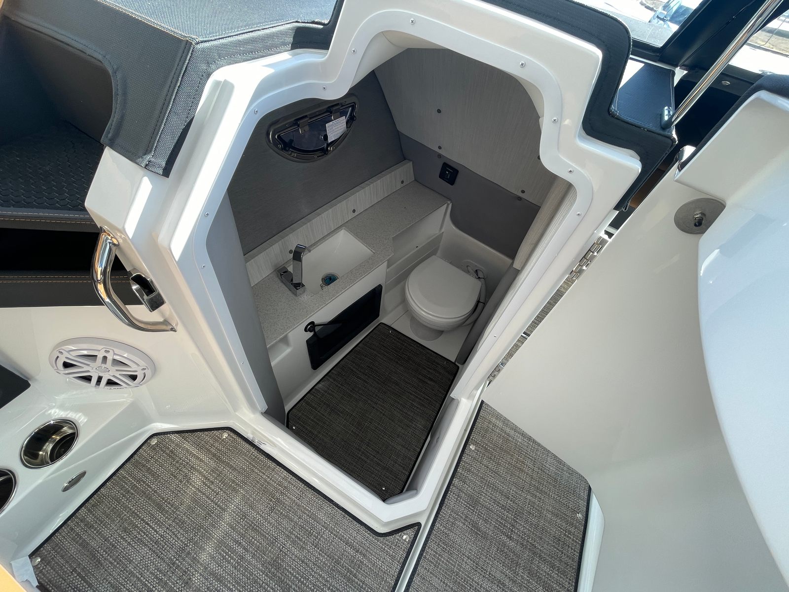 The 2025 Cobalt R8 OB is a brand-new bowrider, measuring an impressive 27 feet in length. This spacious design ensures ample room for family and friends, making it ideal for entertaining, relaxing, or enjoying a day of watersports. The R8 OB’s contemporary styling is highlighted by its Graphite Gray hull sides, Rich Ebony boot stripe, and a crisp White hull bottom, creating a sophisticated and eye-catching presence on the water. The Caramel Carbon interior, paired with a White platform and Ebony sport canvas, adds a touch of elegance and comfort to every outing.