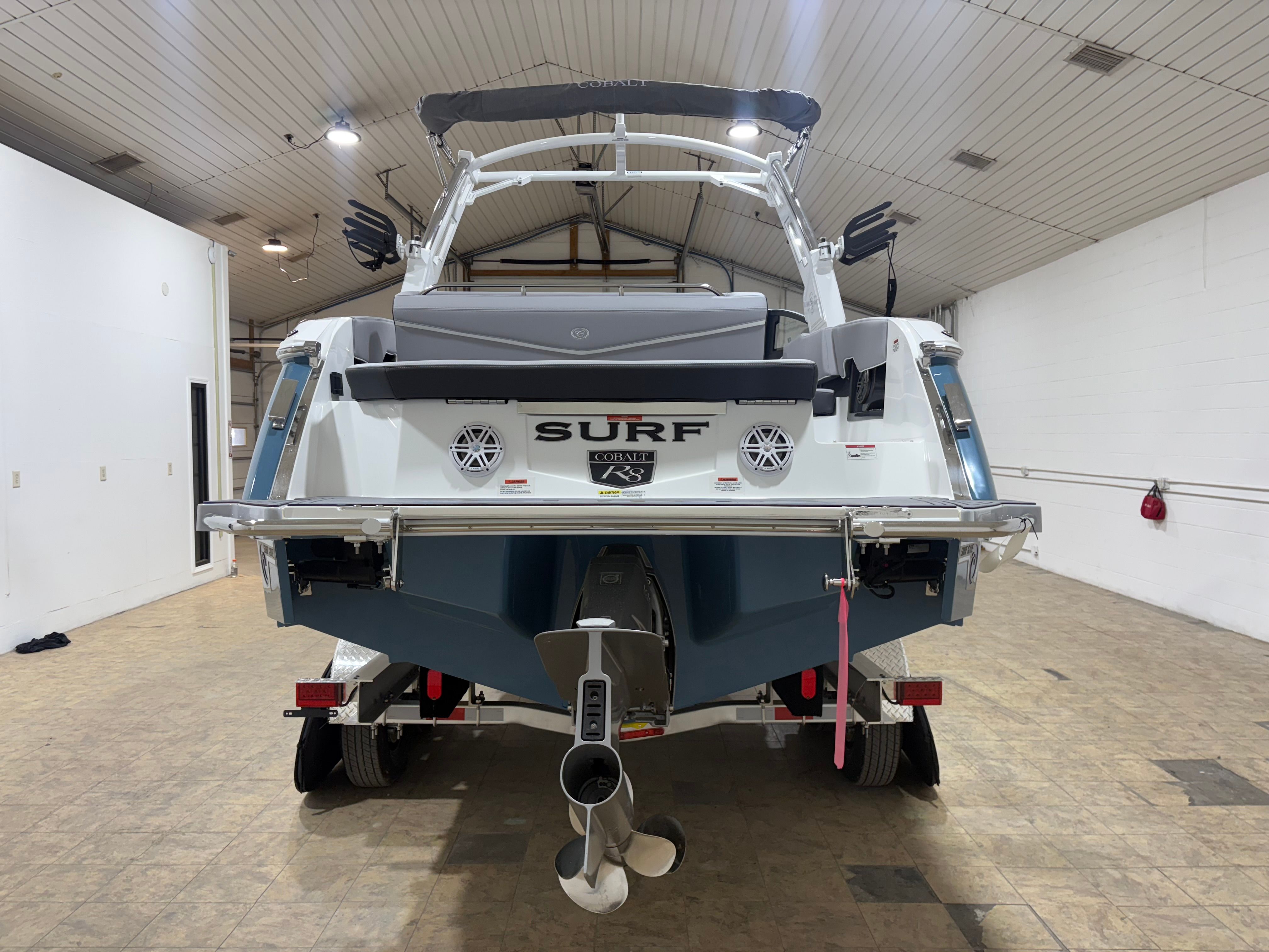 The 2026 Cobalt R8 Surf is loaded with premium features that set it apart from other bowriders on the market. The stainless steel docking lights not only add a touch of elegance but also enhance visibility and safety during low-light conditions. The White EL Arch, Prisma (Folding) with Gray Bimini, offers both style and functionality, providing shade and flexibility for different weather conditions. The floor covering in Seagrass, Silver Ash, adds a luxurious feel underfoot while being durable and easy to maintain.Step inside, and you will be greeted by a sophisticated interior finished in Frost, Slate, and White, creating a modern and inviting atmosphere. The glass cockpit, featuring dual Volvo 8610 displays, puts advanced navigation and control at your fingertips, ensuring a seamless and intuitive boating experience. The hull bottom in Bayside Blue not only enhances the boat’s visual appeal but also reflects Cobalt’s commitment to quality and craftsmanship.For those who love music on the water, the premium sound system with transom speakers and remote ensures that your favorite tunes are always within reach, whether you are lounging in the cockpit or enjoying the swim platform. The Surf Gate Accent in Pacific Blue adds a custom touch, highlighting the boat’s surf-ready capabilities. A mooring cover with Prisma folding arch protects your investment and keeps your boat looking pristine.