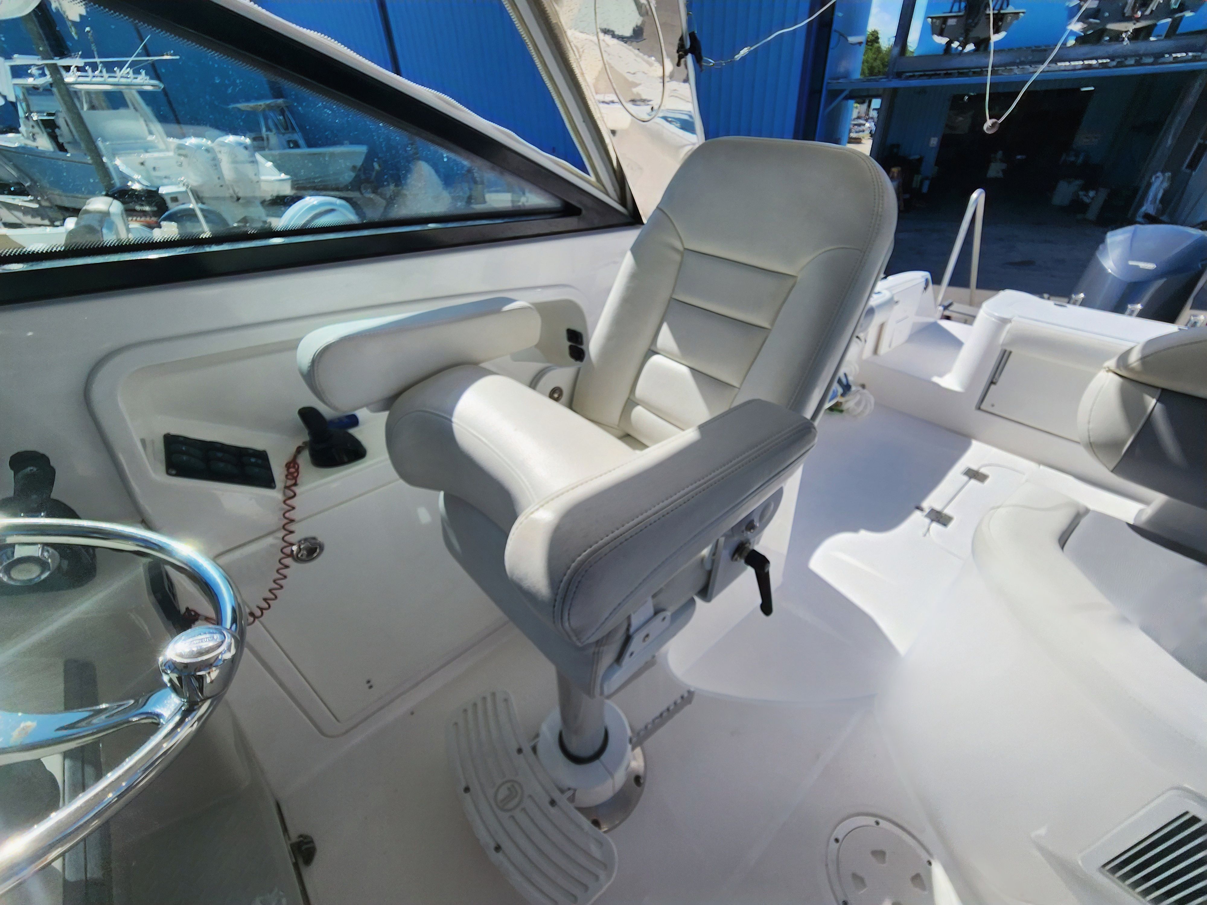 The Everglades 320 EX is loaded with features that enhance both its fishing capabilities and onboard comfort. As an offshore boat for sale, it’s designed to meet the needs of serious anglers while also catering to those who appreciate luxury and convenience. The spacious cockpit provides plenty of room for casting lines and reeling in the catch of the day, while the well-designed helm offers excellent visibility and intuitive controls for stress-free navigation. The 32-foot length ensures generous deck space, making it easy to move around and enjoy all the amenities this Everglades boat for sale has to offer.