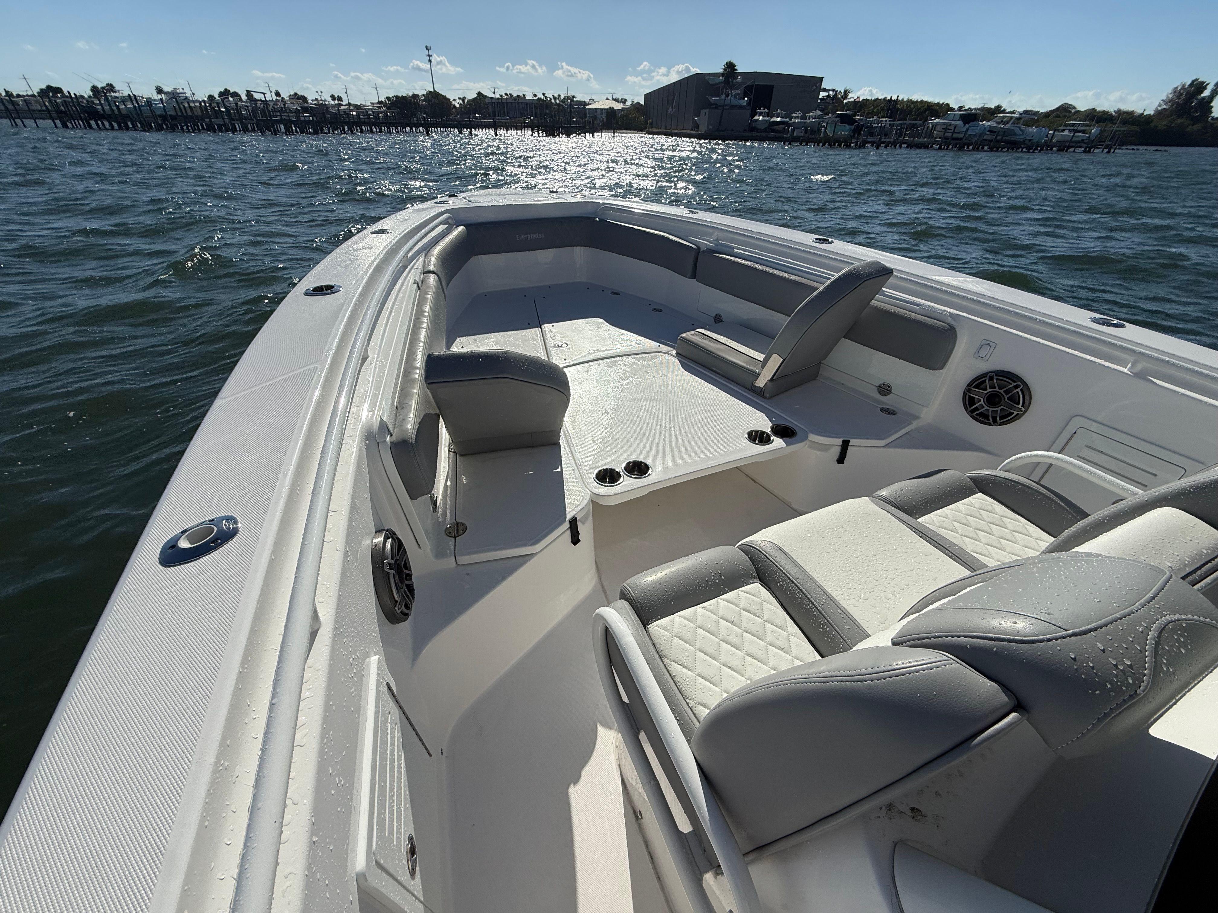 In addition to its recreational appeal, the Everglades 365 CC offers a range of practical benefits that make ownership a breeze. The ample storage compartments keep your gear organized and out of the way, while the intuitive helm layout ensures that all controls are within easy reach. Docking is simplified by the responsive twin engines, allowing for precise maneuvering in tight spaces.Fuel efficiency is another highlight of this Everglades boat for sale, thanks to its modern engine technology and streamlined hull design. Whether you are planning long-distance trips or quick outings, you can enjoy more time on the water and less time at the fuel dock. The durable construction and quality materials used throughout the boat also mean lower maintenance requirements and greater peace of mind for owners.