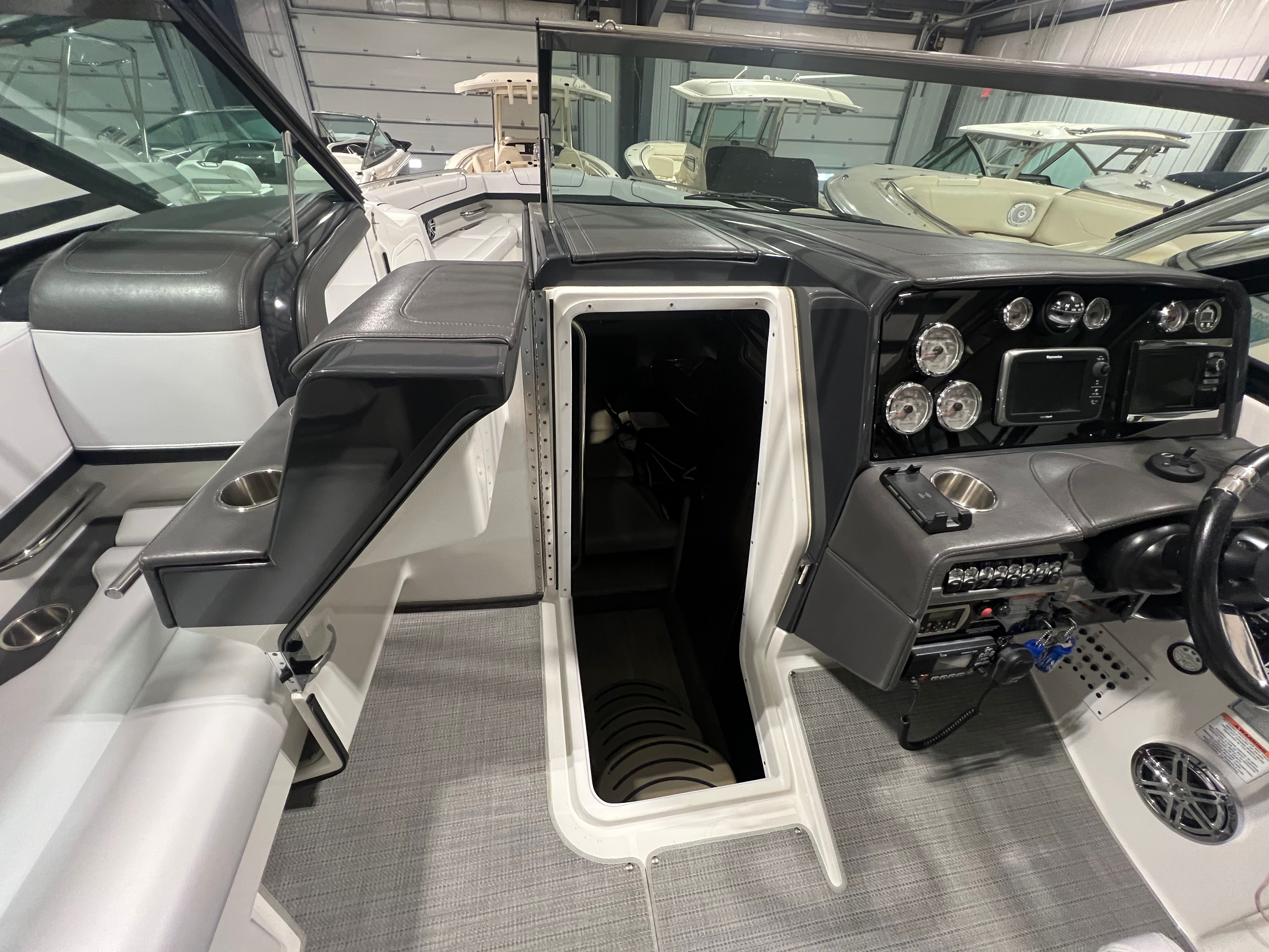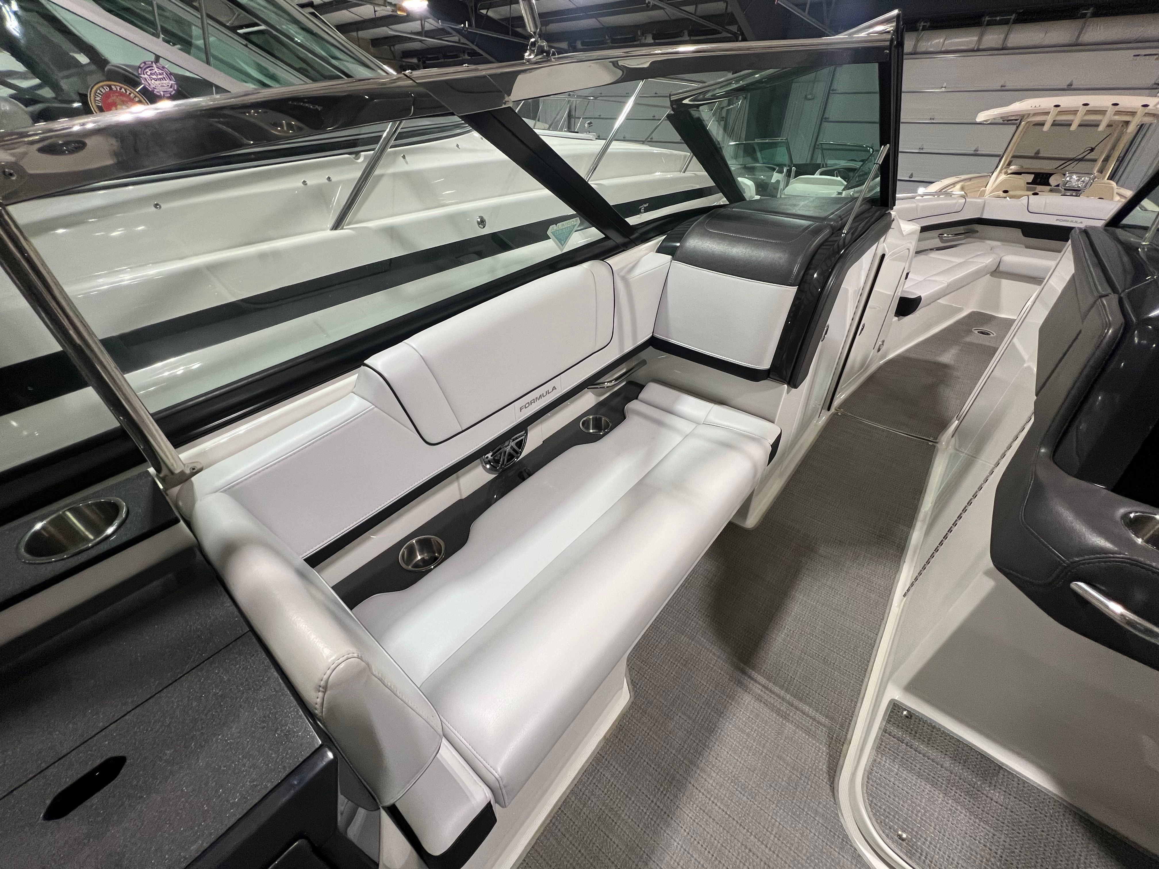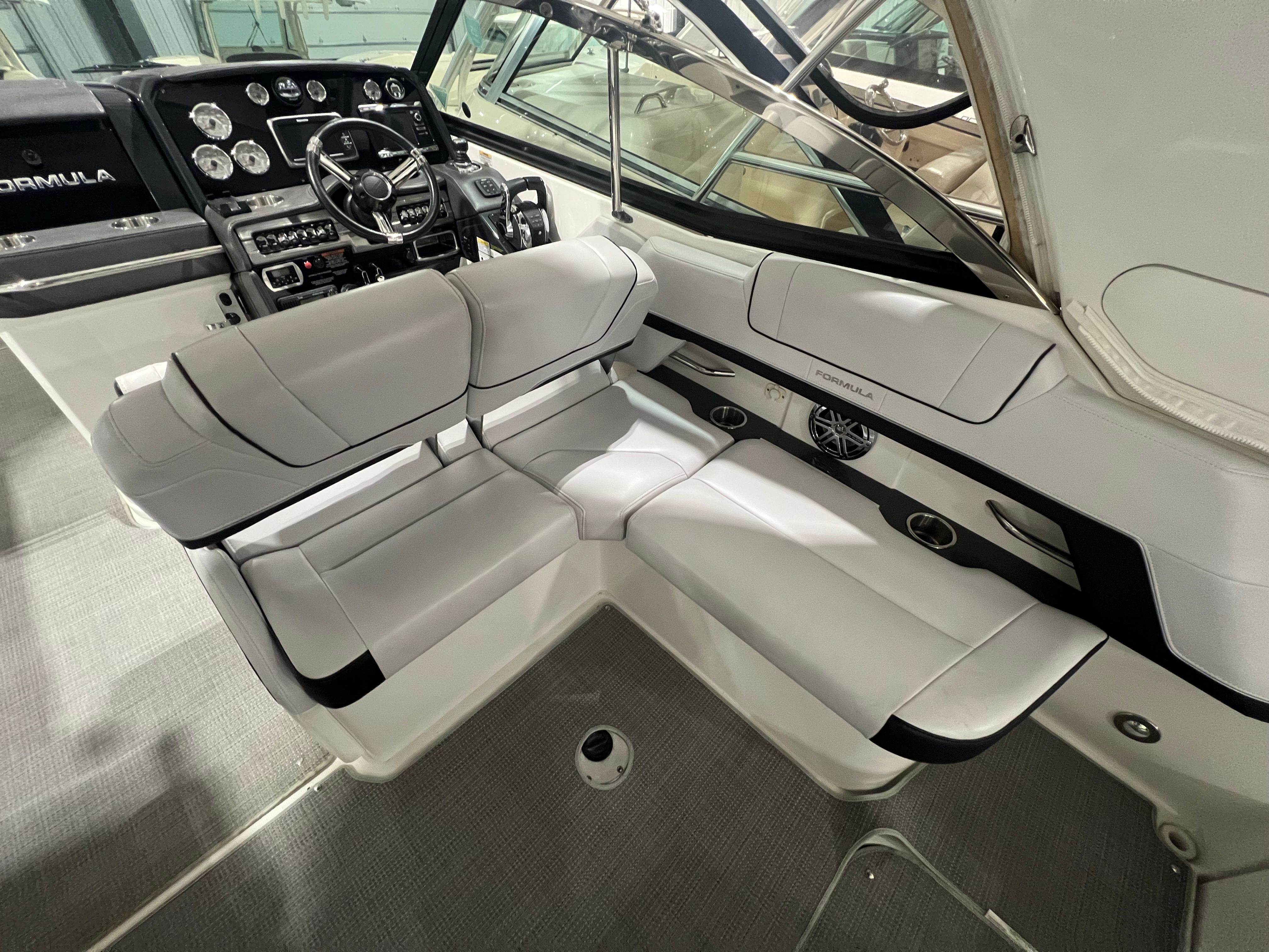 Owning the Formula 330 CBR cruiser means embracing a lifestyle of fun, relaxation, and adventure. The spacious layout is perfect for entertaining friends and family, offering ample seating and room to move about. The comfortable cabin and climate control features ensure everyone stays cozy, whether you’re escaping the summer heat or enjoying a crisp autumn evening on the water. The premium sea grass flooring in the cockpit adds both style and practicality, making cleanup after a day of fun effortless. Socializing is a breeze on this cruiser boat for sale, with plenty of space for dining, lounging, and enjoying the company of loved ones. The bimini top and camper enclosure provide flexible options for sun and shade, so you can tailor your experience to suit the weather and your preferences. Whether you’re hosting a sunset cocktail party or embarking on a weekend adventure, the Formula 330 CBR delivers the perfect setting for memorable moments.