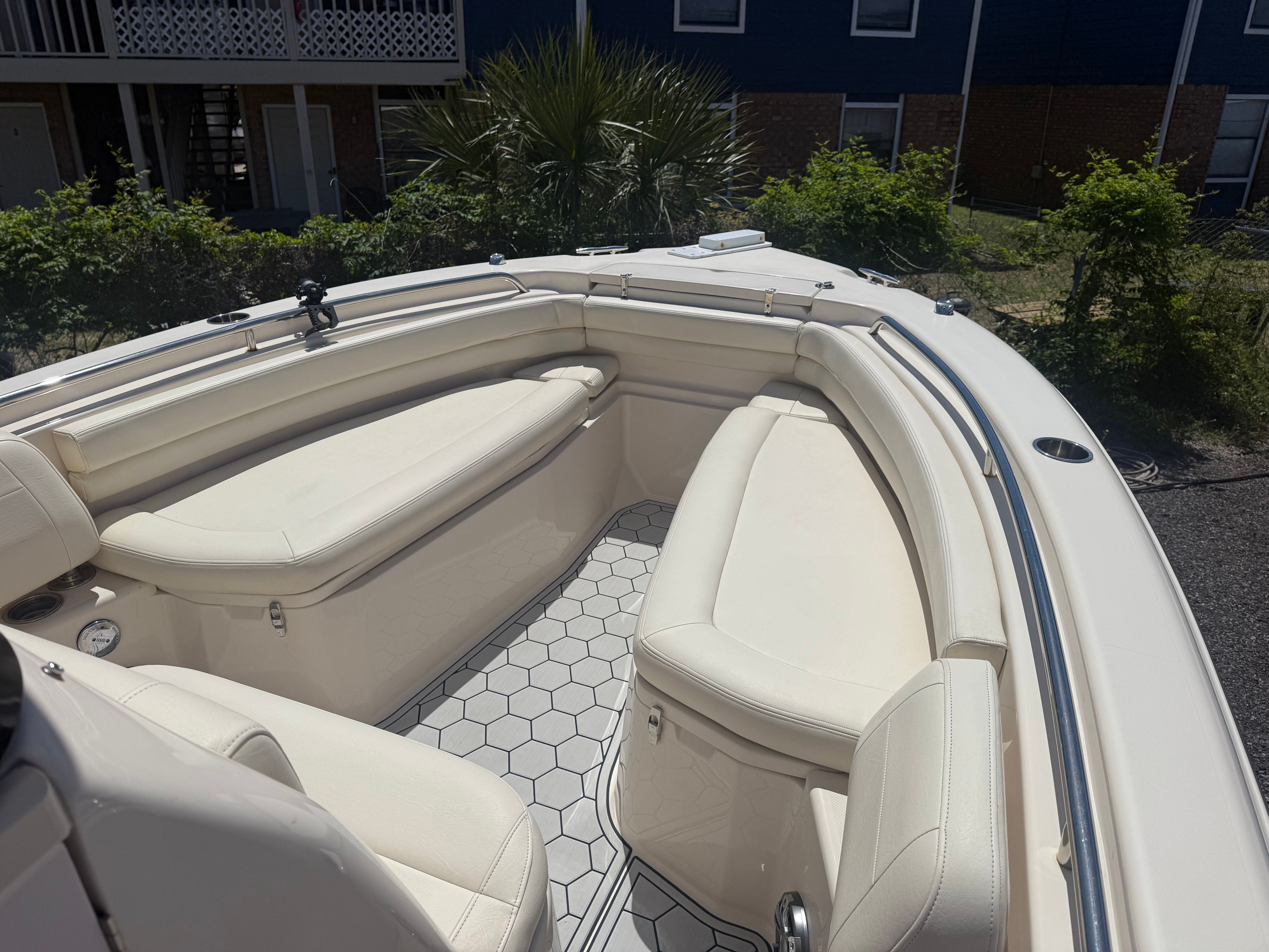This center console boat for sale is designed with practicality in mind. The Fisherman 257’s layout maximizes usable space, offering plenty of storage for gear, tackle, and personal items. The center console design makes docking and maneuvering a breeze, even for less experienced captains. Its manageable 25-foot length means you can easily trailer the boat to your favorite launch sites or store it when not in use.Fuel efficiency is another highlight, thanks to the modern twin-engine setup that delivers power without sacrificing economy. Whether you’re planning a long day offshore or a quick trip to a nearby island, you’ll appreciate the balance of performance and efficiency that this Grady-White boat provides. Maintenance is straightforward, and the boat’s durable construction ensures it will remain a reliable companion for years to come.