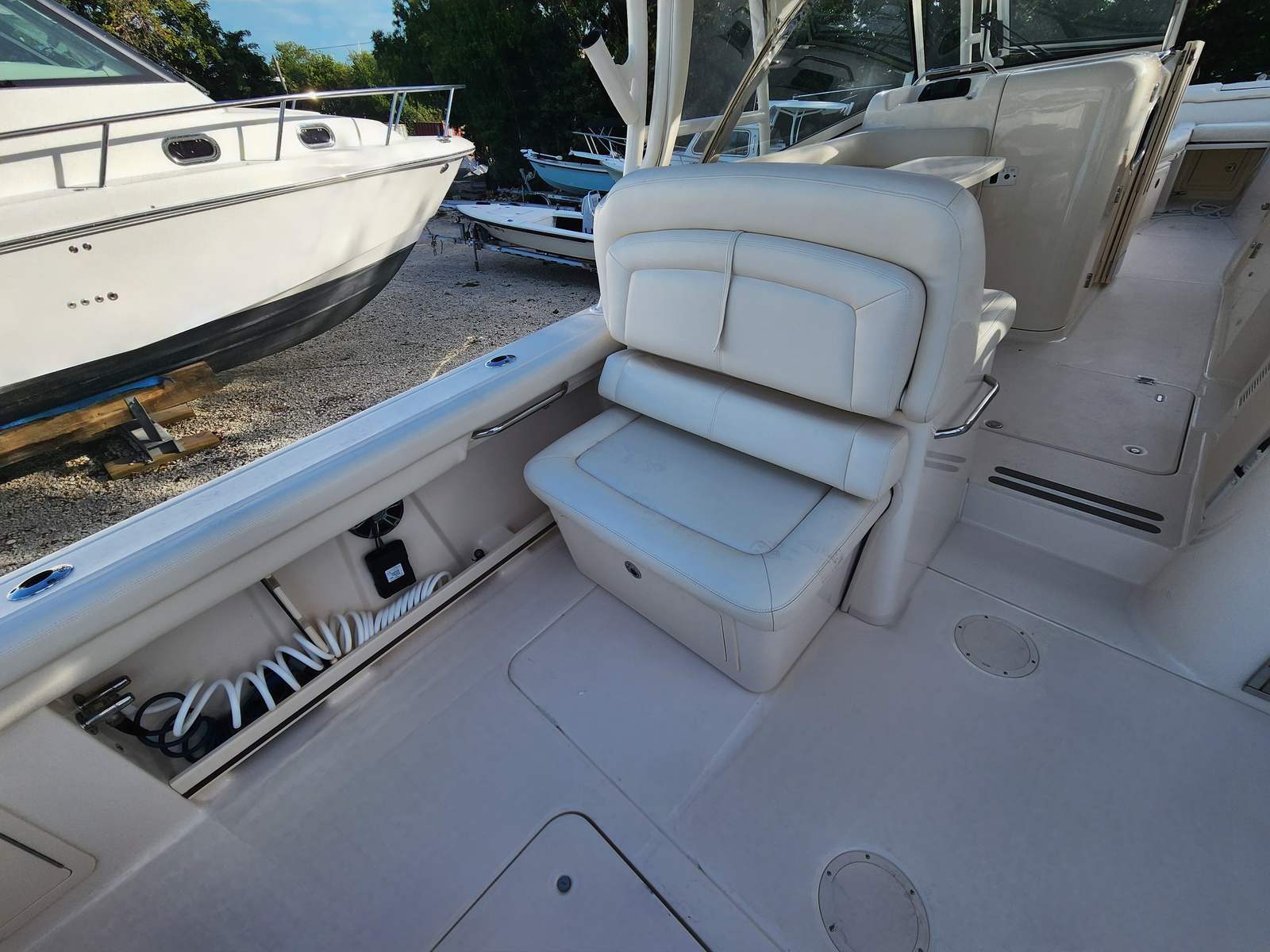Powering the Grady-White Freedom 335 are two high-performance engines, delivering a combined 850 horsepower. With 480 engine hours, these motors have been well maintained and are ready to provide exhilarating speed and smooth handling. The dual-engine setup ensures optimal maneuverability and stability, whether you’re navigating open waters or docking at your favorite marina. The impressive horsepower translates to quick acceleration and reliable cruising, allowing you to reach your destinations with ease and confidence. This Dual Console boat for sale is engineered for both power and efficiency, making every outing a pleasure.