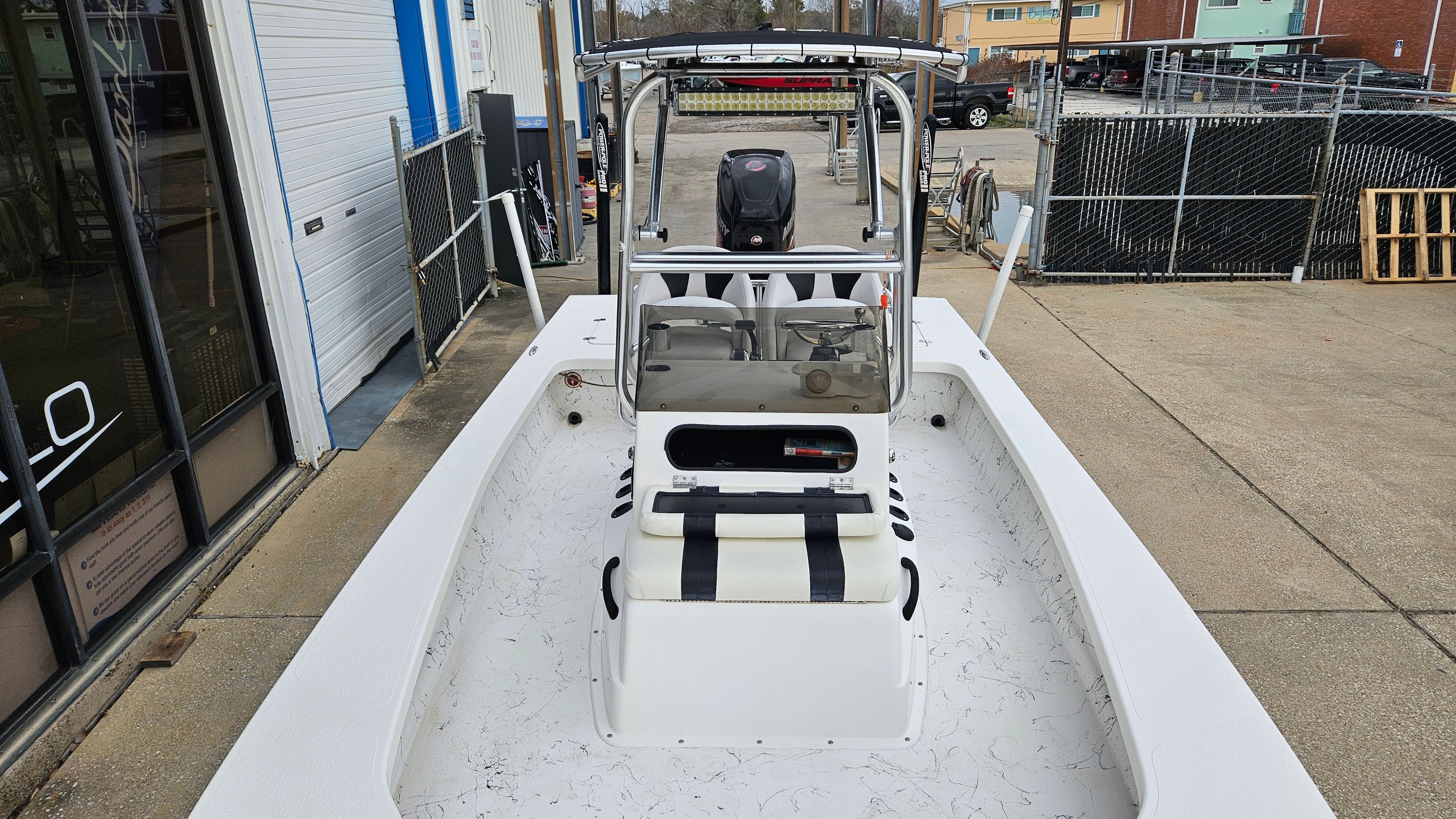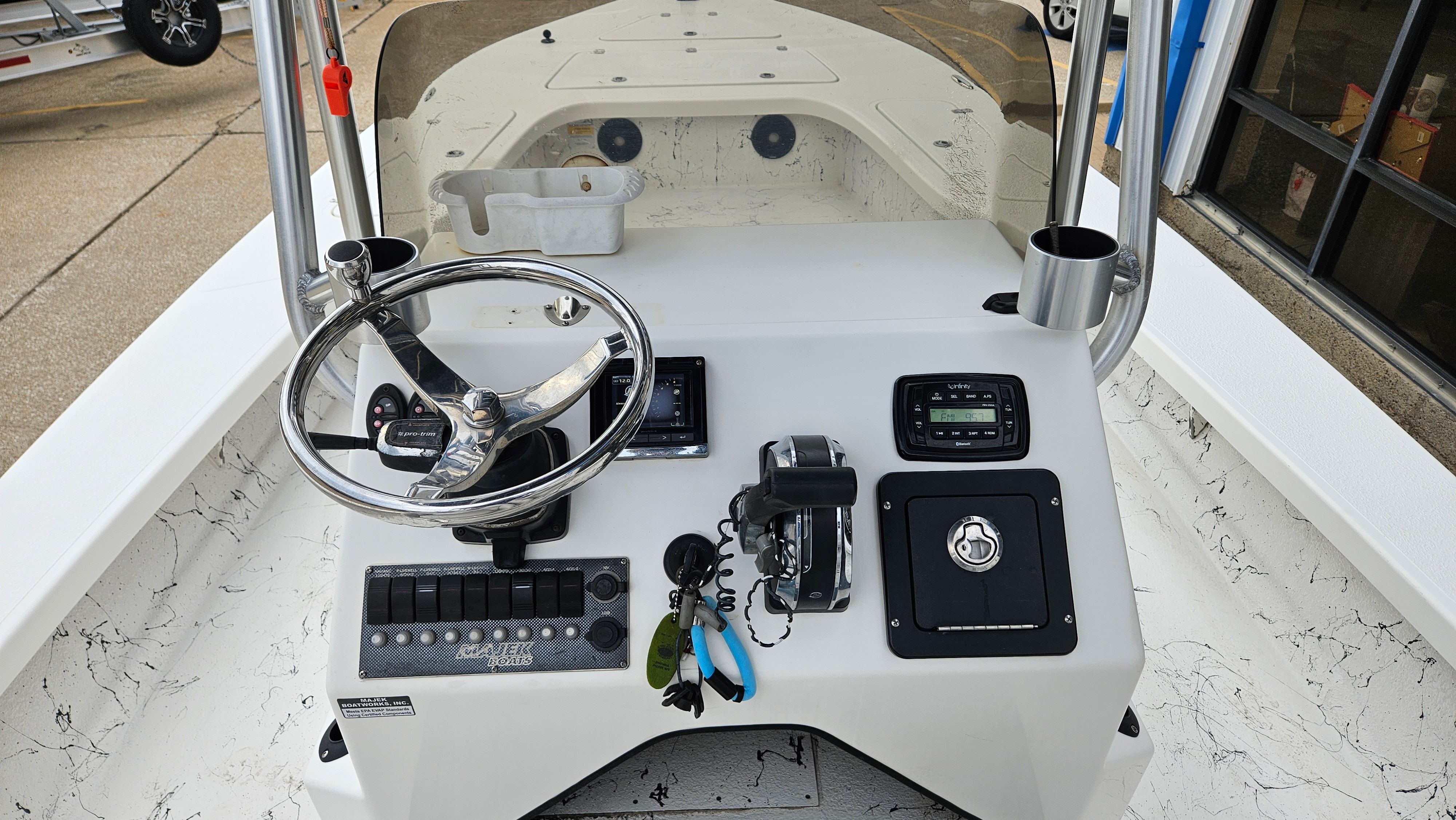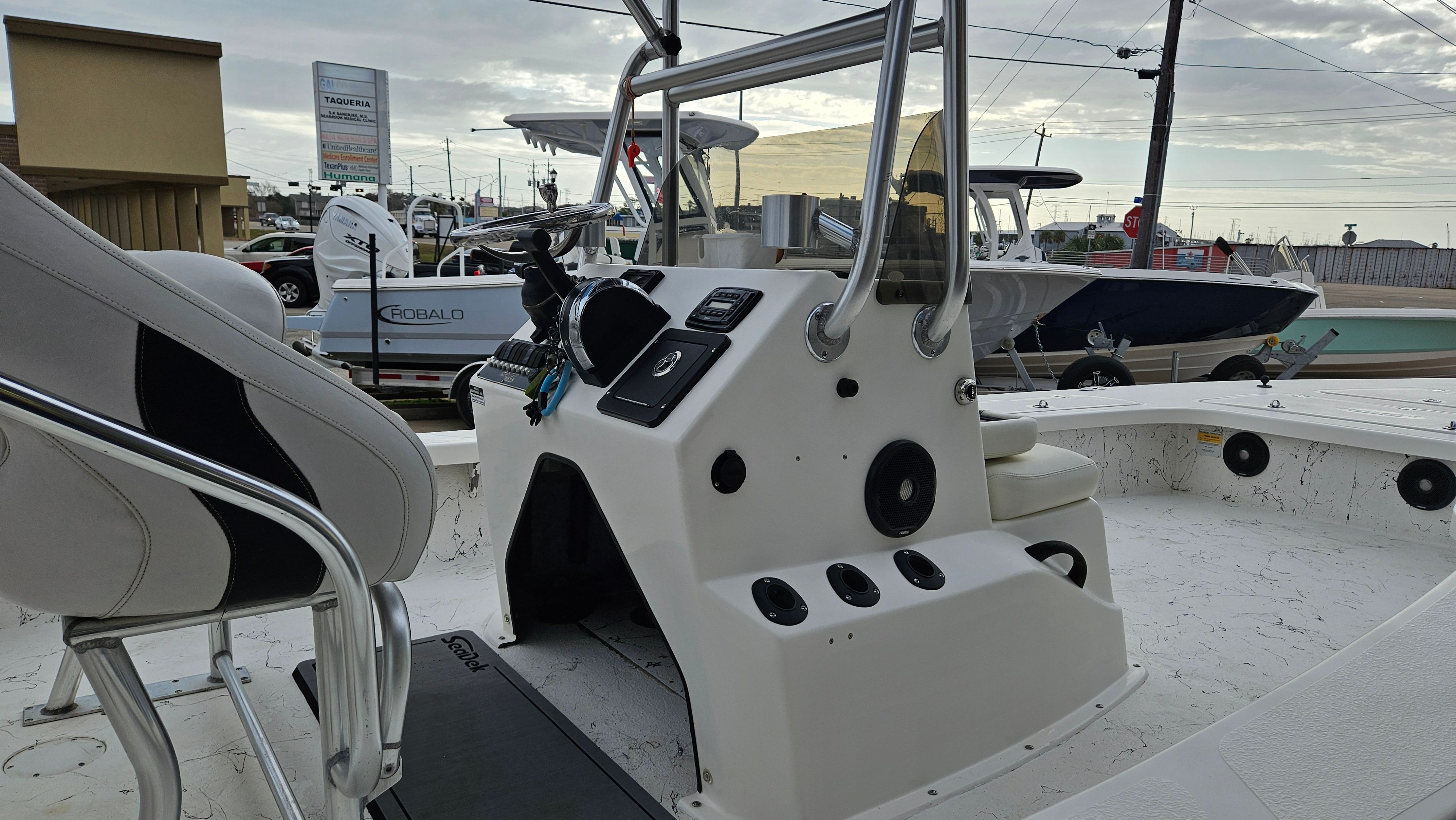 This Majek boat for sale comes loaded with special features that enhance both functionality and enjoyment. The included tandem axle trailer makes transporting your Bay Boat simple and secure, whether you’re heading to your favorite fishing spot or exploring new waterways. The sturdy T-Top offers shade and protection from the elements, allowing you to stay comfortable during long days on the water. Twin Power Pole anchors provide superior stability when you’re fishing or relaxing, letting you hold your position with ease. The integrated stereo system sets the mood for fun and relaxation, while the jackplate adds versatility for navigating shallow or deep waters. Every feature is thoughtfully designed to maximize your boating experience, ensuring you have everything you need for adventure and leisure.