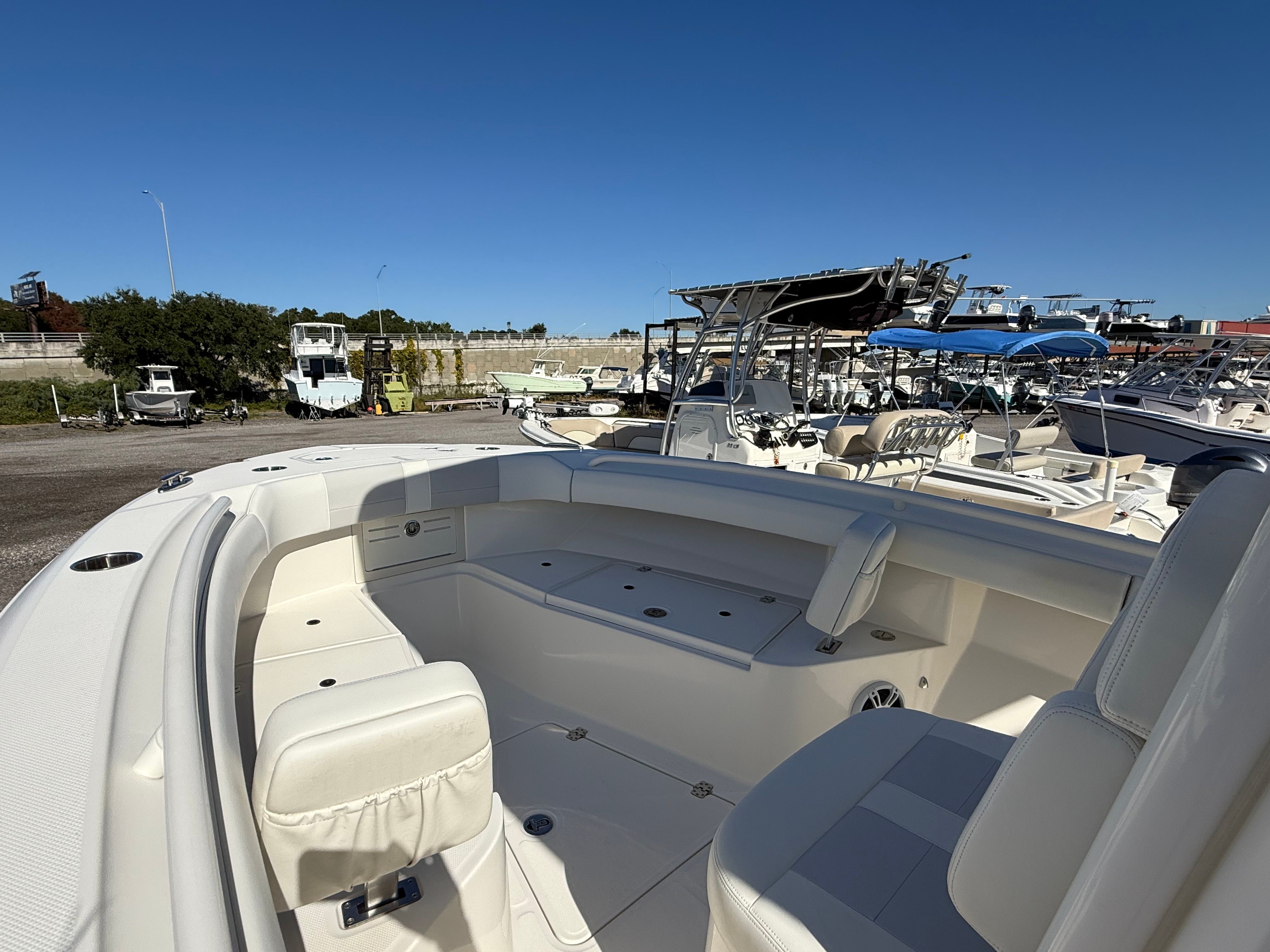 anglers or entertain a full crew. Forward seating includes cushioned lounges with storage underneath, while the