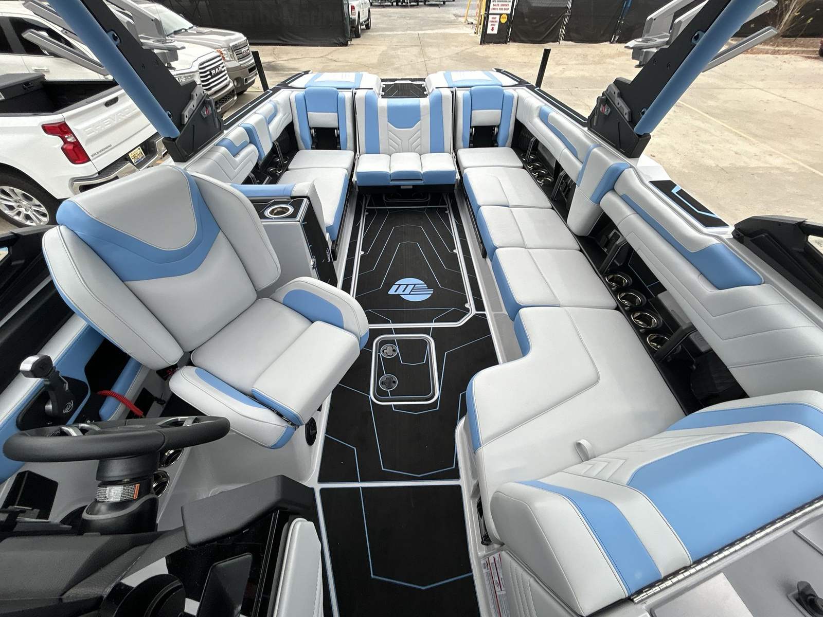 Step aboard the Wakesetter 25 LSV and discover a host of special features designed to enhance your boating experience. The MaxPivot Wakeview Bench with Integrated Table offers versatile seating and a convenient space for snacks or gear, perfect for socializing between sessions. The advanced Battery Set Up - Option 3 ensures reliable power management, keeping all your electronics running smoothly. The Power Lift Helm Seat and Swivel provide ergonomic comfort and optimal visibility for the captain, while the Soft-Grip Flooring adds safety and style underfoot.Tech-savvy boaters will appreciate the Sport Dash with Rotary Joystick and Wireless Charging Stations, making it easy to control your ride and keep devices powered up. The GL Flip Bimini with Surf Storage offers shade and convenient board storage, while the Max-Relax Sundeck Loungers invite you to unwind in luxury. The Starboard Lower Rack - PTM Clampforce 30 secures your gear with ease, and the Ebony-Speakers - Wet Sounds Rev 12 with Horn deliver crisp, powerful sound for your favorite tunes. Every detail is thoughtfully designed to maximize comfort, convenience, and fun.