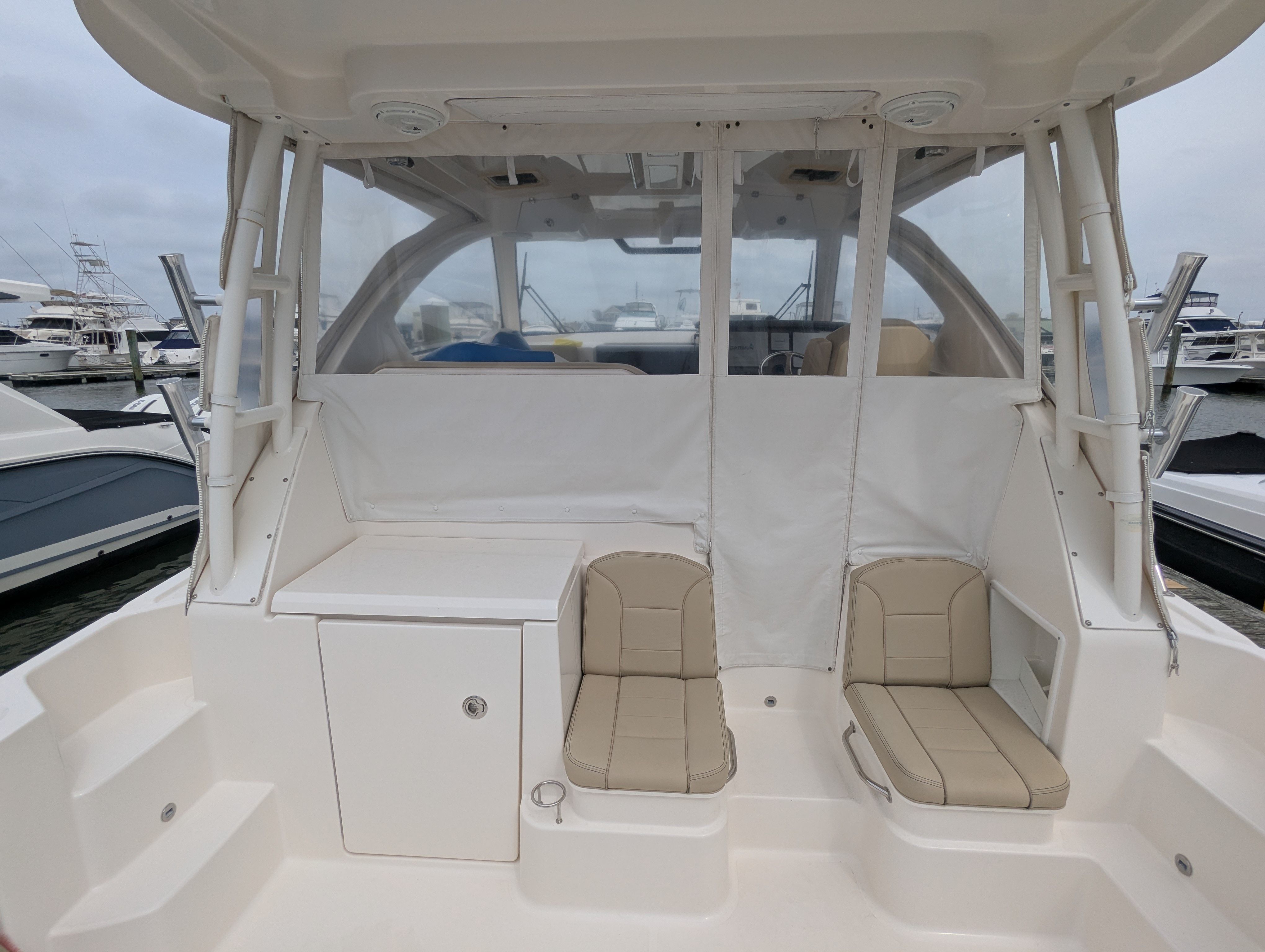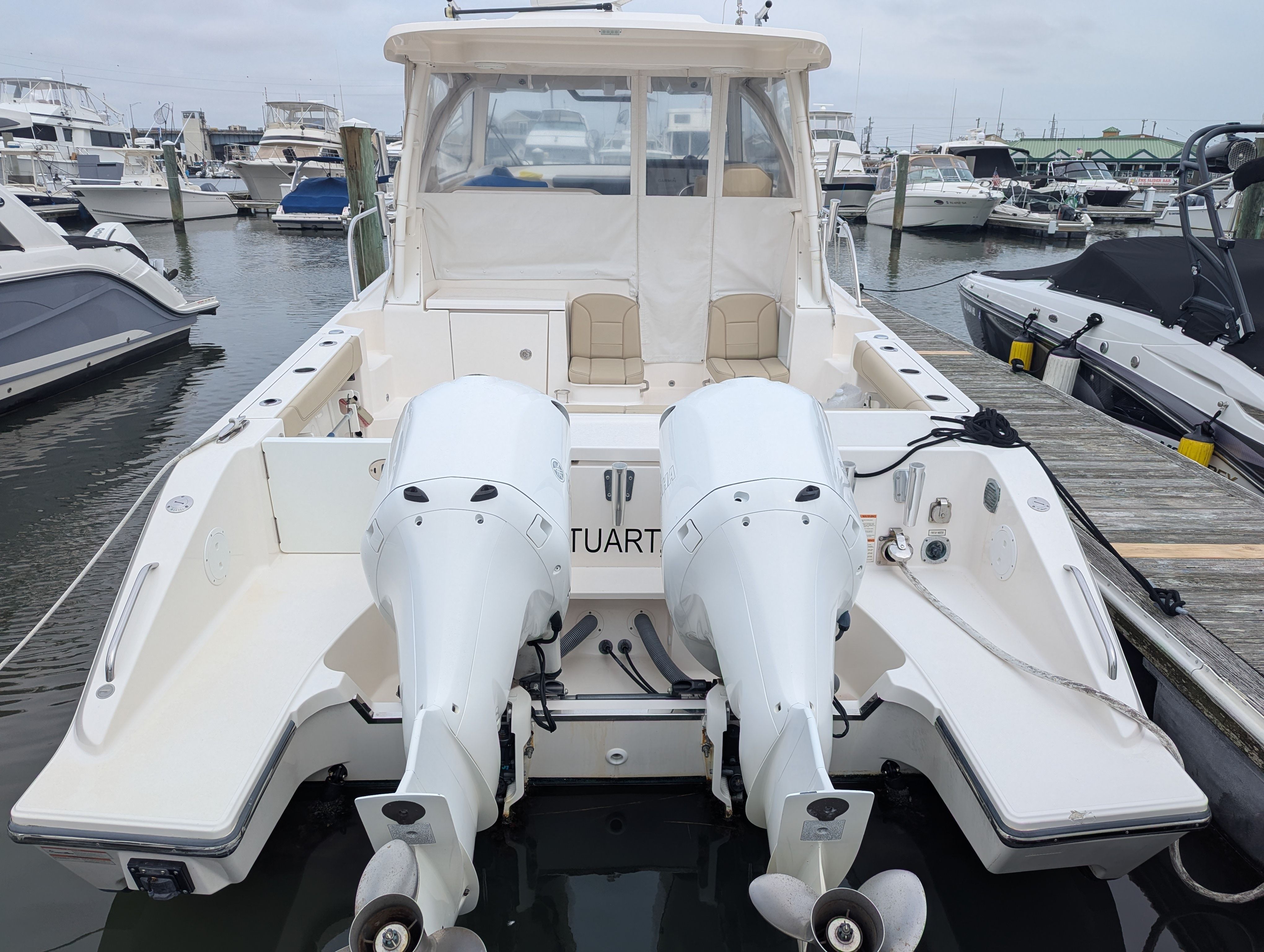 Powering the Pursuit OS 355 are two robust engines, delivering a combined 700 horsepower. With only 201 engine hours, these engines have plenty of life left, promising reliable performance and exhilarating speed. Whether you’re cruising along the coastline, heading out for a weekend getaway, or exploring new waters, the OS 355’s twin-engine setup ensures smooth handling, quick acceleration, and impressive fuel efficiency.The dual engines not only provide ample power for a variety of activities but also enhance maneuverability and safety. Navigating tight marinas or docking becomes a breeze, while the horsepower allows you to reach your destination swiftly and comfortably. For those who appreciate the thrill of boating, the Pursuit OS 355’s performance metrics make it a standout choice among cruiser boats for sale.
