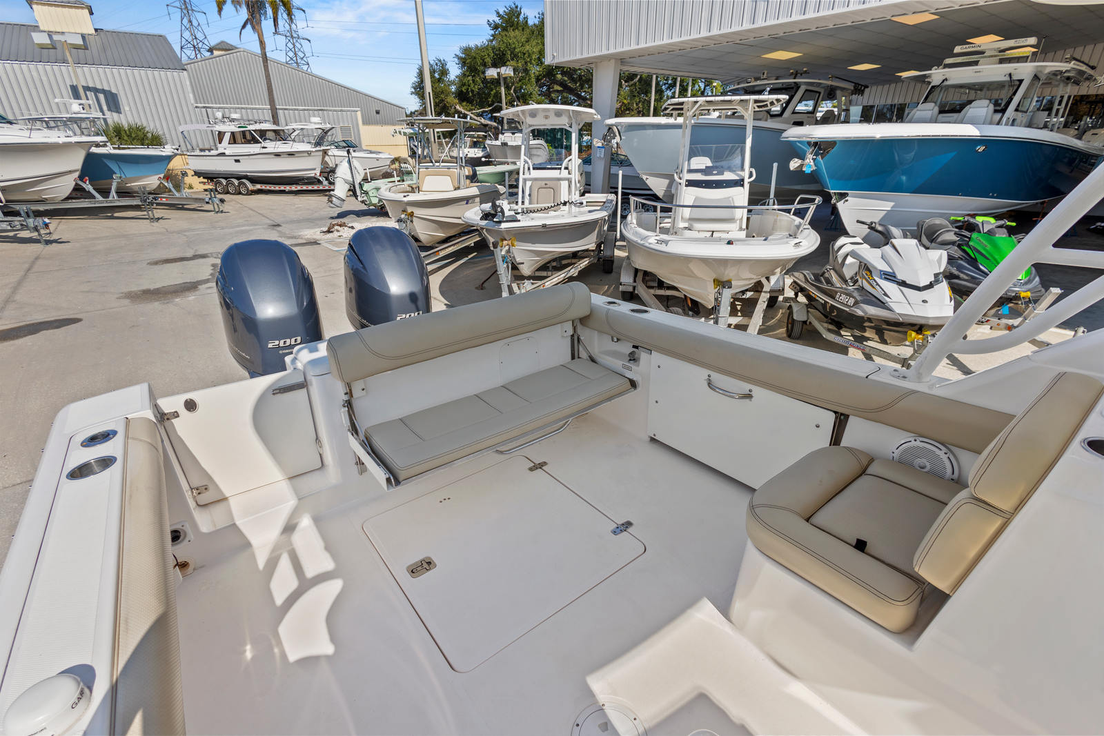 The Yamaha digital gauges, electronic throttle and shift (DES), and integrated hydraulic steering provide a responsive and intuitive helm experience. Whether docking in tight quarters or running in choppy conditions, this setup offers the precision and control you expect from a premium dual-console vessel.