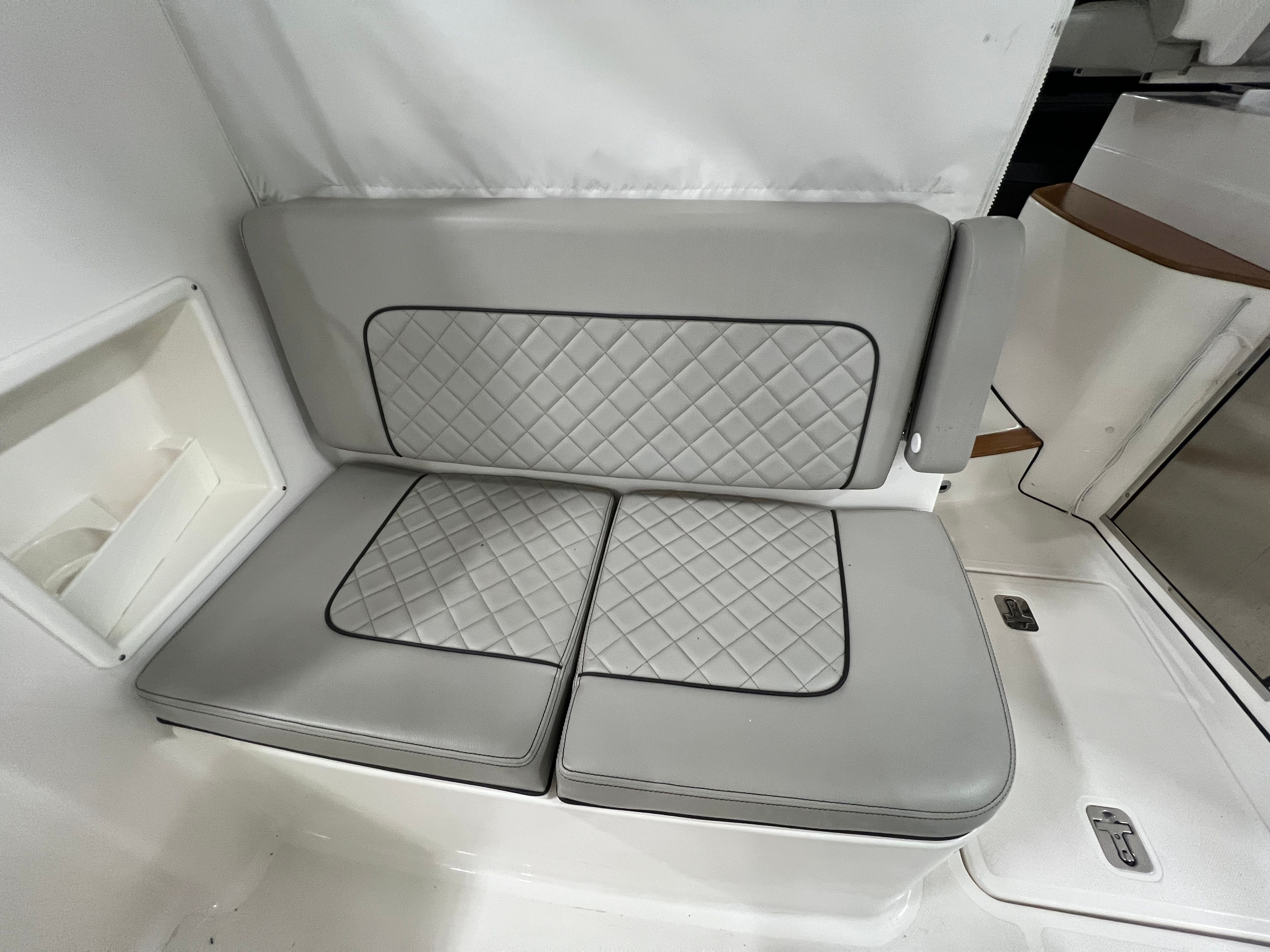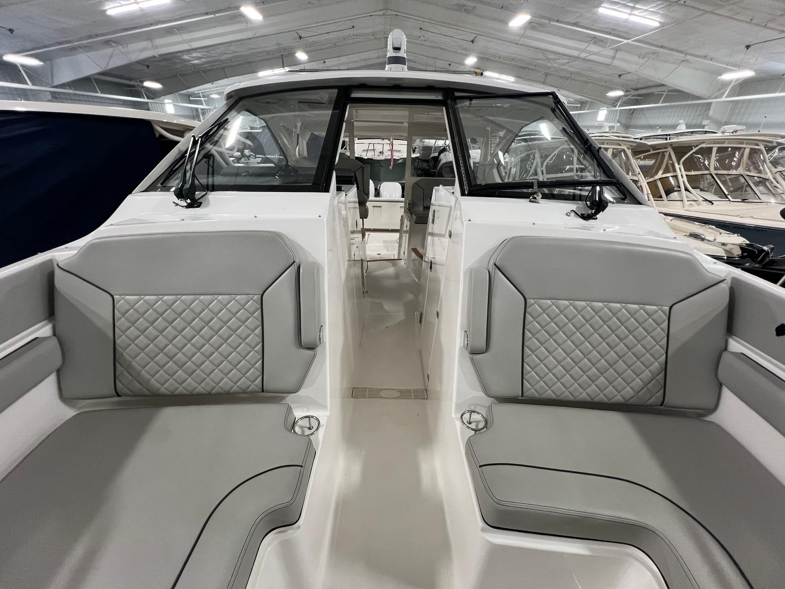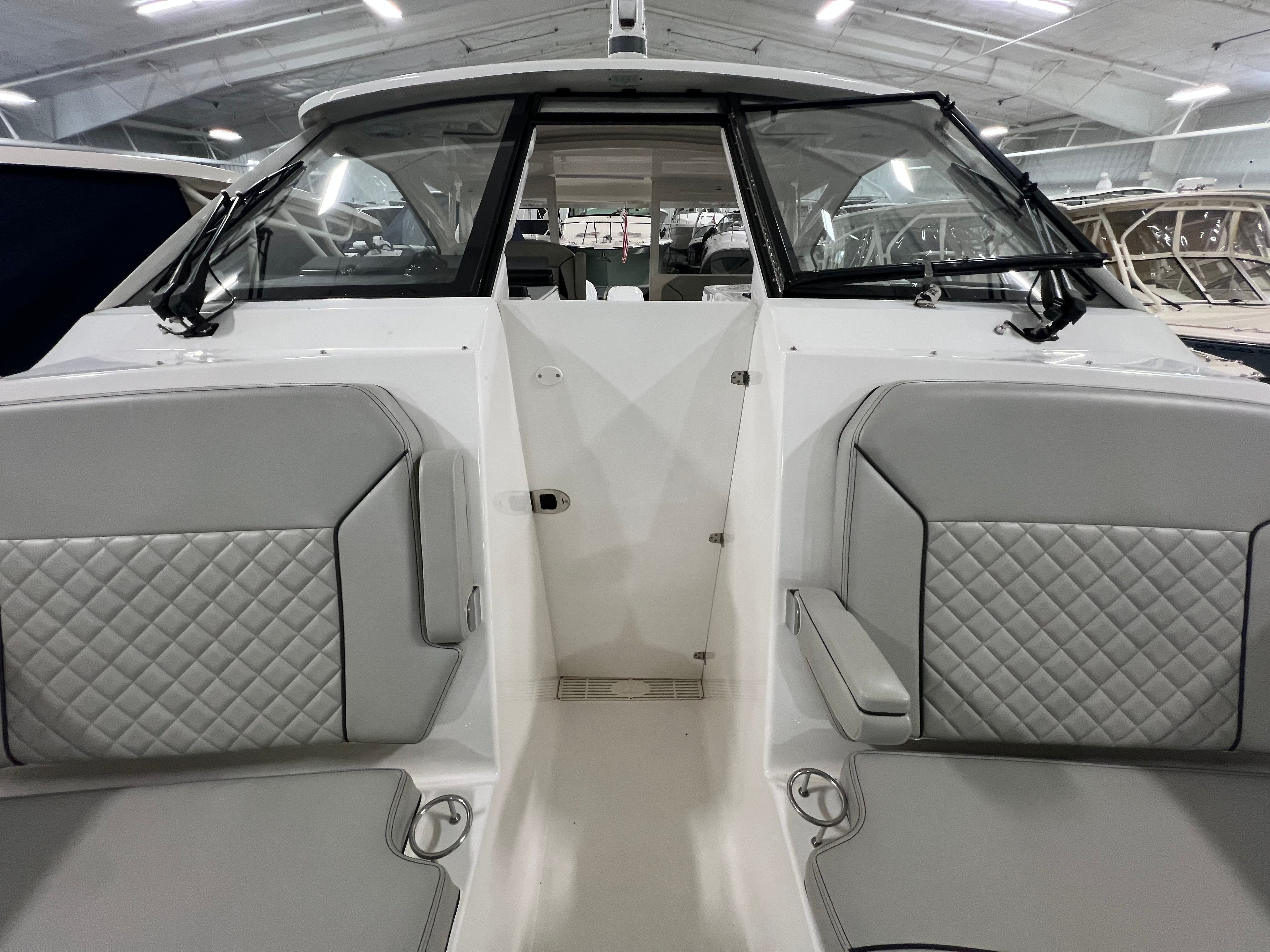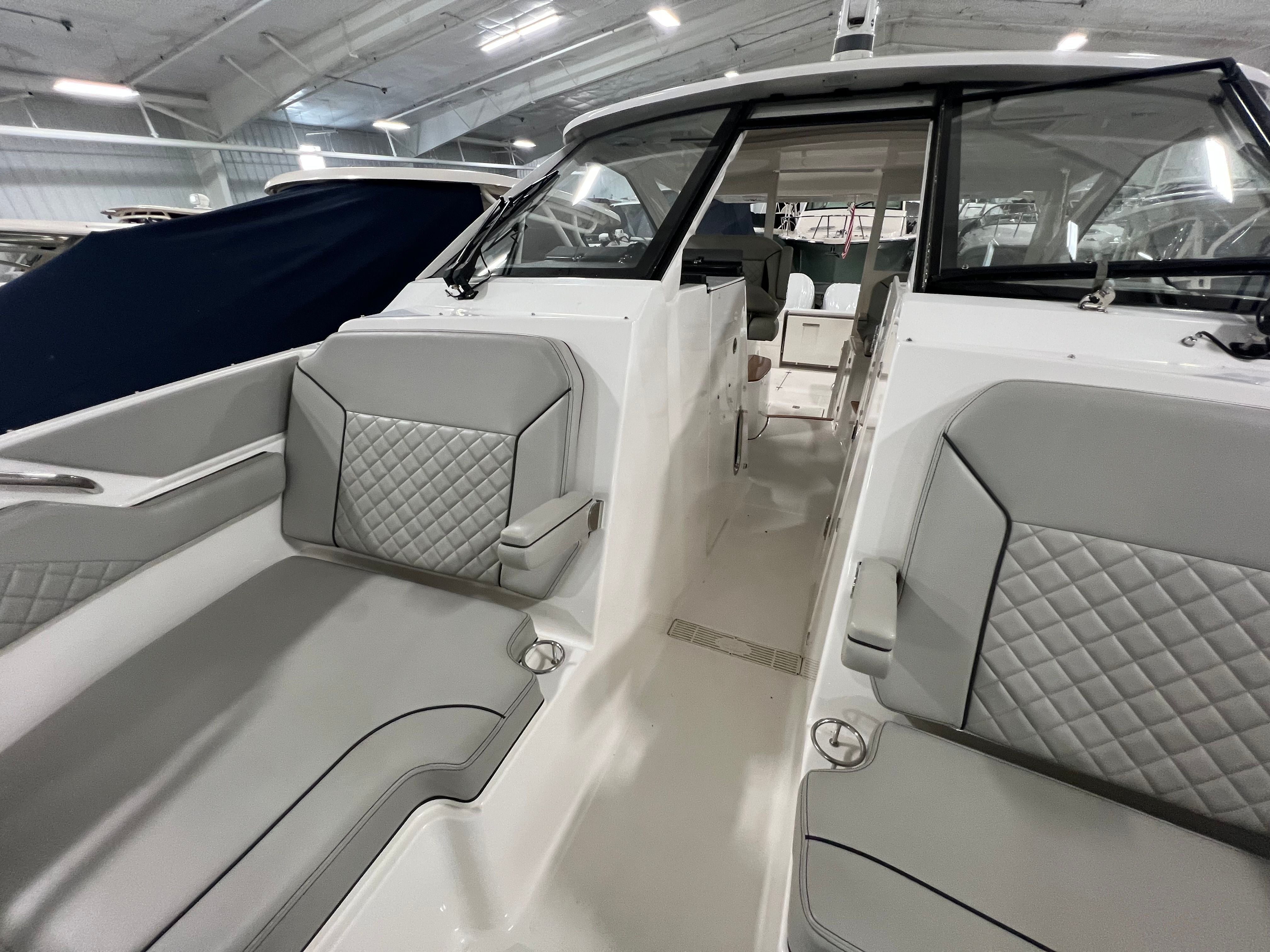 The Pursuit DC 365 is loaded with features that enhance comfort, convenience, and enjoyment on every outing. With six onboard batteries and a dedicated battery charger, you can count on reliable power for all your electronics and accessories. The aft bench seat provides a comfortable spot for guests to relax and take in the views, while the bow seating area is perfect for sunbathing or socializing at anchor.For those who love to entertain, the cockpit grill and wet bar transform the deck into a floating kitchen, allowing you to prepare and serve meals with ease. The double wide helm seat ensures that both captain and companion can enjoy the ride in comfort, while the hard top offers protection from the elements, extending your boating season and keeping everyone shaded on sunny days. Cockpit coaming bolsters add an extra layer of comfort and safety, especially during active pursuits like fishing or water sports.