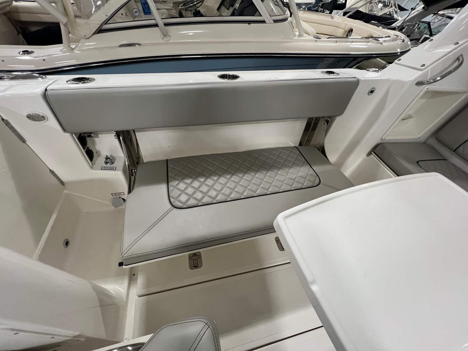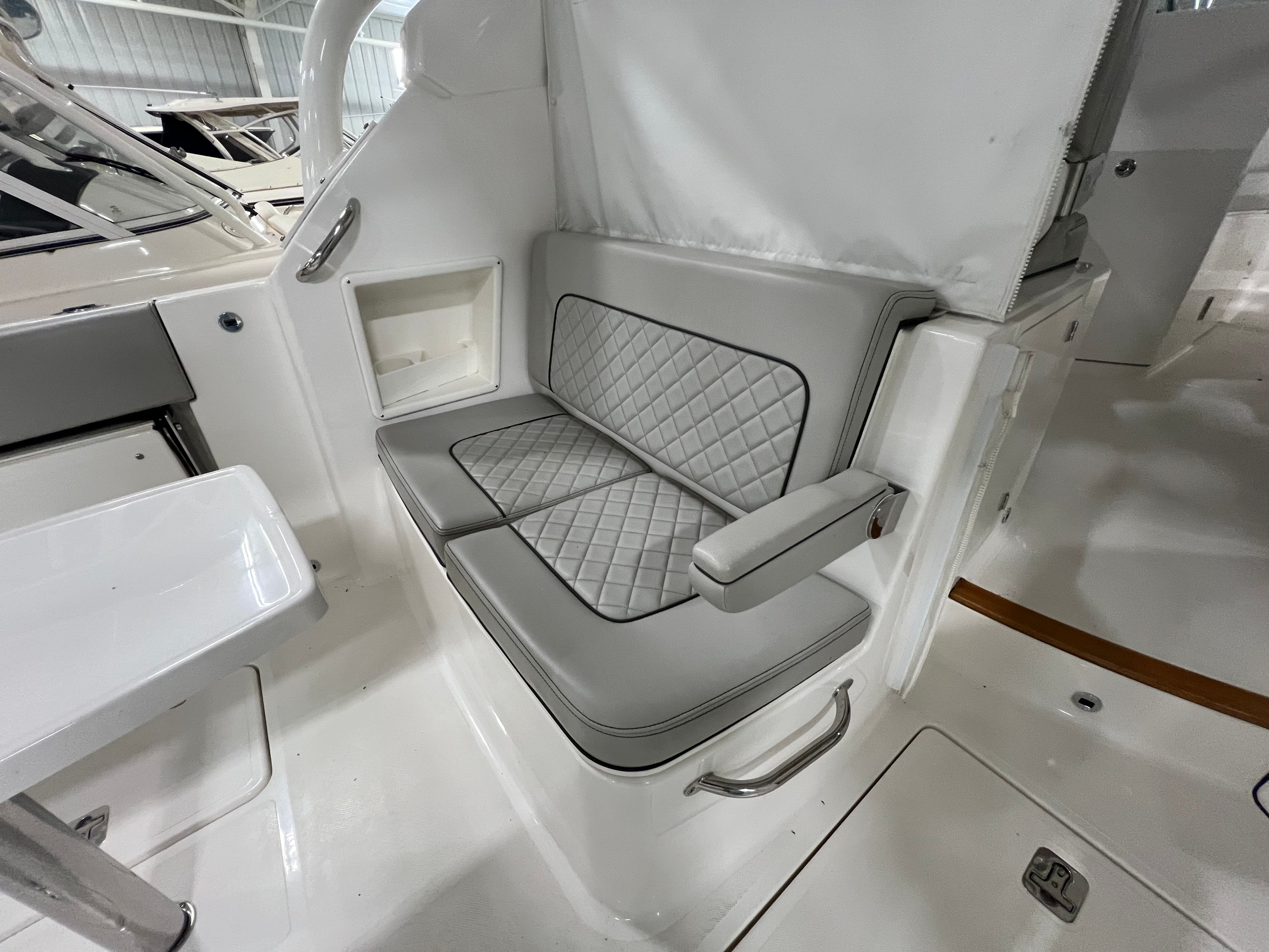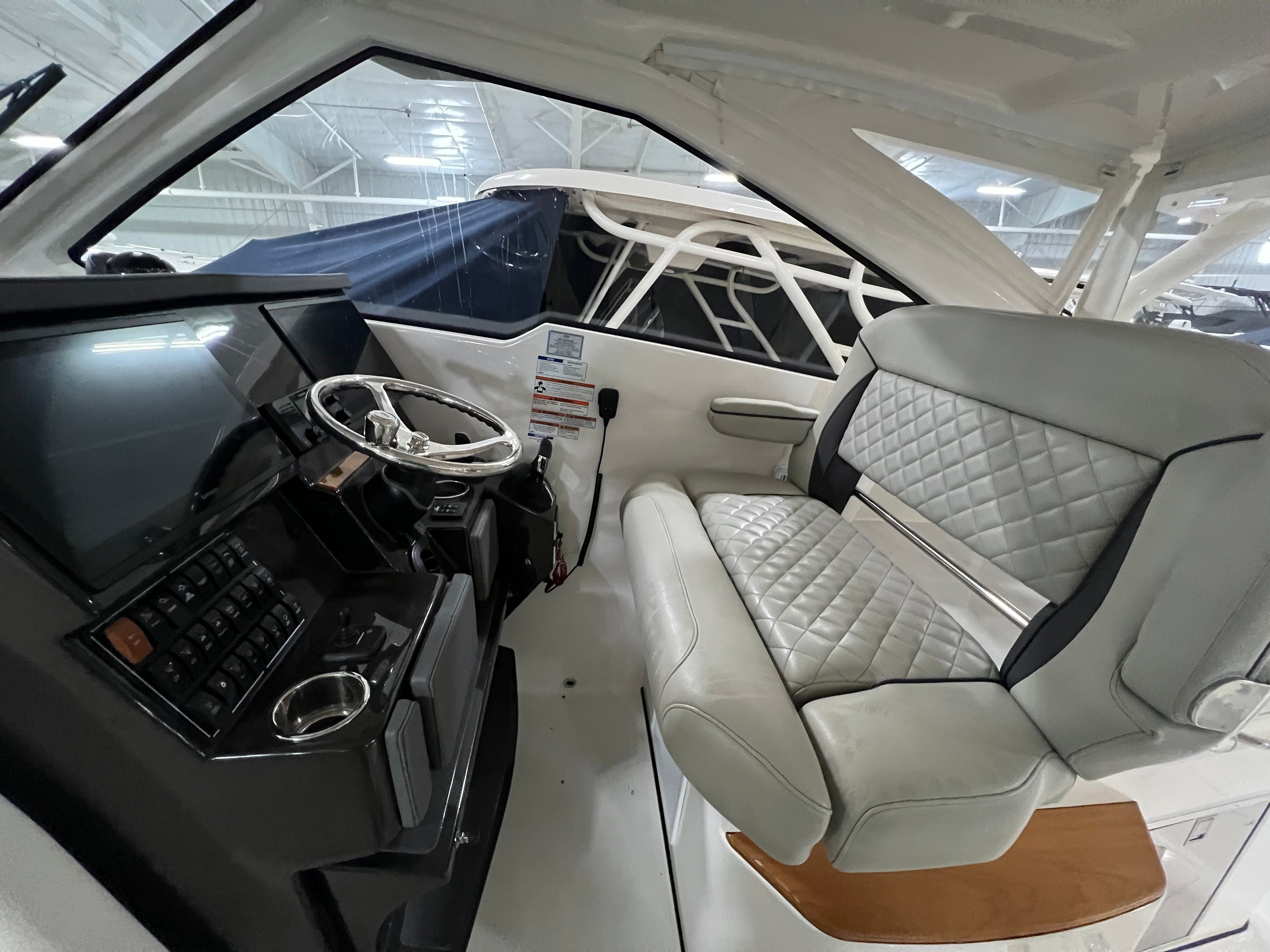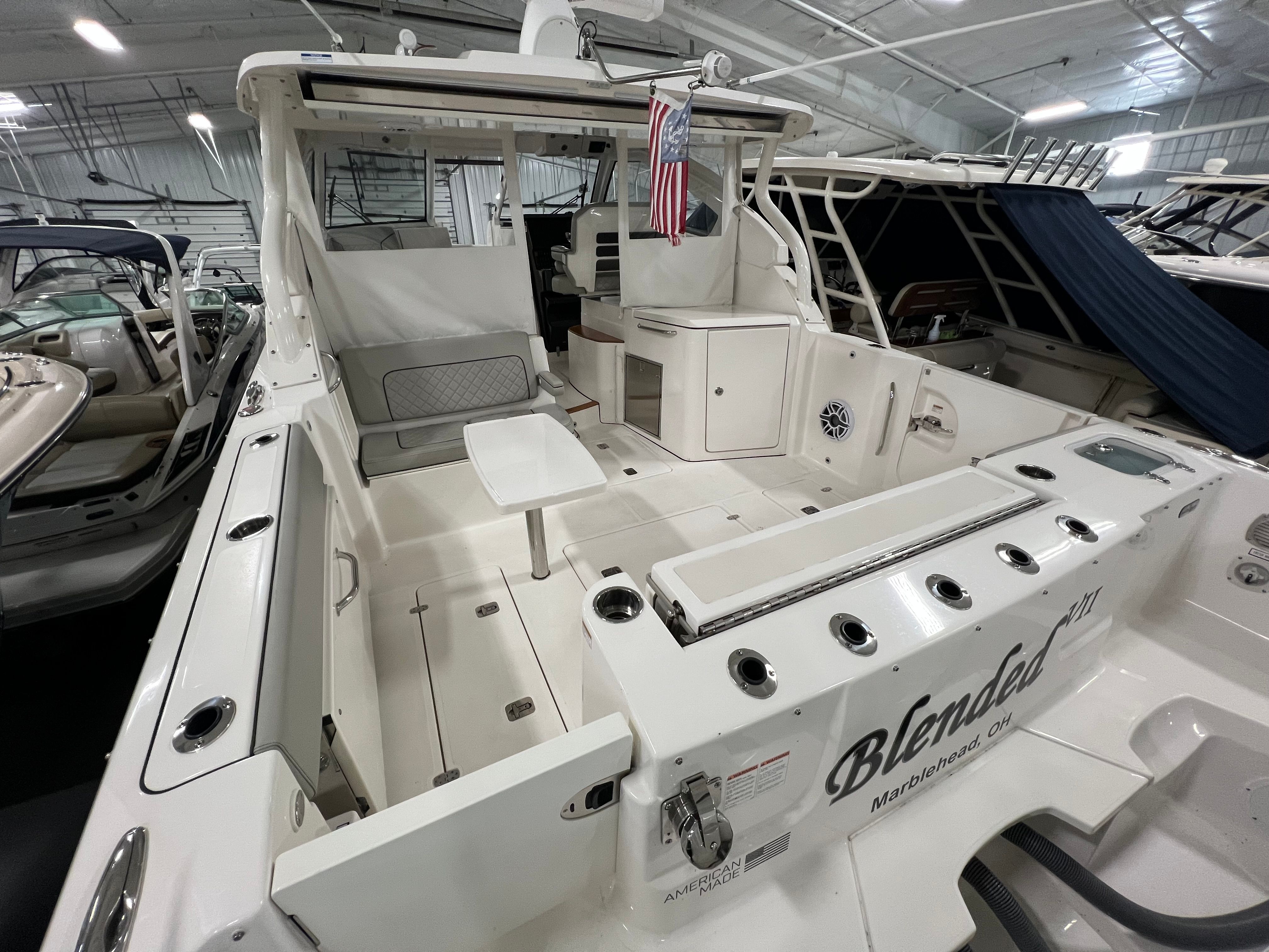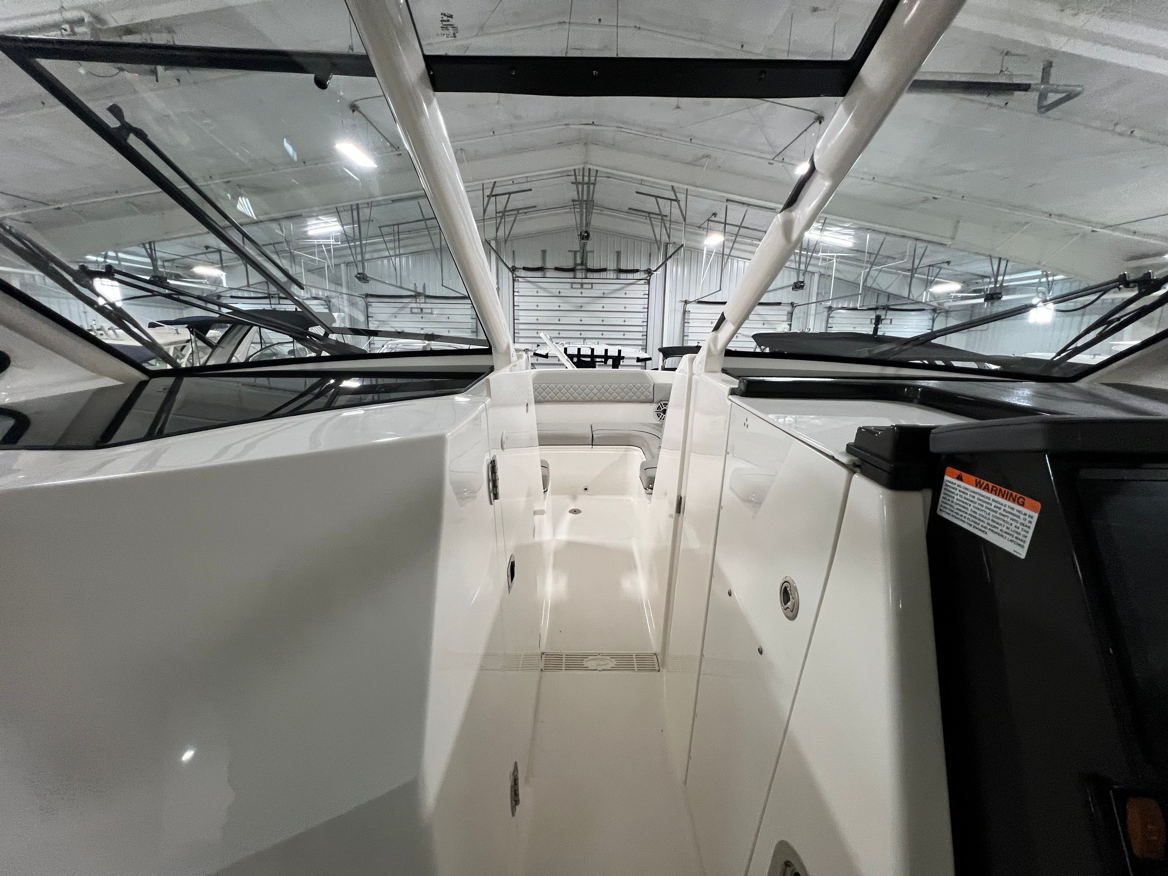 The Pursuit DC 365 is loaded with features that enhance comfort, convenience, and enjoyment on every outing. With six onboard batteries and a dedicated battery charger, you can count on reliable power for all your electronics and accessories. The aft bench seat provides a comfortable spot for guests to relax and take in the views, while the bow seating area is perfect for sunbathing or socializing at anchor.For those who love to entertain, the cockpit grill and wet bar transform the deck into a floating kitchen, allowing you to prepare and serve meals with ease. The double wide helm seat ensures that both captain and companion can enjoy the ride in comfort, while the hard top offers protection from the elements, extending your boating season and keeping everyone shaded on sunny days. Cockpit coaming bolsters add an extra layer of comfort and safety, especially during active pursuits like fishing or water sports.