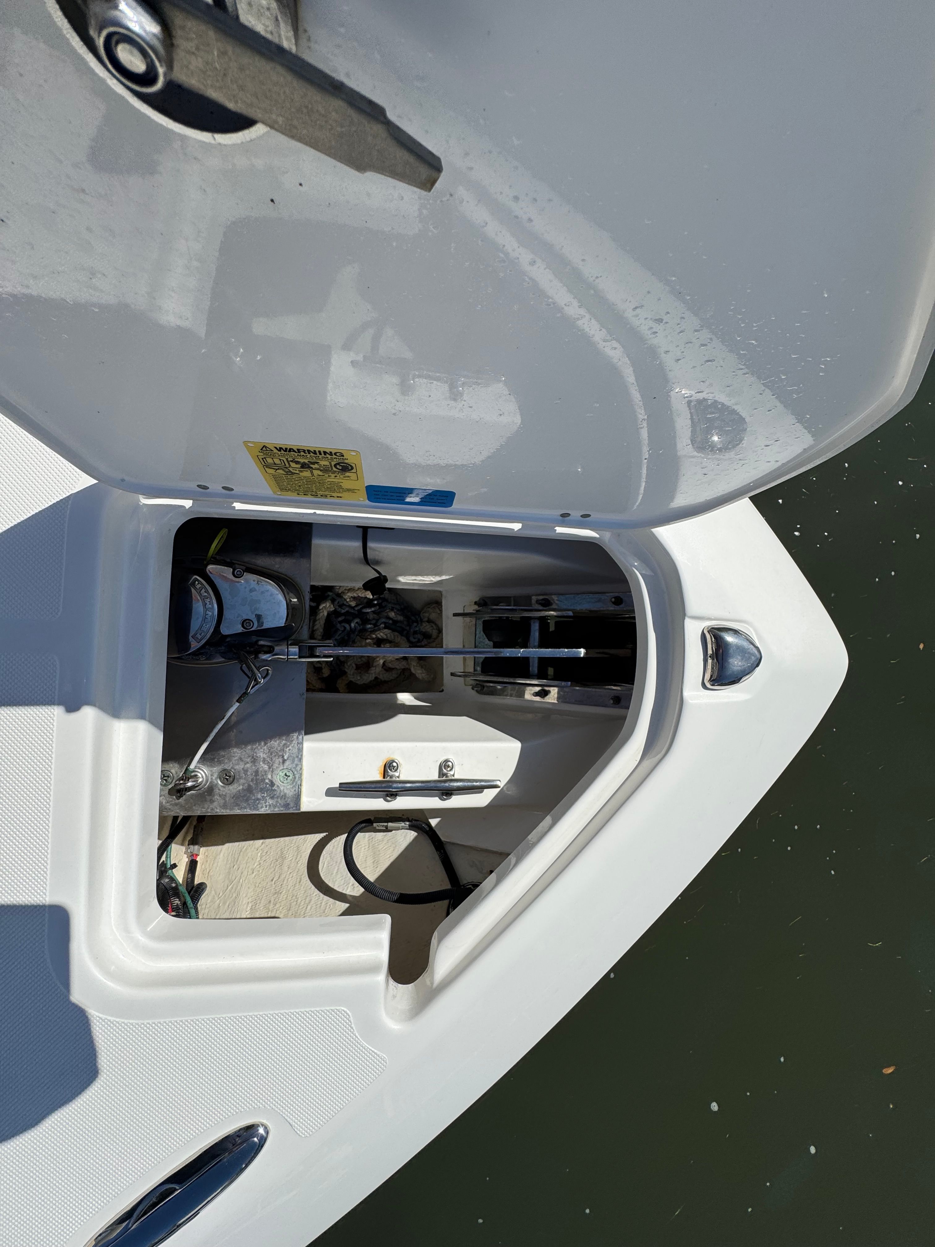 - Flush Mounted Integral Anchor Locker (self-draining) with Fiberglass Lid including: 316L Stainless Steel through Stem Anchor Roller with 8" Mooring Cleat, Chain Binder, 14lb Galvanized Plow Style Anchor and 150’ Rode (1/2" 8 Plait including 10’ of ¼" G4 Chain)