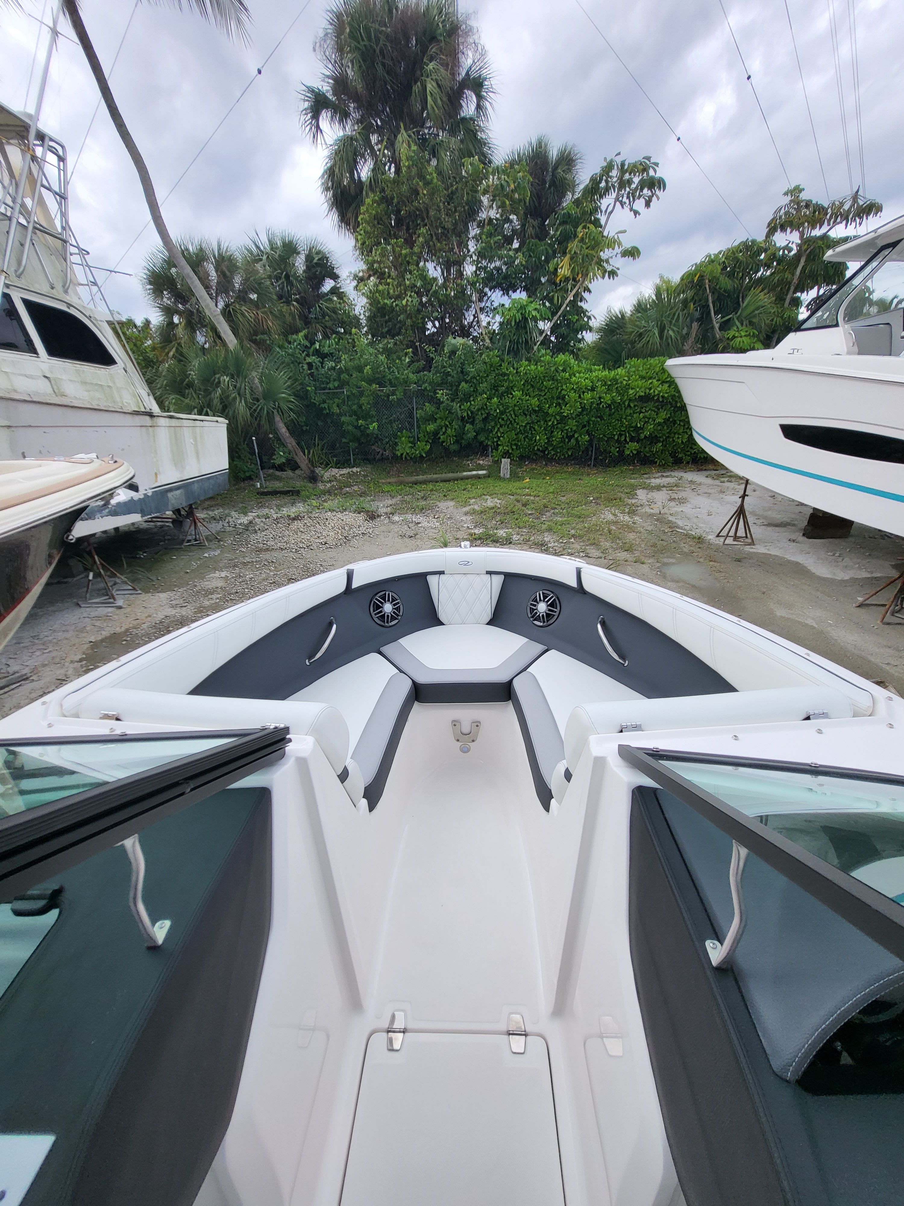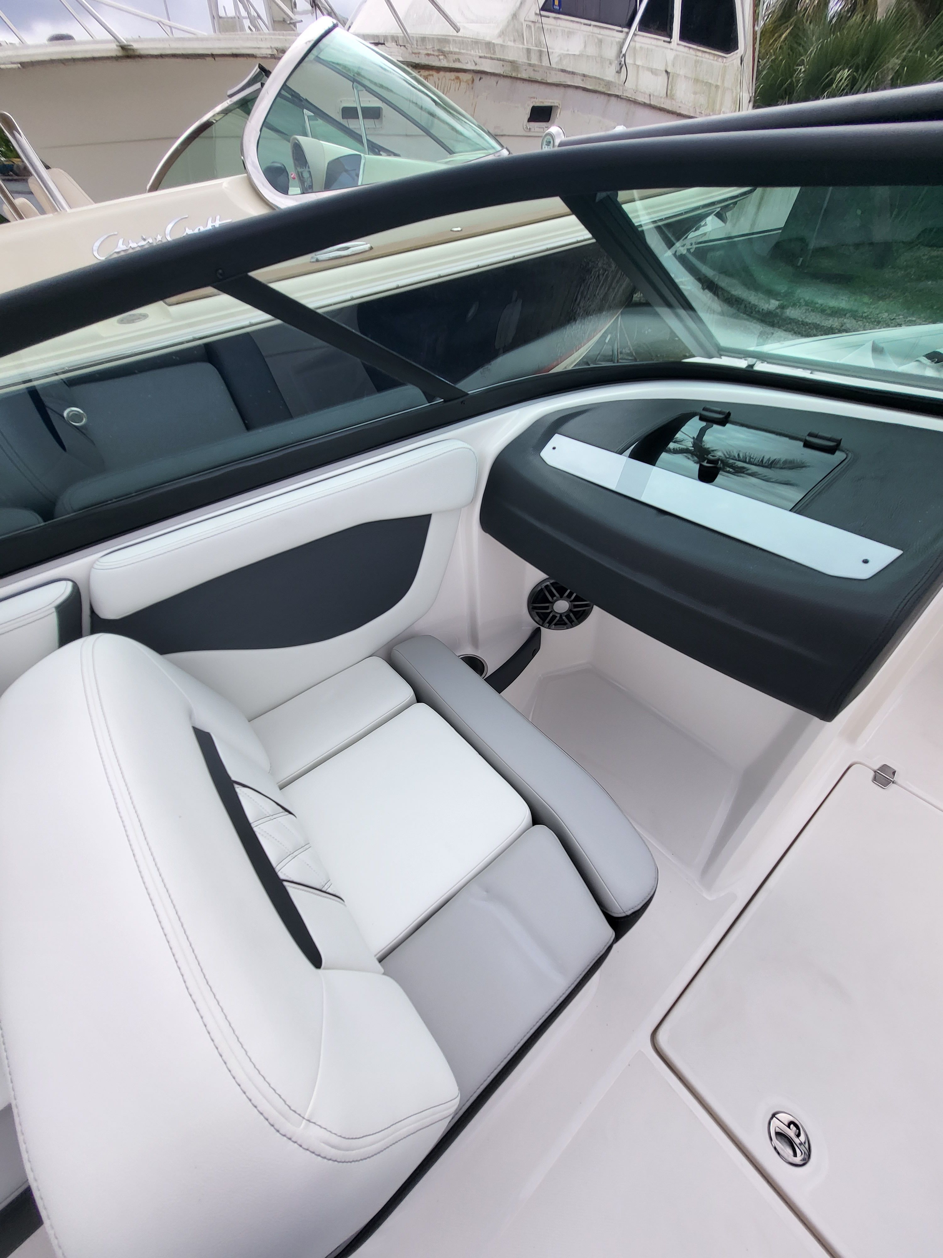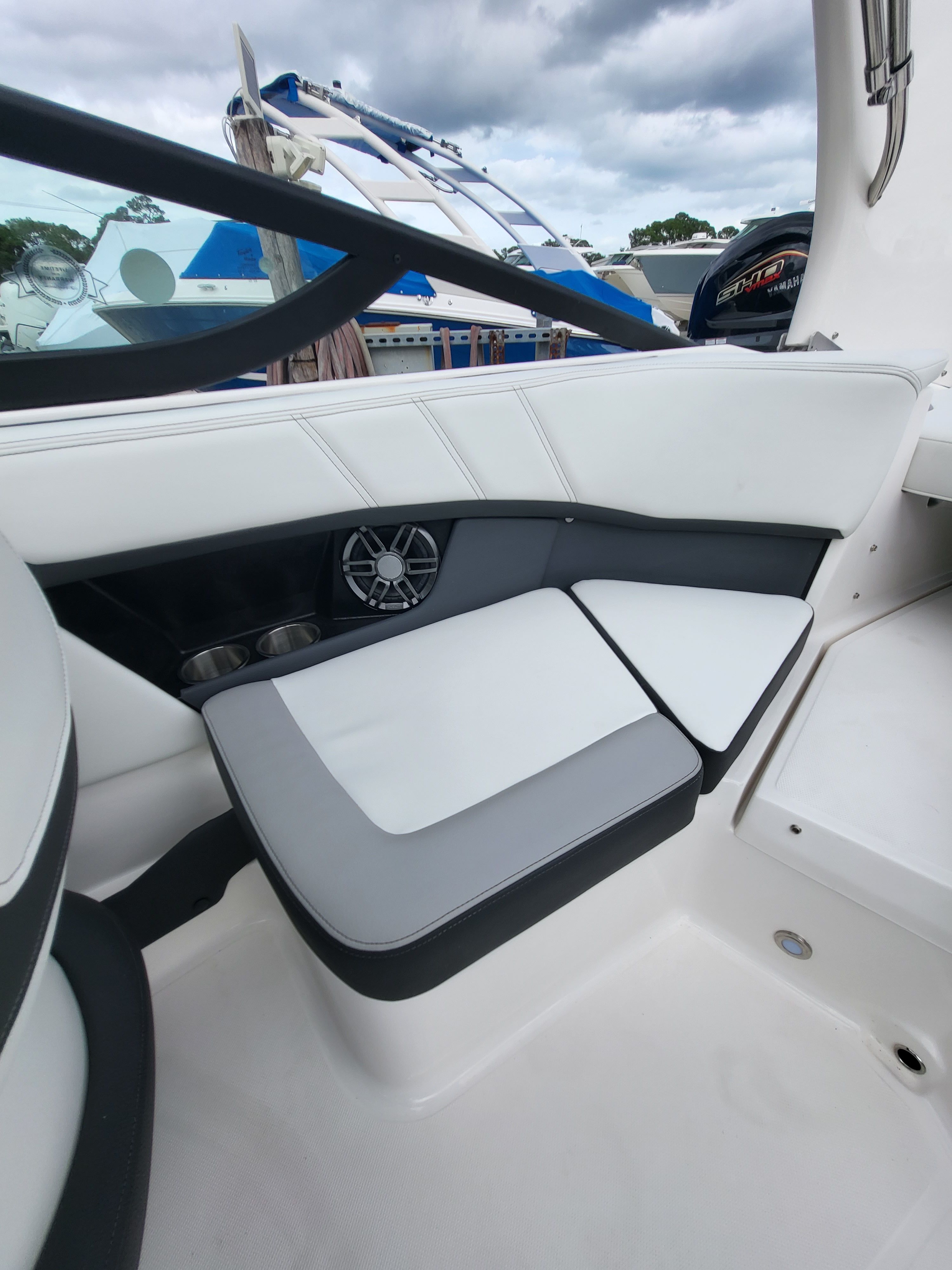 This bowrider boat for sale is loaded with features that enhance both functionality and fun. The Newport Blue bootstripe and Graphite hull color create a striking visual impression, while the PowerTower in white adds a touch of modern flair and practical utility for watersports enthusiasts. The Water Sport Tow Pylon is perfect for towing wakeboarders, skiers, or inflatable tubes, making every outing an adventure.Inside the spacious cockpit, you will find a composite cockpit table that provides a convenient spot for snacks, drinks, or games, ensuring everyone stays comfortable and entertained. The Bow Filler Cushion adds versatility to the bow seating area, allowing you to convert it into a sun pad or extra lounging space. The Transom Shower & Pressure Water Package offers a quick rinse after swimming or watersports, keeping the deck clean and comfortable.The Stainless Steel Upgrade Package elevates the boat’s durability and style, while the Stereo High Performance Package delivers crystal-clear sound, setting the perfect soundtrack for your day on the water. Every detail is designed to maximize enjoyment and convenience, making the Regal 21 OBX a standout choice among bowrider boats for sale.
