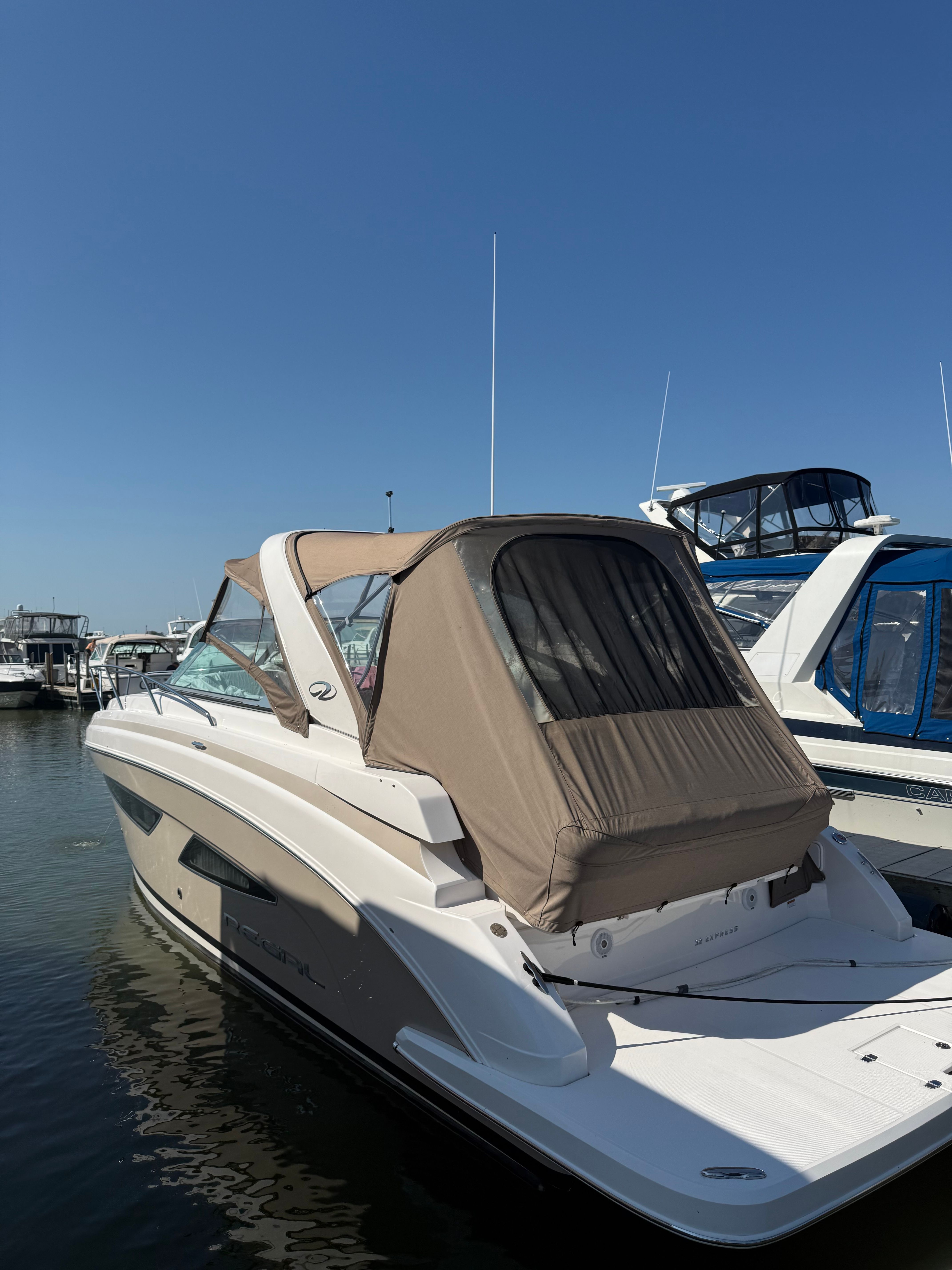 The Regal 32 Express is designed with practicality in mind, making ownership as enjoyable as it is rewarding. The bow thruster simplifies docking and close-quarters maneuvering, reducing stress and increasing confidence for captains of all experience levels. The battery charger ensures your onboard electronics and systems are always ready for action, while the protective bottom paint extends the life of your hull and reduces maintenance needs.Storage solutions throughout the boat allow you to bring along all the gear and supplies you need for a day on the water or a weekend getaway. The efficient design of the cockpit and cabin maximizes usable space, providing plenty of room for relaxation, dining, and entertainment. Whether you are planning a quick afternoon cruise or an extended voyage, the Regal 32 Express is equipped to handle it all with ease.