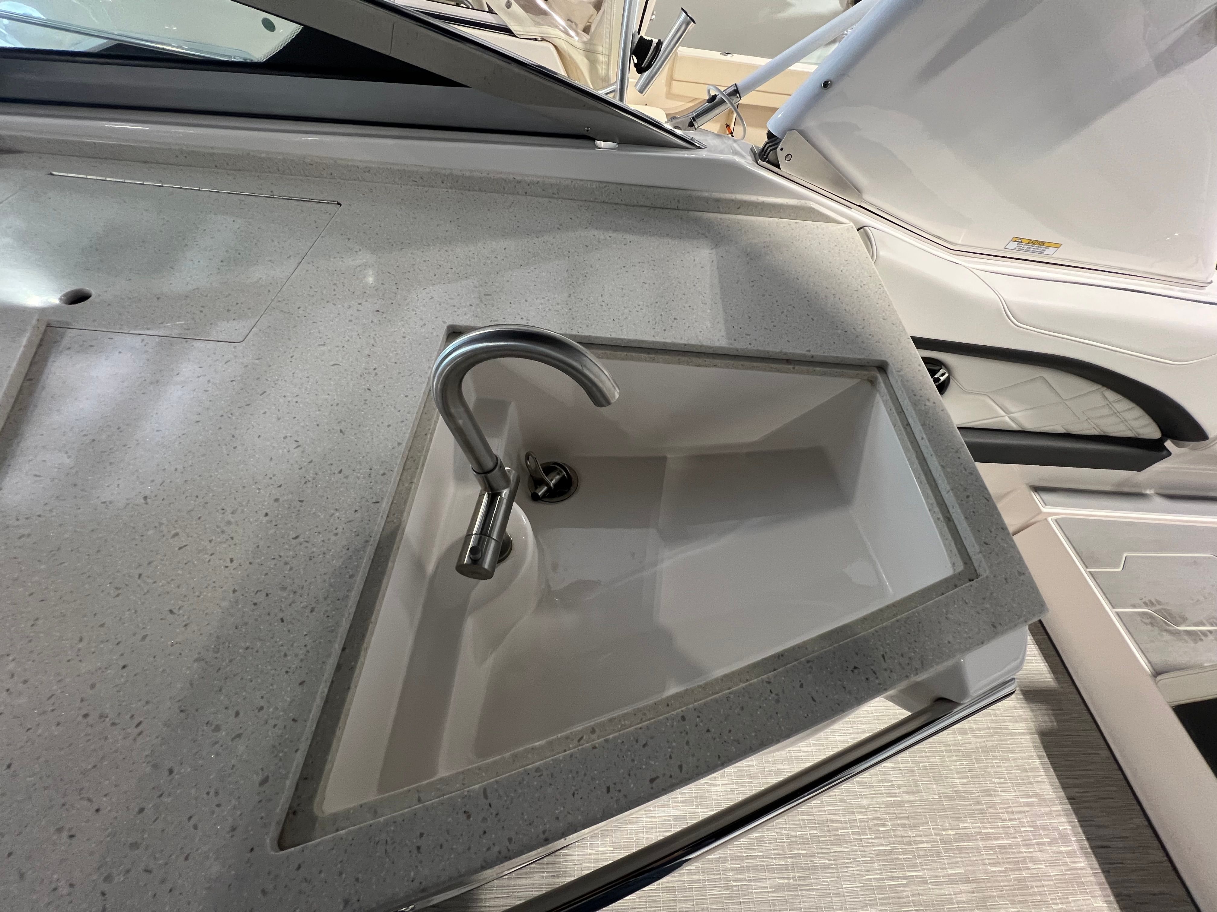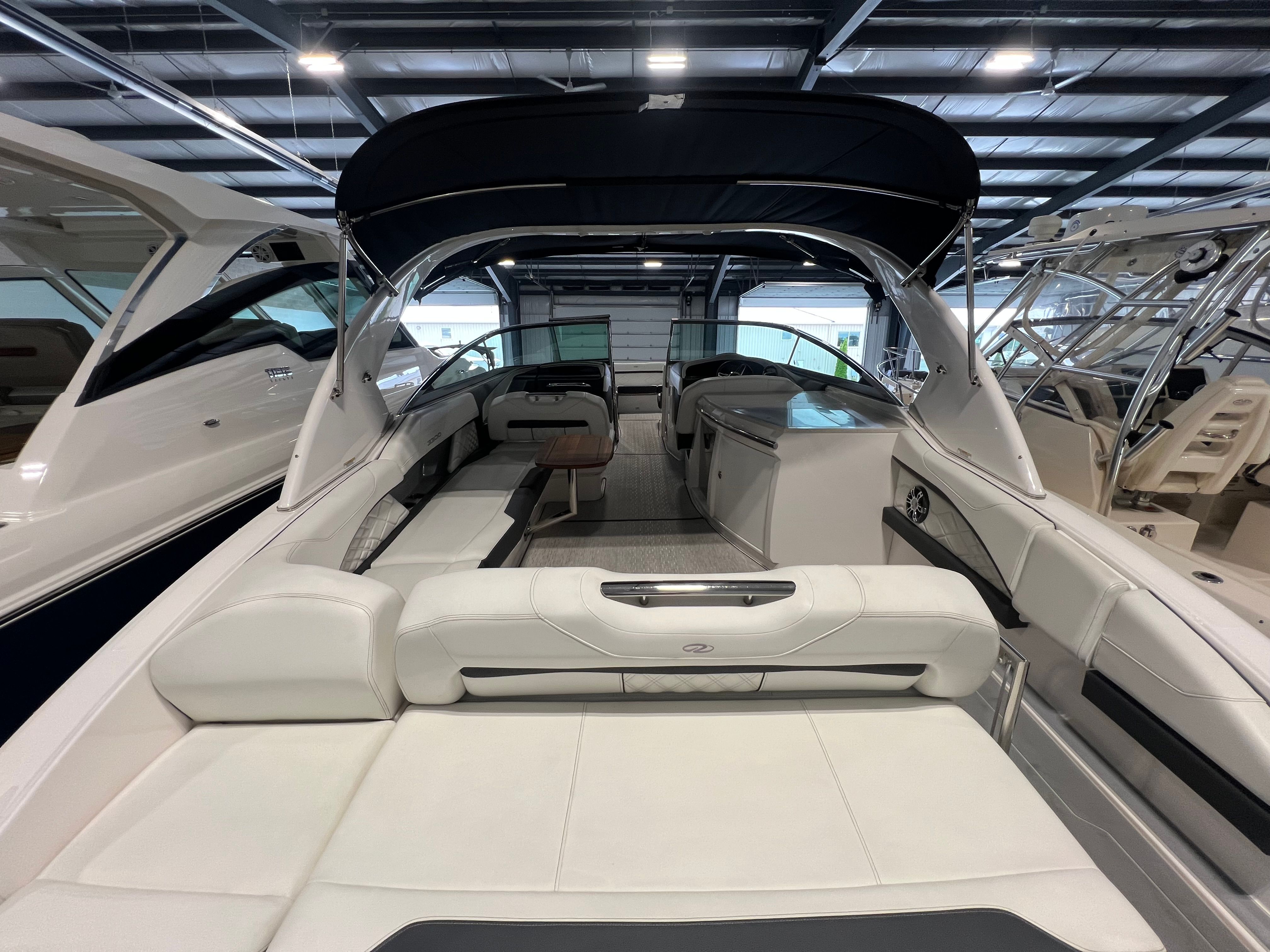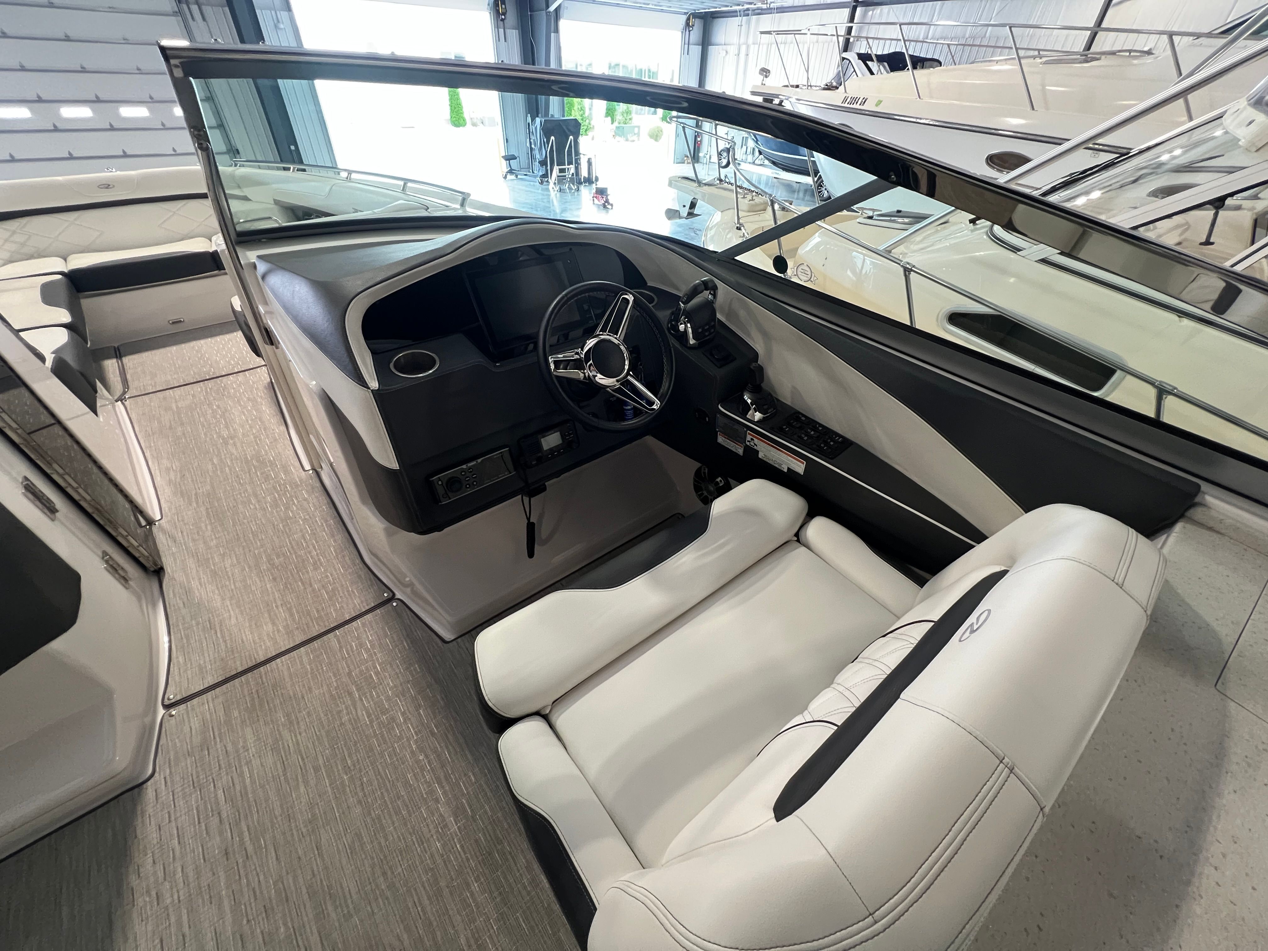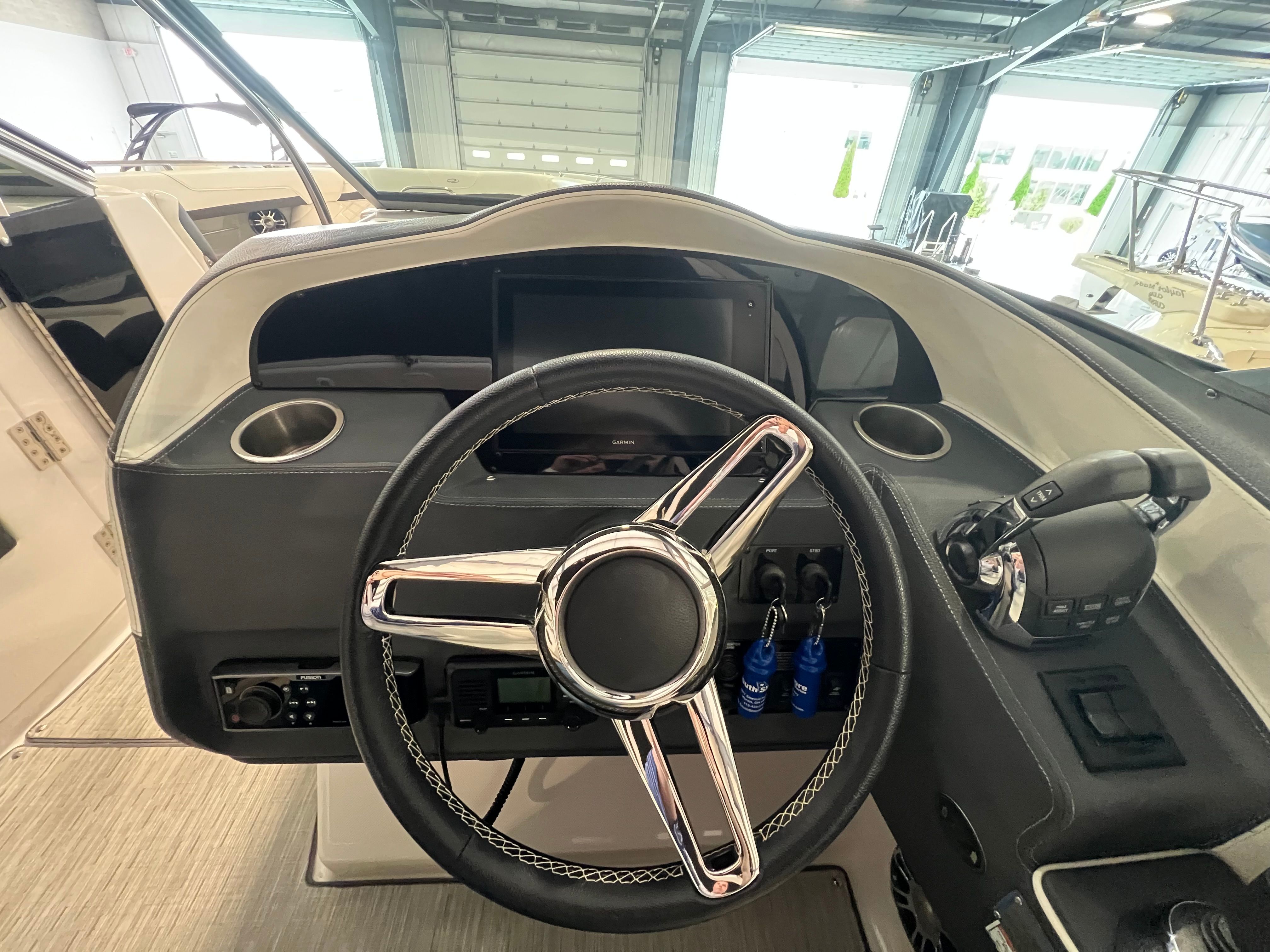 An extended swim platform enhances the boats functionality, providing ample space for water activities and easy access for swimming or boarding watercraft. The freshwater-only system ensures that the boat's plumbing remains in optimal condition, perfect for leisurely cruising and day trips. Additionally, the Garmin VHF radio ensures reliable communication, enhancing safety and connectivity while you're out on the water.