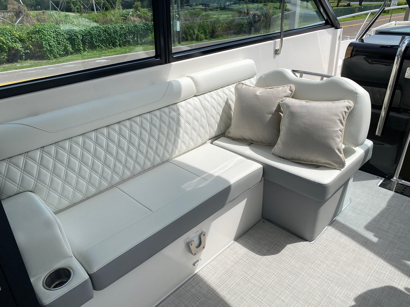 The Regal 36 XO is packed with special features that elevate your boating experience. The absence of bottom paint ensures a pristine hull, maintaining the yacht’s sleek appearance and reducing maintenance. The manual bow sunshade system offers flexible protection from the sun, allowing you to create a comfortable environment on deck. Transom seat covers and a windshield privacy cover provide added convenience and privacy, making every outing more enjoyable.Step into the cockpit and you’ll find a luxurious seagrass mat that enhances both comfort and style. The neutral pillow package, paired with coastal-inspired accents, creates a relaxing atmosphere perfect for unwinding after a day on the water. The countertops, finished in Strato Wind, add a touch of elegance to the galley and entertaining spaces, making meal preparation and social gatherings a pleasure.