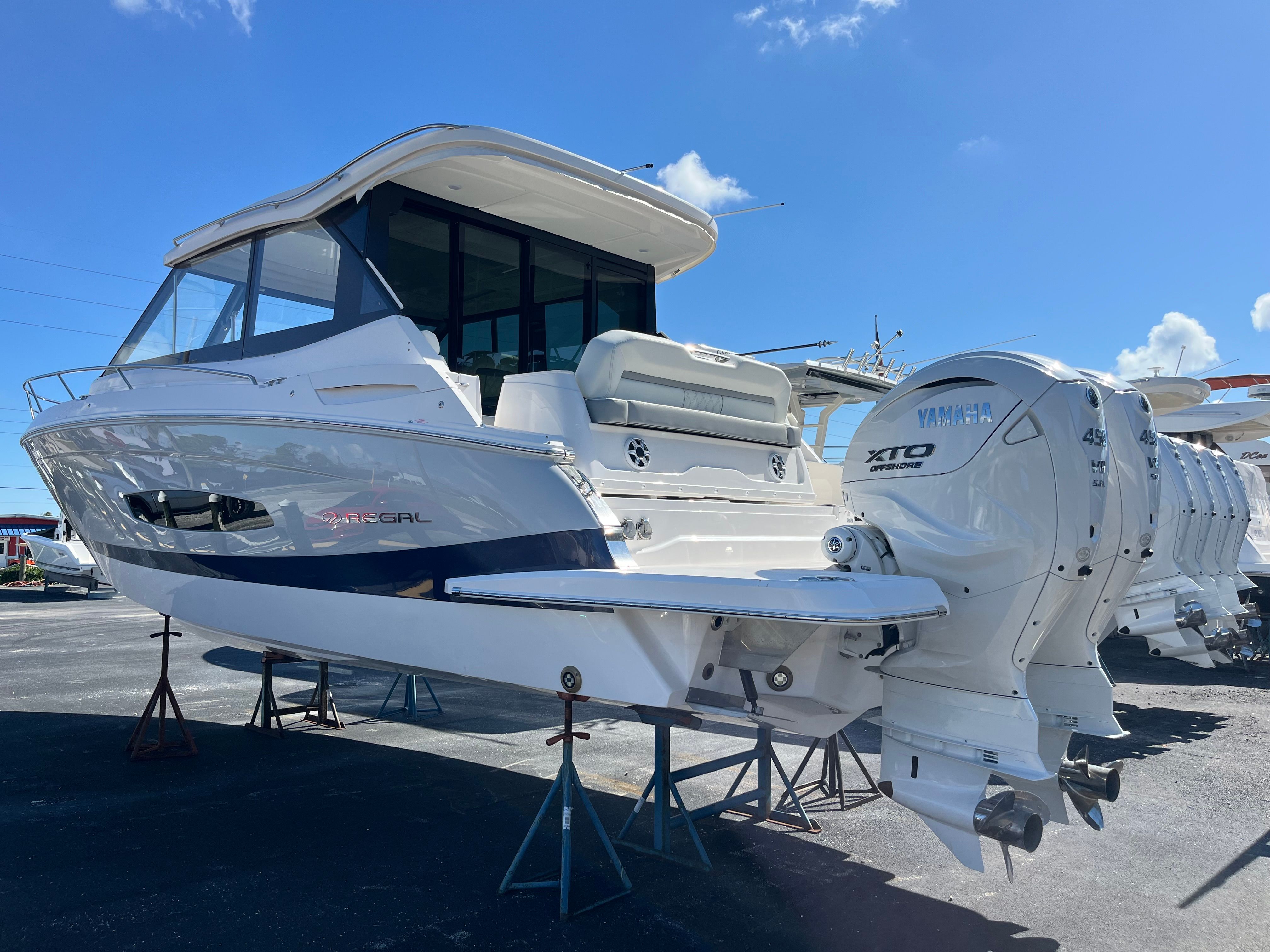 In summary, the 2026 Regal 36 XO is a yacht boat for sale that combines cutting-edge performance, elegant design, and a host of special features to deliver an unparalleled boating experience. With twin Yamaha F450 engines, a striking Steel Gray hull, Mediterranean Blue bootstripe, Tahiti Beach White bottom, and a Titanium interior, this Regal boat for sale is both visually stunning and exceptionally functional. The Palm Beach Enclosure, manual bow sunshade system, transom seat covers, and windshield privacy cover add comfort and convenience, making every outing enjoyable. If you’re ready to elevate your time on the water and enjoy the luxury, versatility, and excitement that only a Regal yacht can provide, the 36 XO is the perfect choice. Contact your local dealer today to learn more about this remarkable yacht and start your next adventure in style.