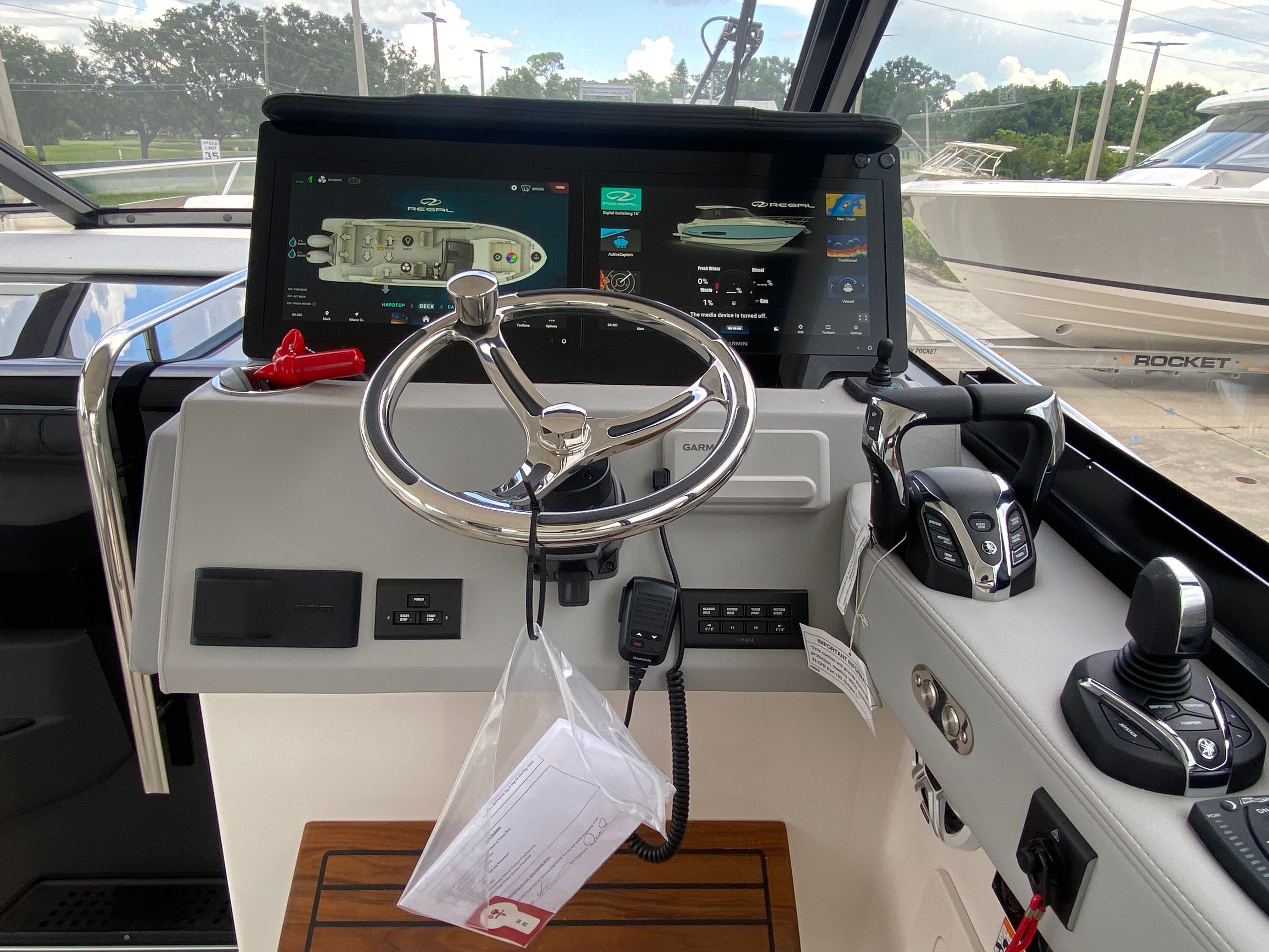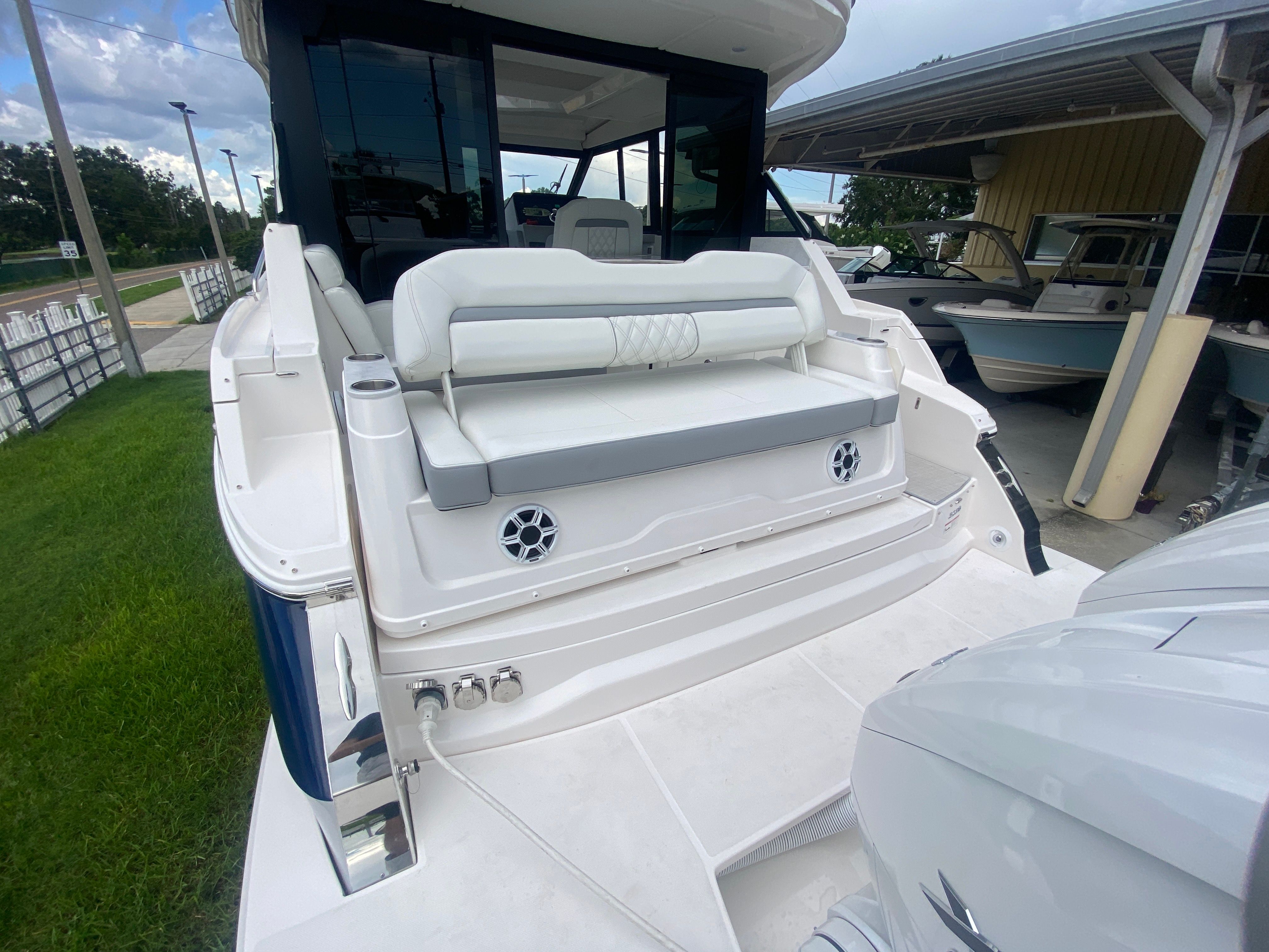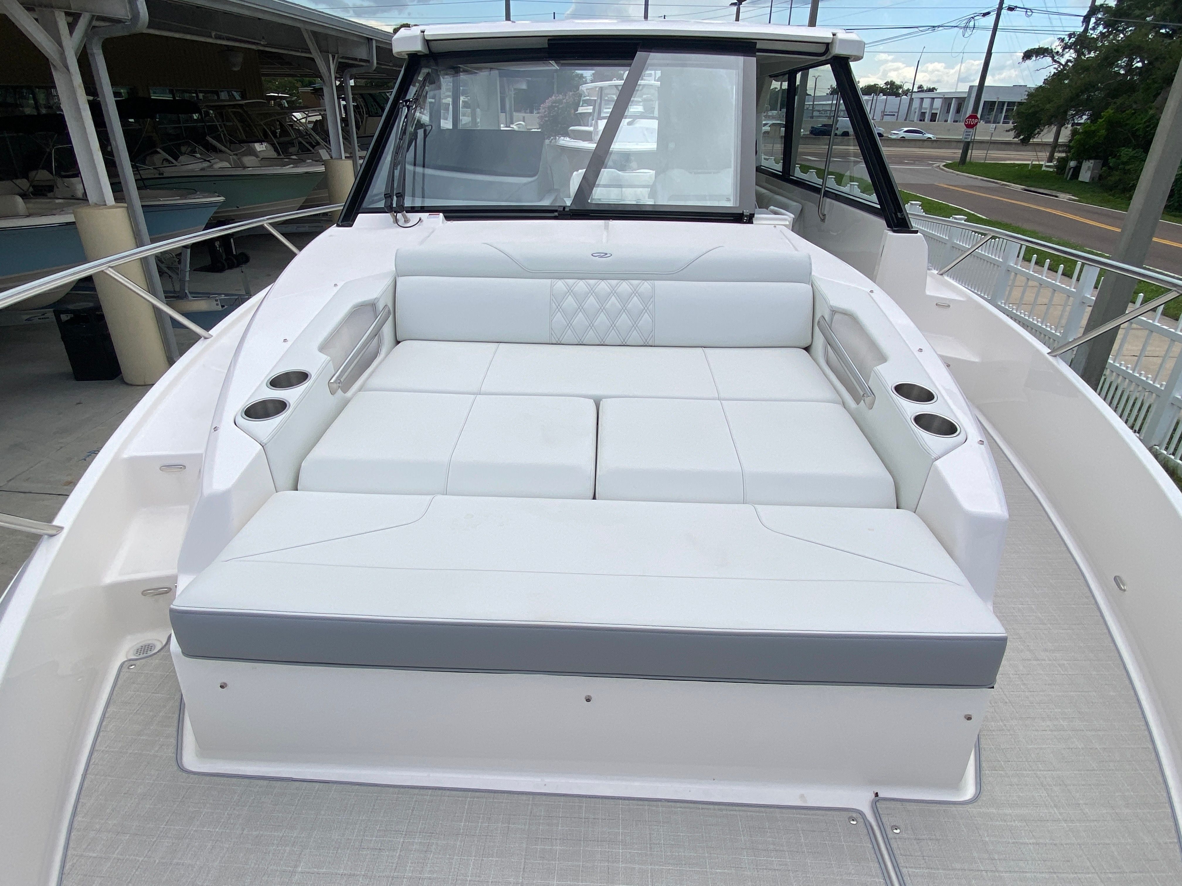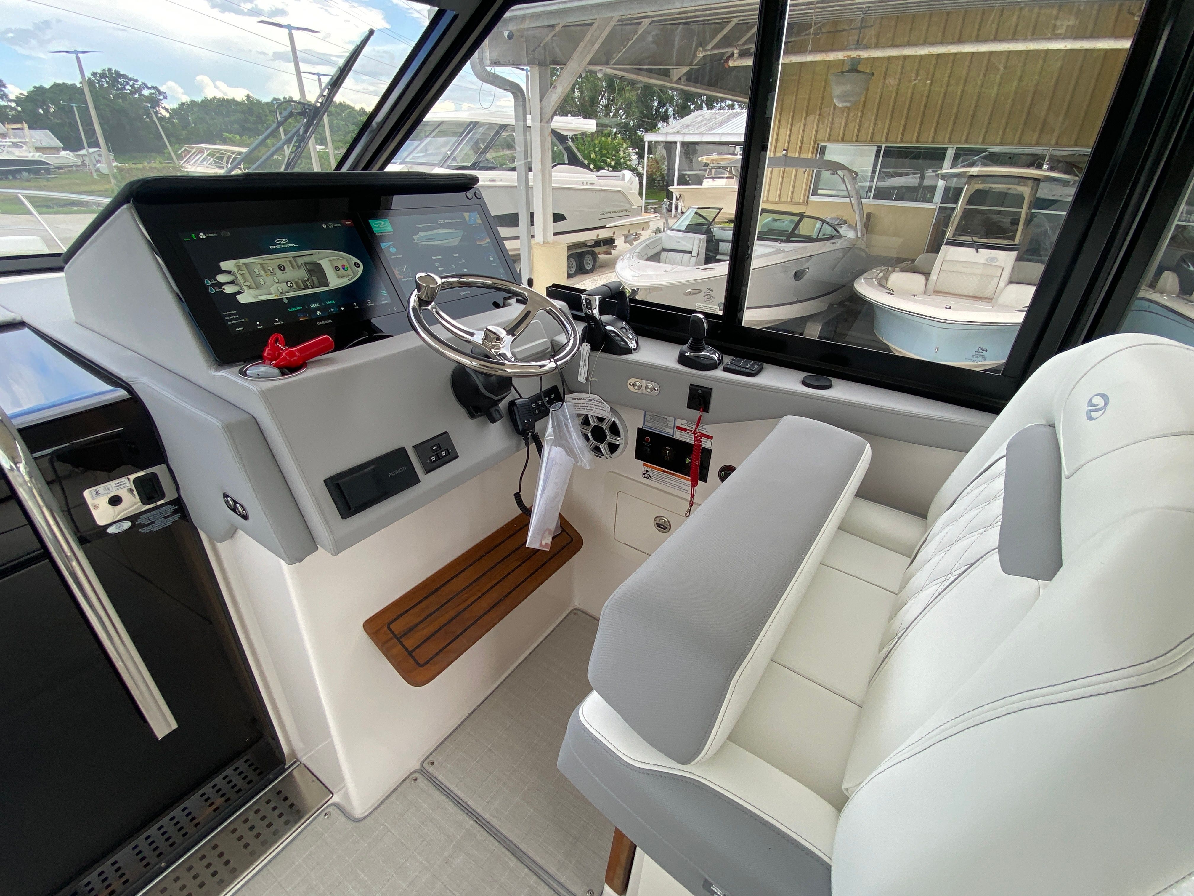 The Regal 36 XO is packed with premium features designed to elevate your time on the water. The overboard discharge toilet offers convenience and practicality, ensuring comfort during extended trips. The diesel 110V generator provides reliable power for all your onboard systems, so you can enjoy modern amenities wherever you go. The cruise package enhances your journey, making every outing smooth and enjoyable. For entertainment, the stereo satellite tuner with antenna delivers crystal-clear sound and access to your favorite music and channels, setting the perfect mood for any occasion.The Mediterranean Blue hull and canvas create a cohesive and stylish look, while the toasted oak salon floor adds a touch of luxury to the interior. The windshield privacy cover offers added comfort and security, allowing you to relax in peace. The electric salon door provides effortless access to the main living area, combining convenience with modern design. Every feature has been thoughtfully selected to enhance your boating experience, making the Regal 36 XO a top choice among yacht boats for sale.