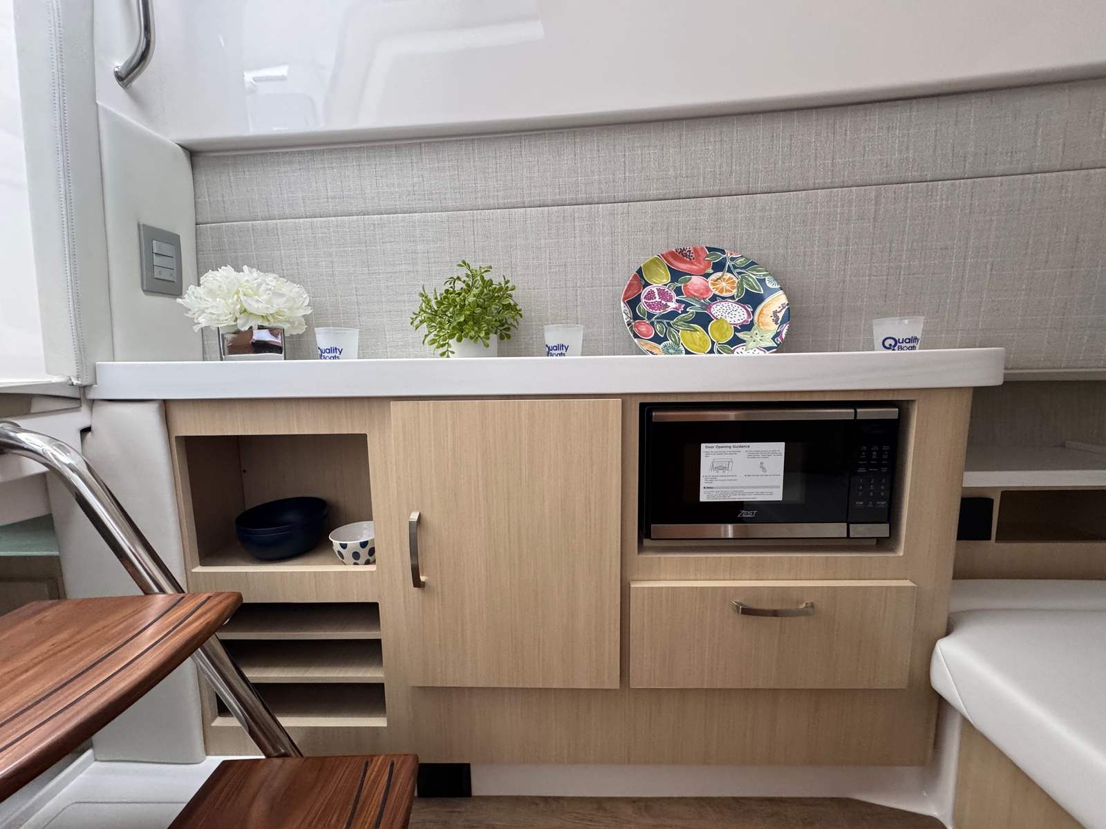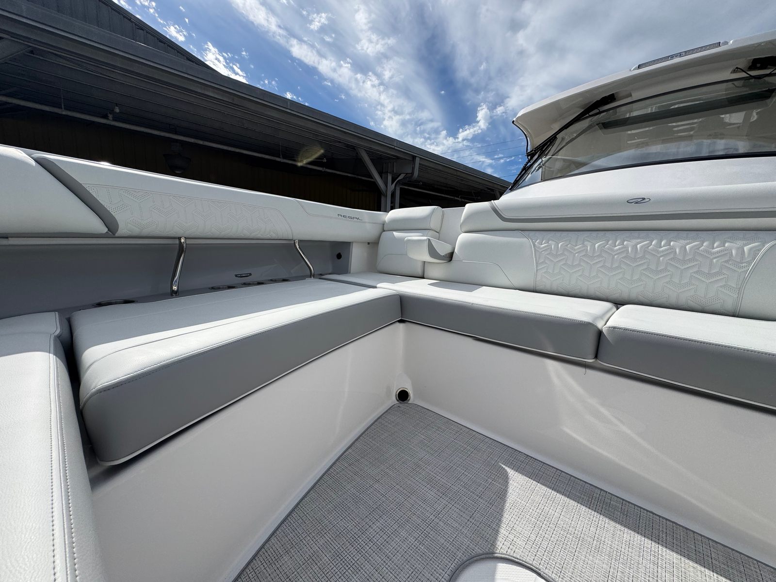 The Regal 38 SAV is designed with both style and functionality in mind. Its Steel Grey hull is complemented by a Graphite bootstripe, while the bottom color in Tahiti Beach White adds a touch of elegance. The yacht’s exterior zones are thoughtfully coordinated, featuring Pure White and Lunar Grey finishes that create a harmonious and modern look. The triple Yamaha 350 engines are a standout feature, providing unmatched power and reliability.Inside and out, the Regal 38 SAV offers a spacious and inviting environment. The open deck layout is perfect for socializing, with plenty of room for guests to relax and enjoy the scenery. The yacht’s design maximizes usable space, ensuring that every inch is both practical and luxurious. High-quality materials and finishes are used throughout, reflecting Regal’s commitment to excellence.