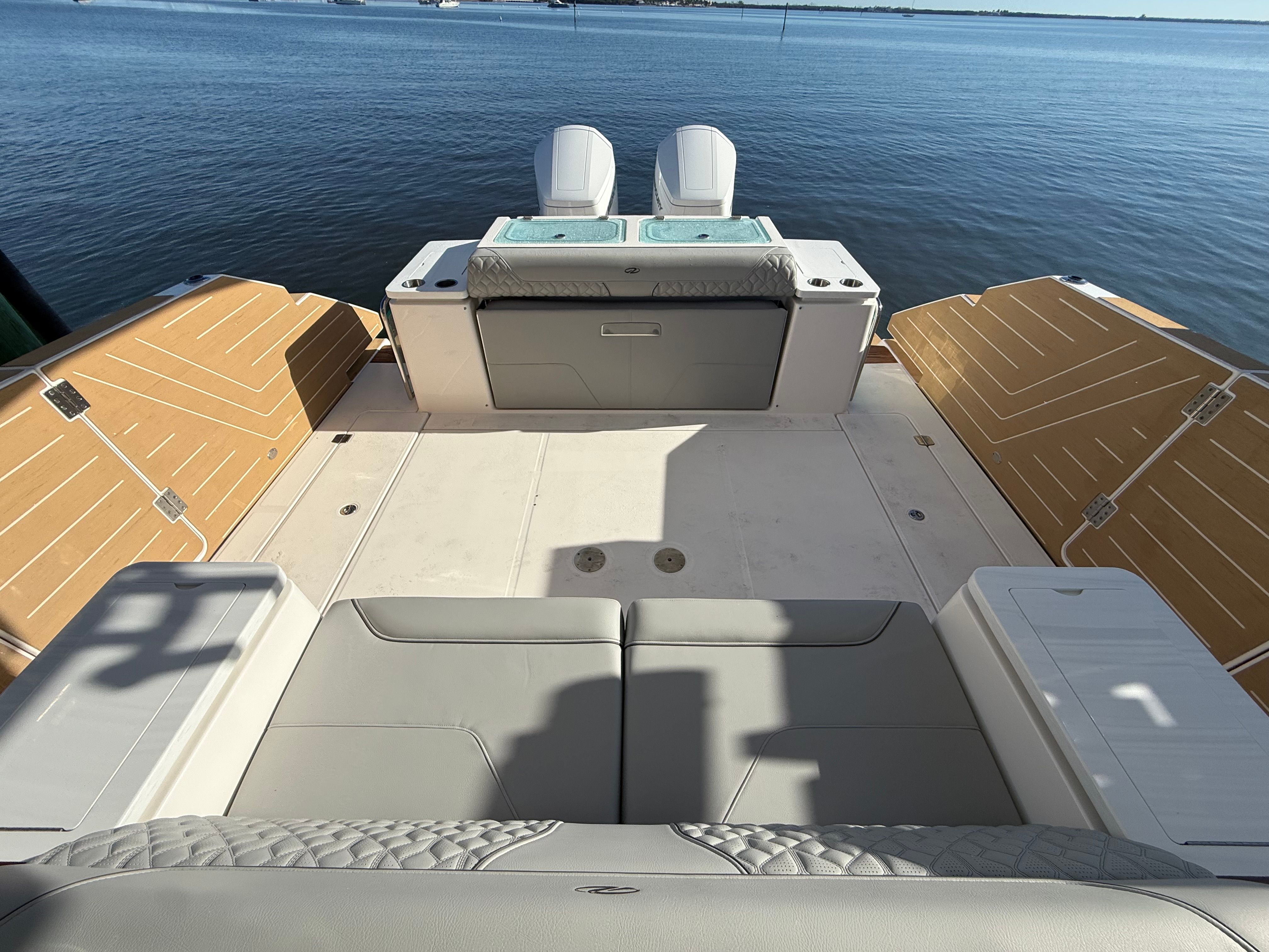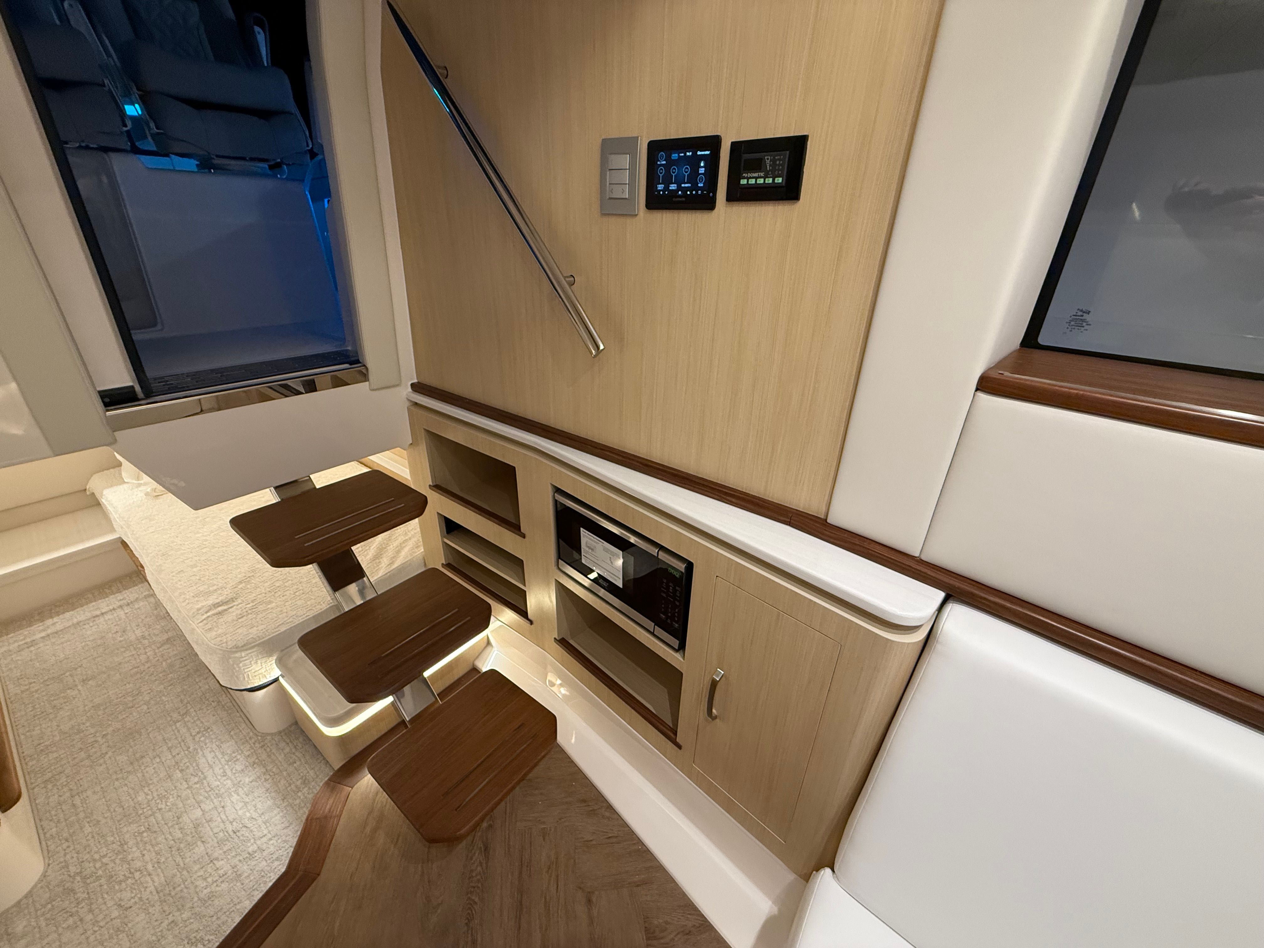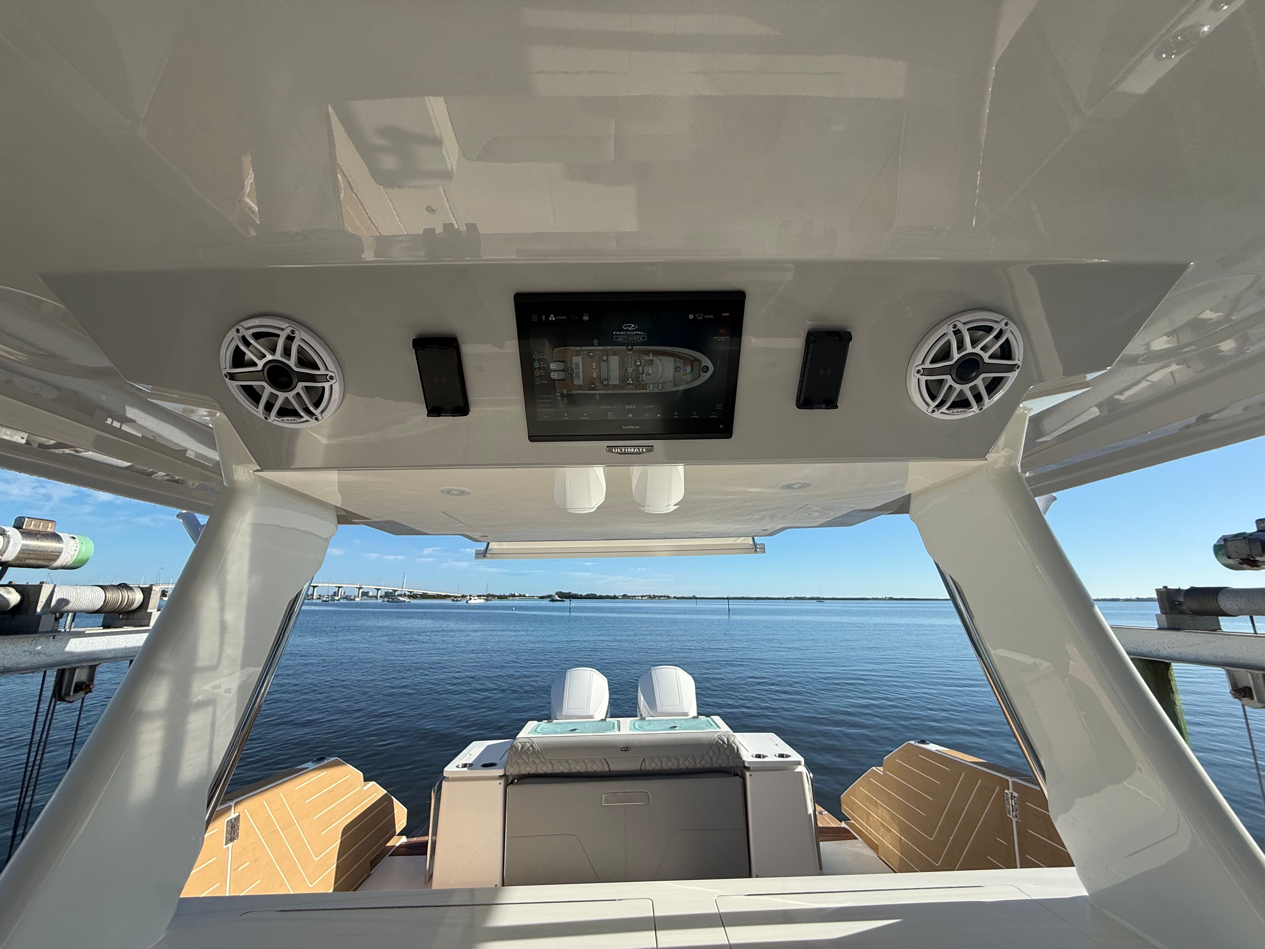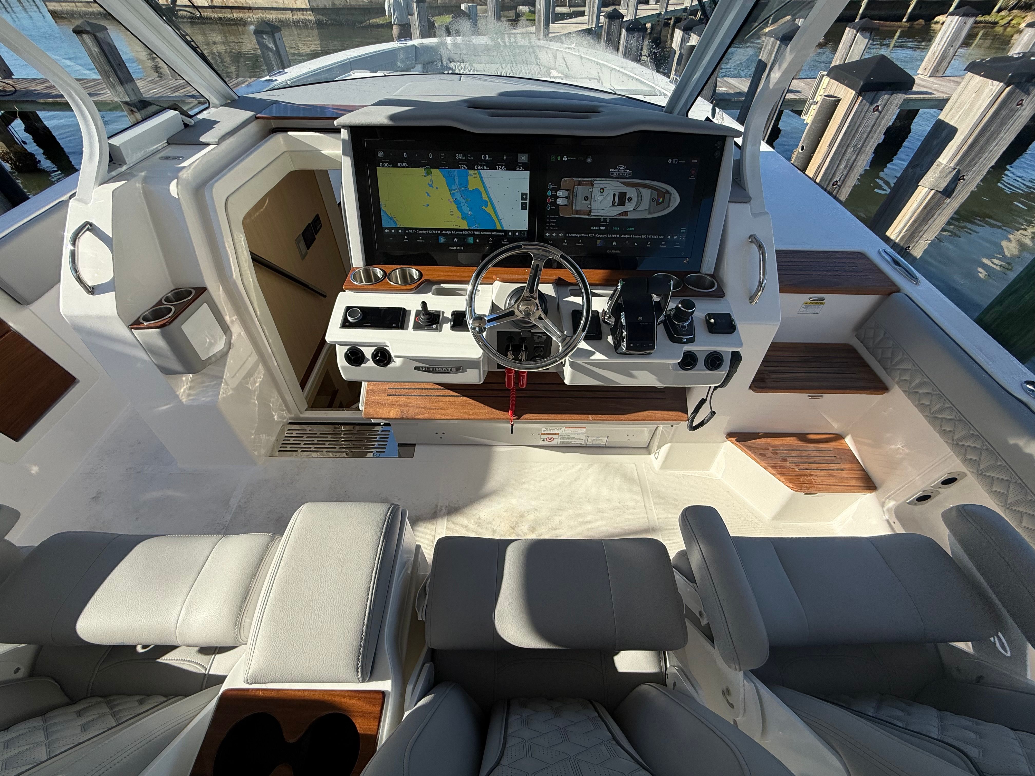 The Regal 43 SAV is loaded with special features that elevate your boating experience. The cockpit upholstery, finished in Base One - Lunar Grey with Accent Thread in Graphite Grey, creates a sophisticated and inviting atmosphere. The countertops, crafted from Strato Wind, add a touch of modern elegance to the yacht’s interior spaces. For entertainment, a cockpit television ensures you and your guests can enjoy your favorite shows or sporting events while relaxing outdoors.The synthetic teak swim platform offers both style and durability, providing a comfortable and slip-resistant surface for swimming or boarding. Teak steps add a classic touch and make moving between levels safe and easy. The yacht is equipped with a diesel generator (110V), ensuring you have reliable power for all your onboard systems, no matter where your adventures take you.For navigation and safety, the Garmin HD Open Array Radar delivers advanced situational awareness, helping you navigate with confidence in all conditions. The Snowcap feature adds a distinctive visual element, enhancing the yacht’s overall appeal. Every detail of the Regal 43 SAV is designed to provide a seamless blend of luxury, technology, and practicality.