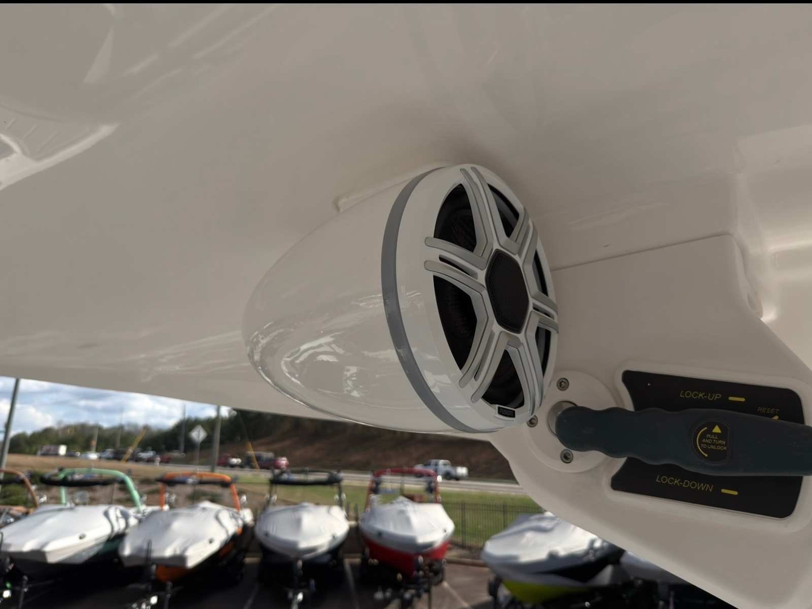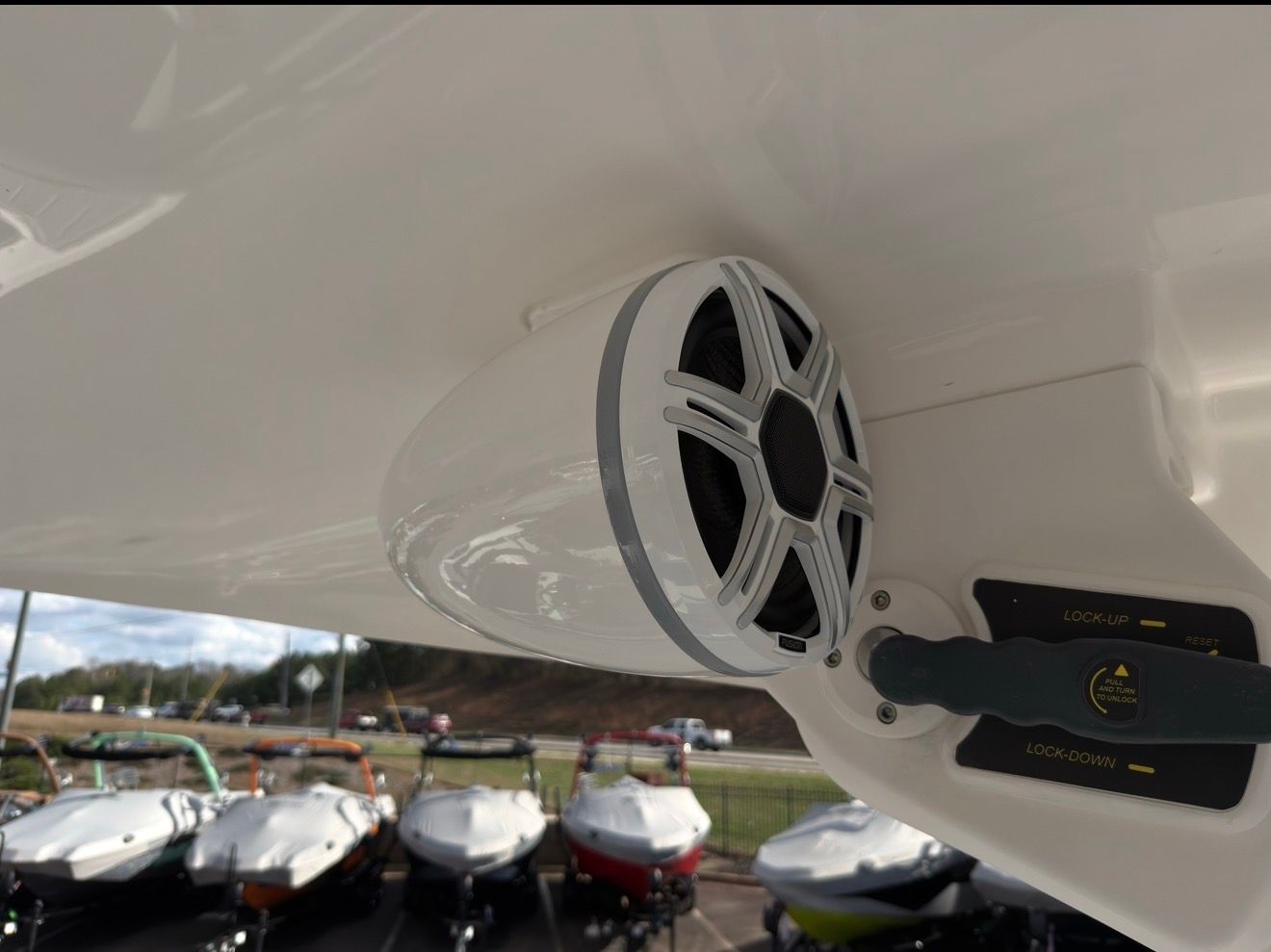 - 1 Pair Factory Matching 8" Tower Speakers(White) in AVC Custom Enclosures with RBGW Light Rings, 12" Subwoofer in Custom Enclosure, Appropriate Marine Channel Amplifier - Installed