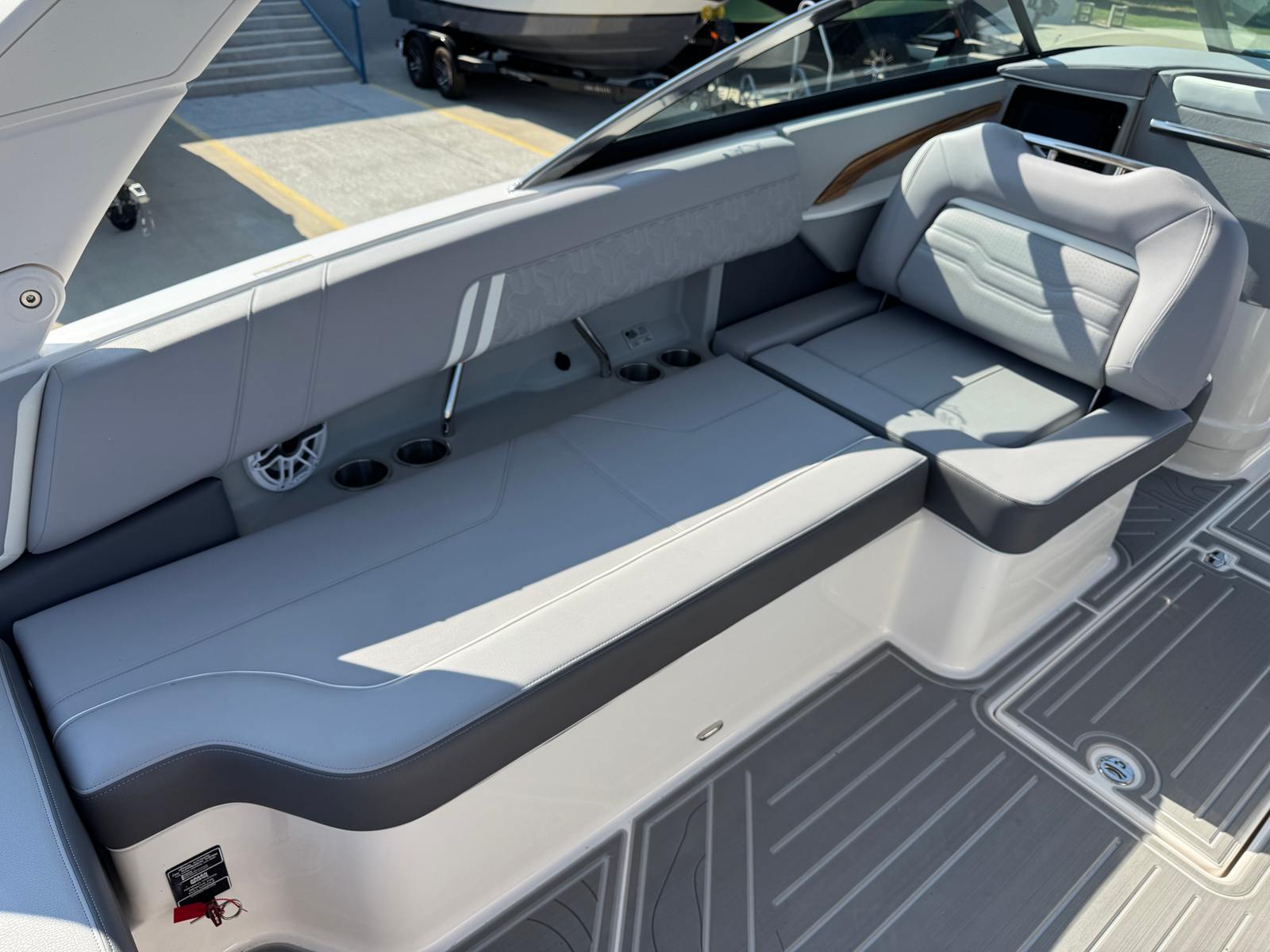 The Regal LS9 Surf is loaded with features designed to maximize your enjoyment on the water. The Volvo V8 430 FWD EVC2 DP CAT engine is the centerpiece of its performance, offering both power and efficiency. The hull’s Steel Grey color, paired with the Tahiti Beach White bootstripe and bottom, gives the boat a distinctive and elegant look. Inside, the combination of Lunar Grey - Chil, Graphite - Chil, and Pure White materials creates a luxurious and comfortable environment for passengers. Every detail, from the upholstery to the finishes, reflects Regal’s dedication to quality and style.