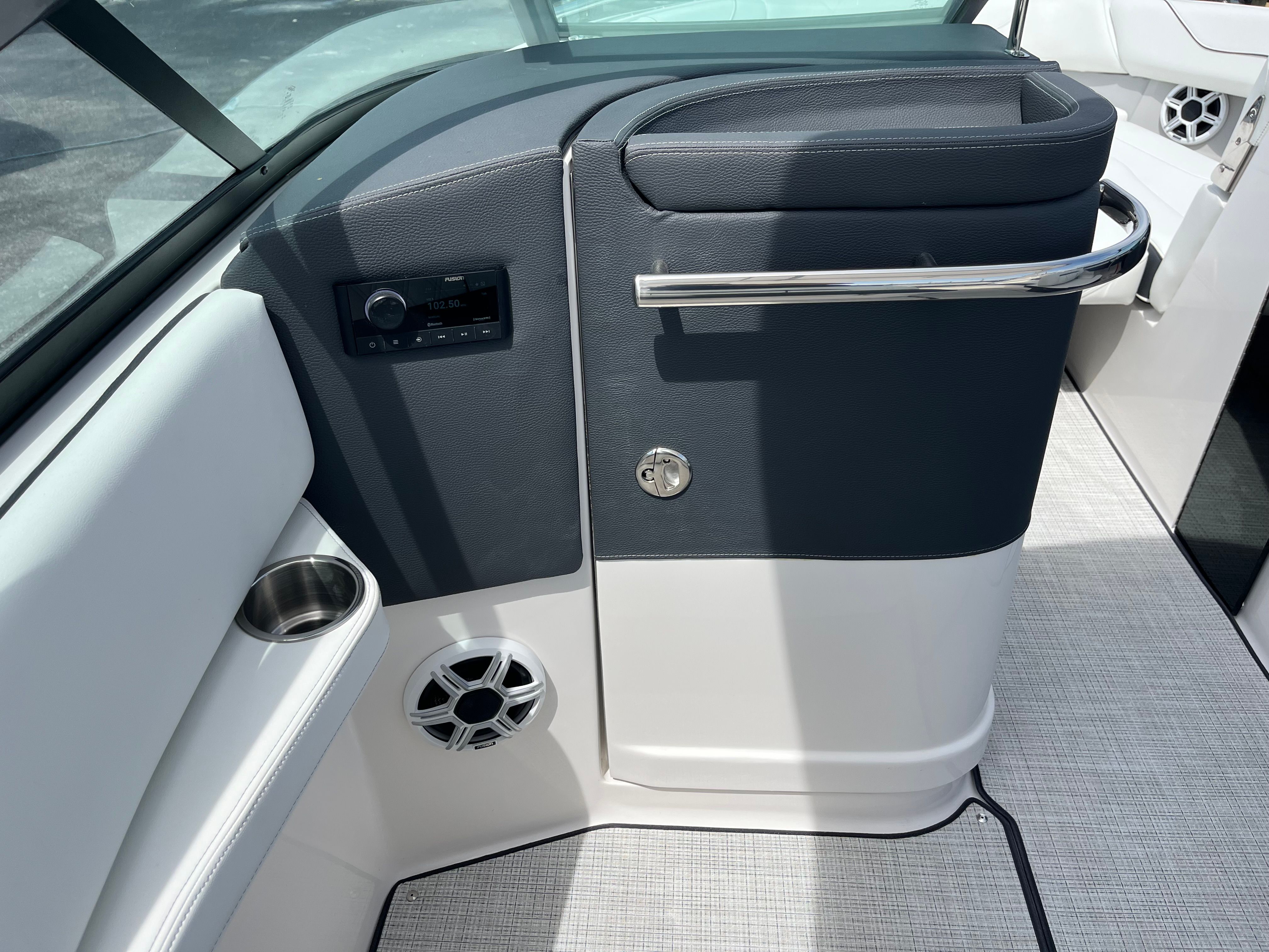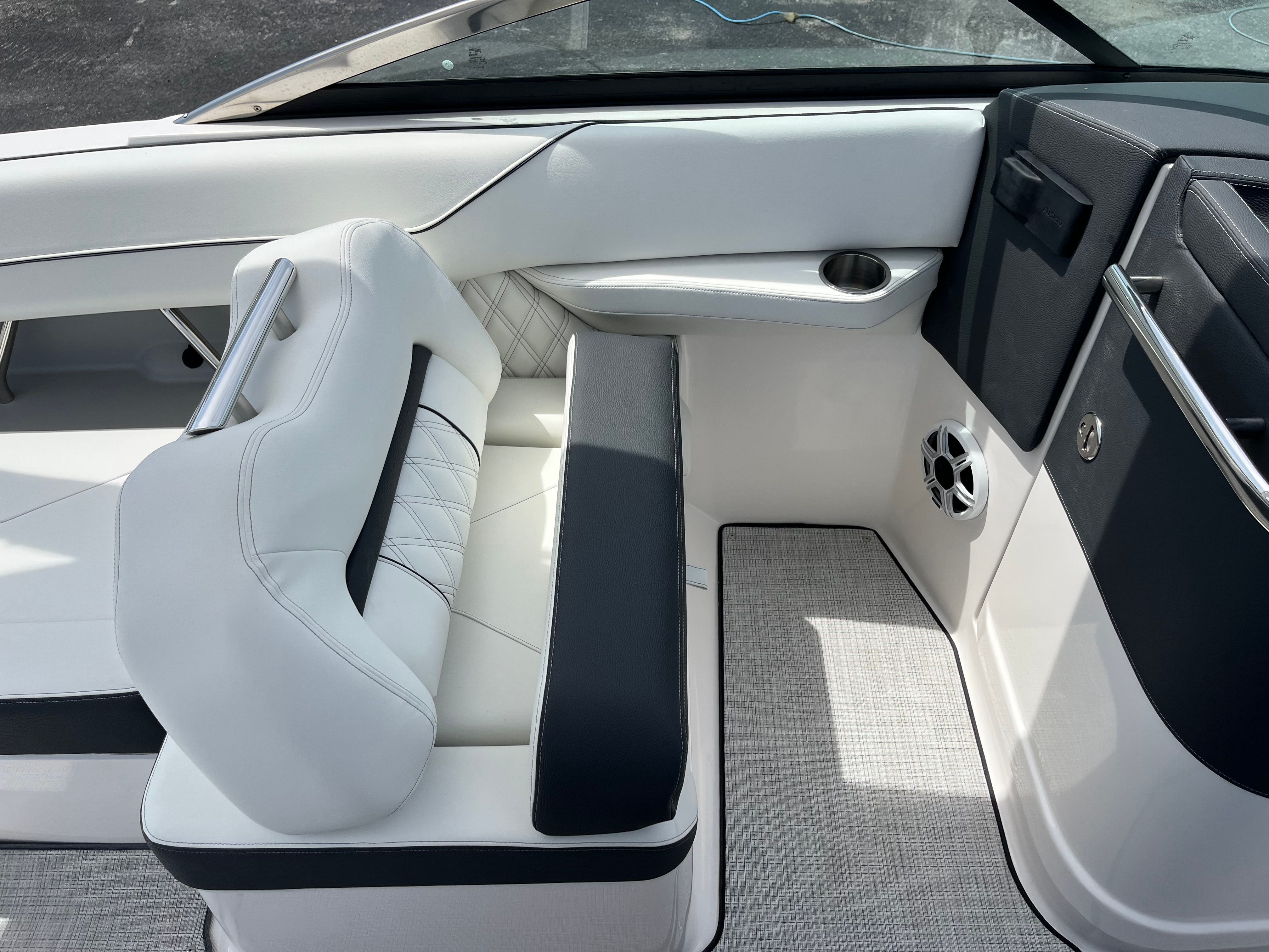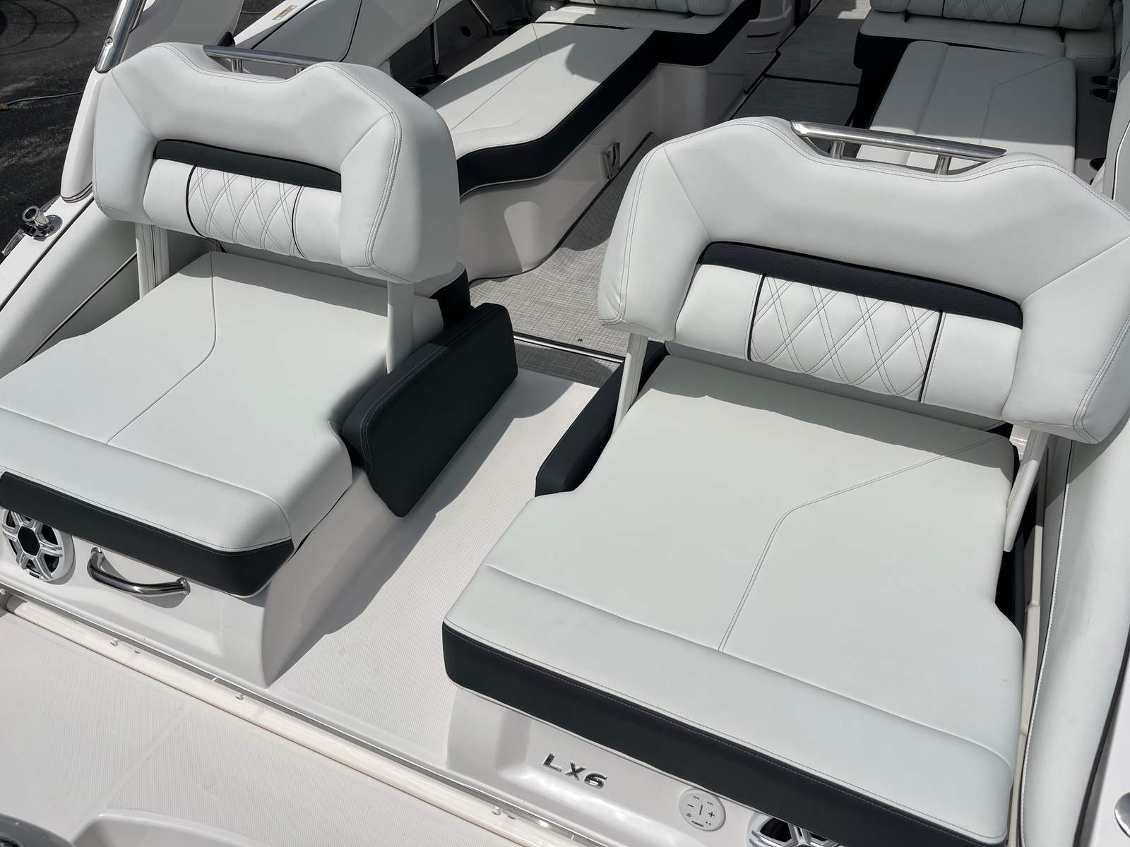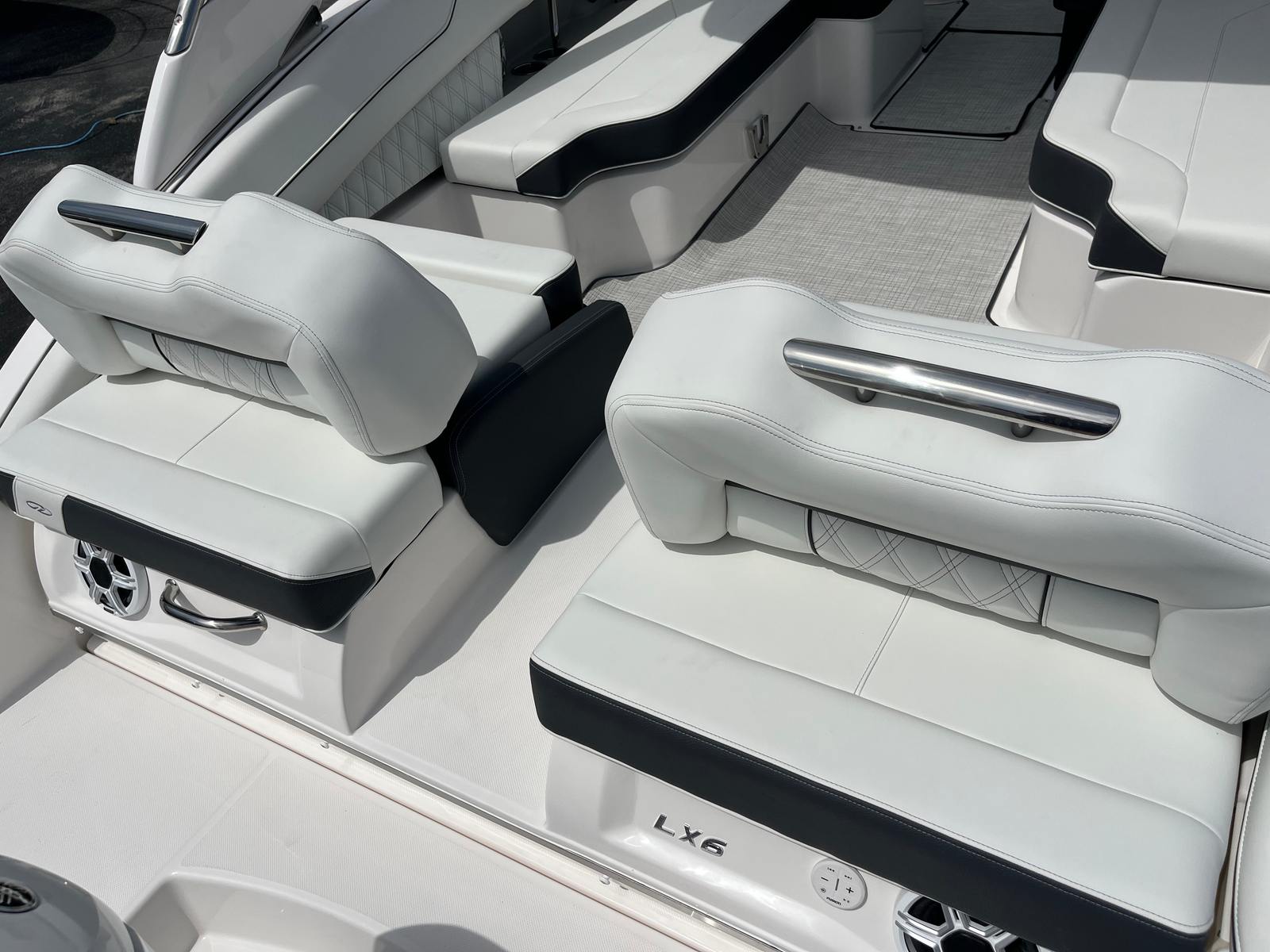 Practicality is at the core of the Regal LX6’s design. The dual battery system and charger ensure that you have dependable power for extended outings, while the bow thruster simplifies docking, even in challenging conditions. The trim tabs allow you to adjust the boat’s attitude for a smoother ride, improving fuel efficiency and comfort. The bow and cockpit covers protect your investment from sun and weather, reducing maintenance and preserving the boat’s appearance.The transom shower and pressure water package add a touch of luxury, making it easy to rinse off after swimming or clean up before heading home. The cockpit seagrass mat is not only stylish but also easy to clean, ensuring your boat stays looking its best with minimal effort. Every feature is designed to make ownership enjoyable and hassle-free, so you can spend more time on the water and less time worrying about upkeep.