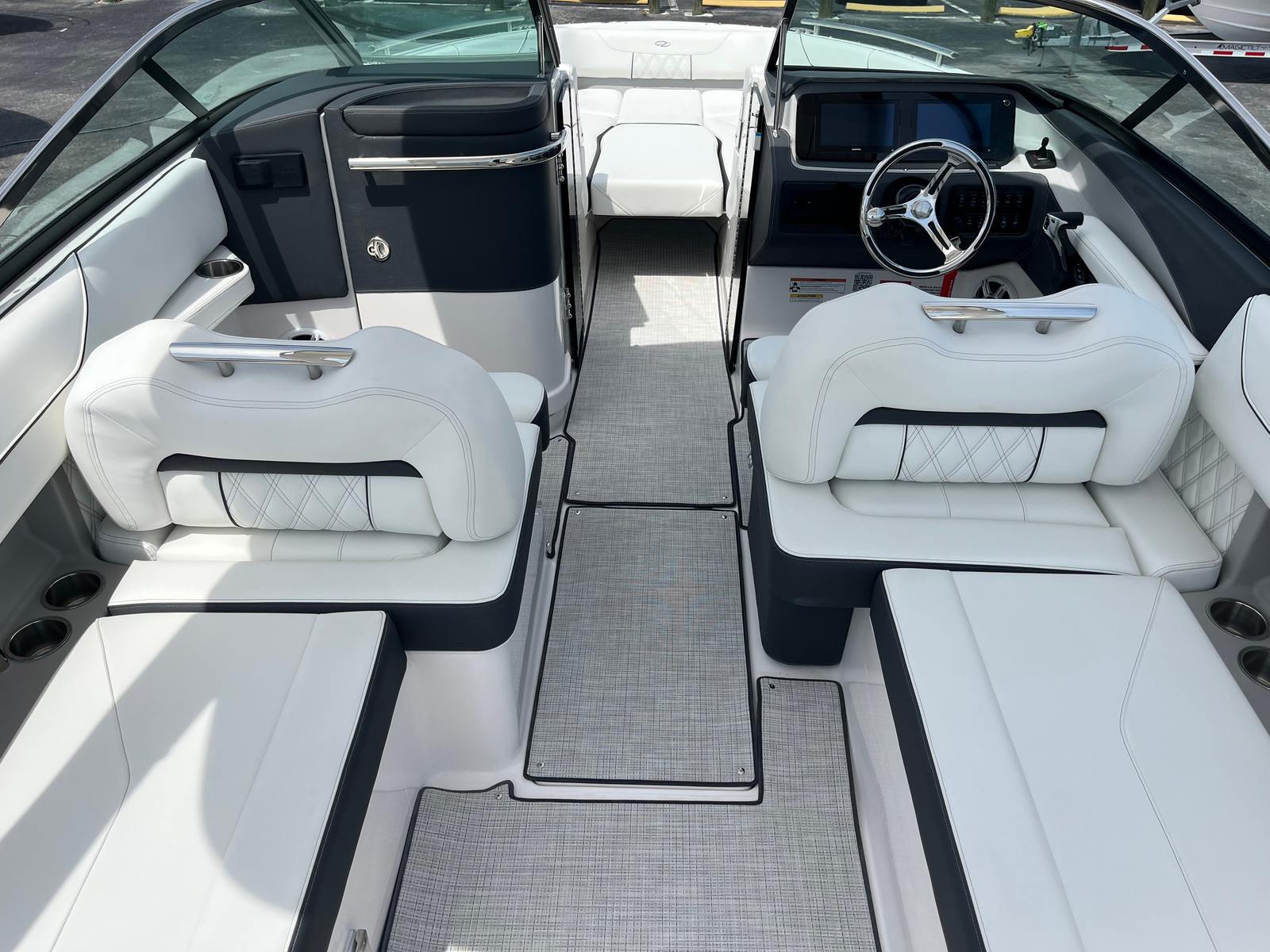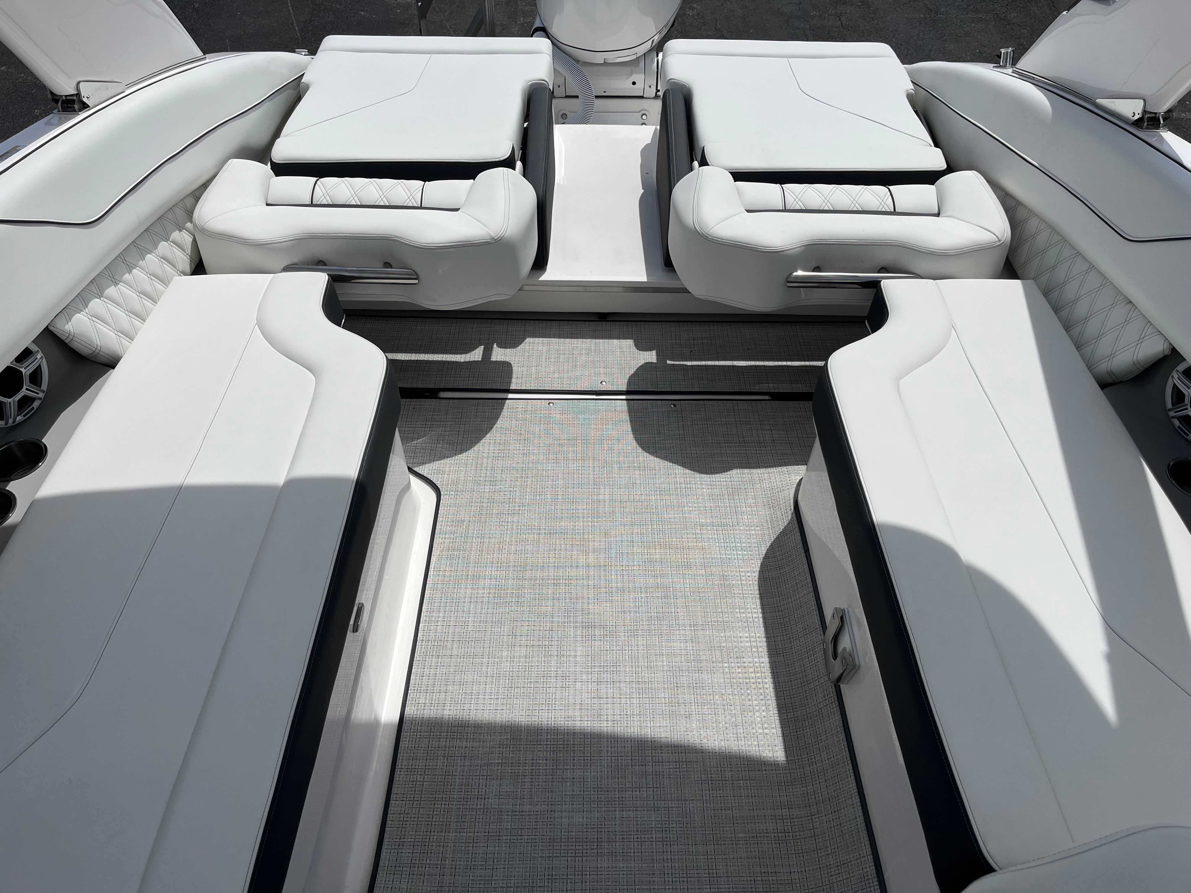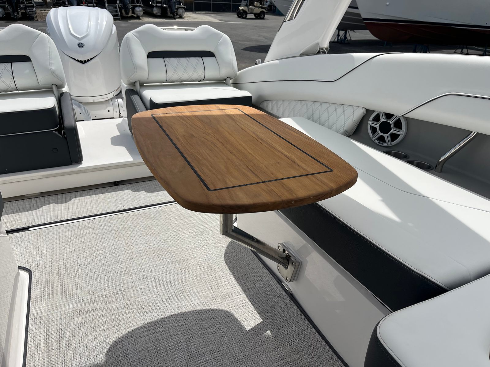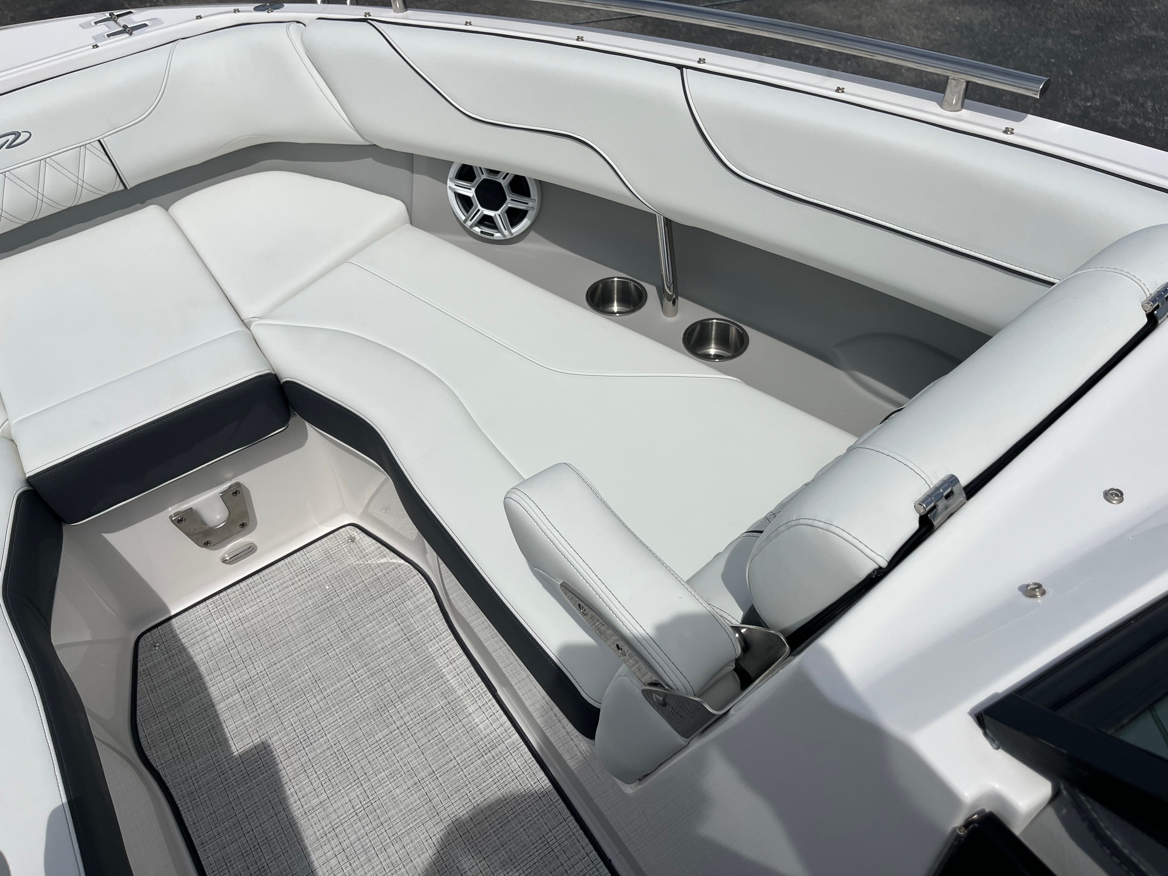 Practicality is at the core of the Regal LX6’s design. The dual battery system and charger ensure that you have dependable power for extended outings, while the bow thruster simplifies docking, even in challenging conditions. The trim tabs allow you to adjust the boat’s attitude for a smoother ride, improving fuel efficiency and comfort. The bow and cockpit covers protect your investment from sun and weather, reducing maintenance and preserving the boat’s appearance.The transom shower and pressure water package add a touch of luxury, making it easy to rinse off after swimming or clean up before heading home. The cockpit seagrass mat is not only stylish but also easy to clean, ensuring your boat stays looking its best with minimal effort. Every feature is designed to make ownership enjoyable and hassle-free, so you can spend more time on the water and less time worrying about upkeep.