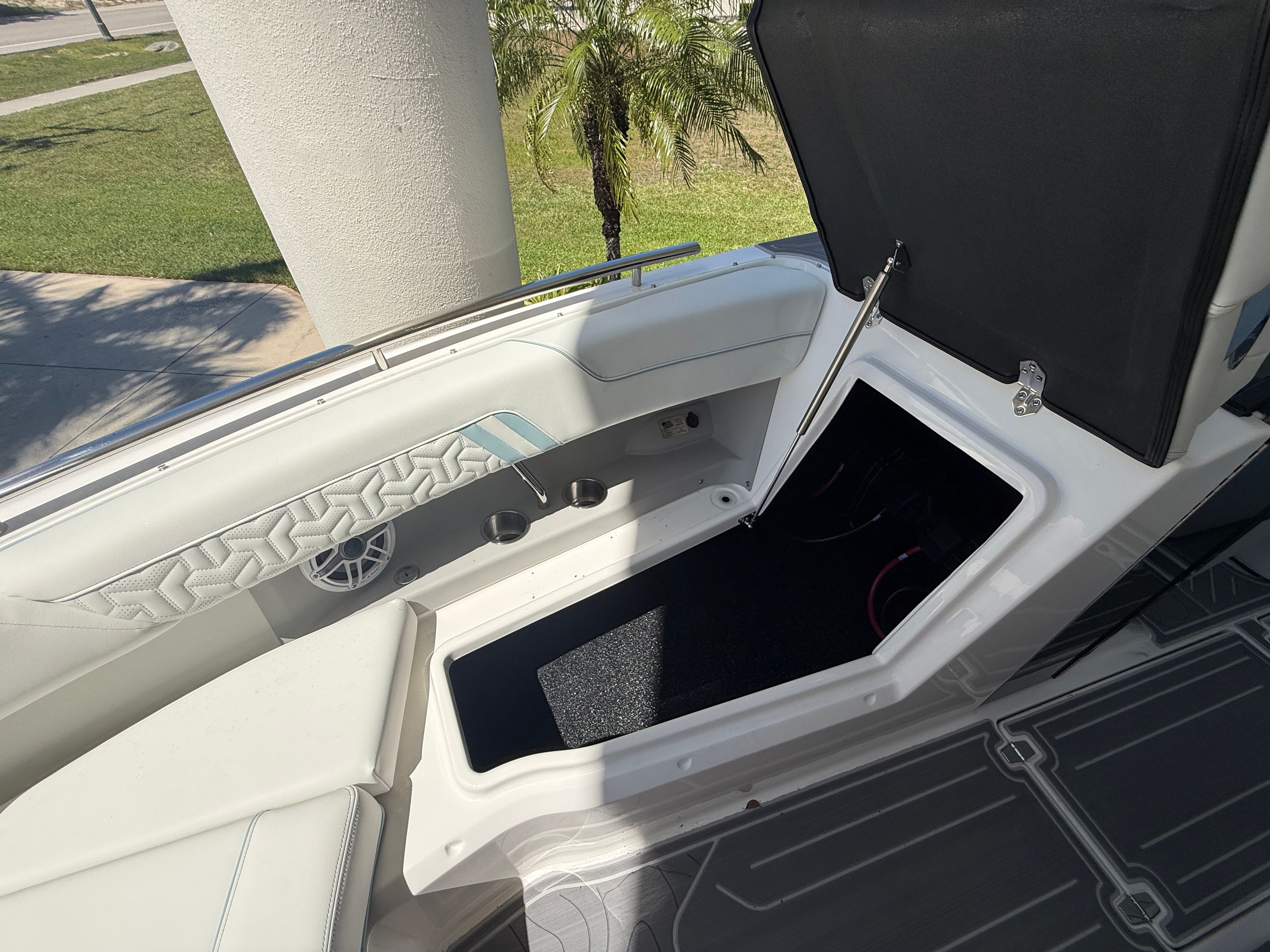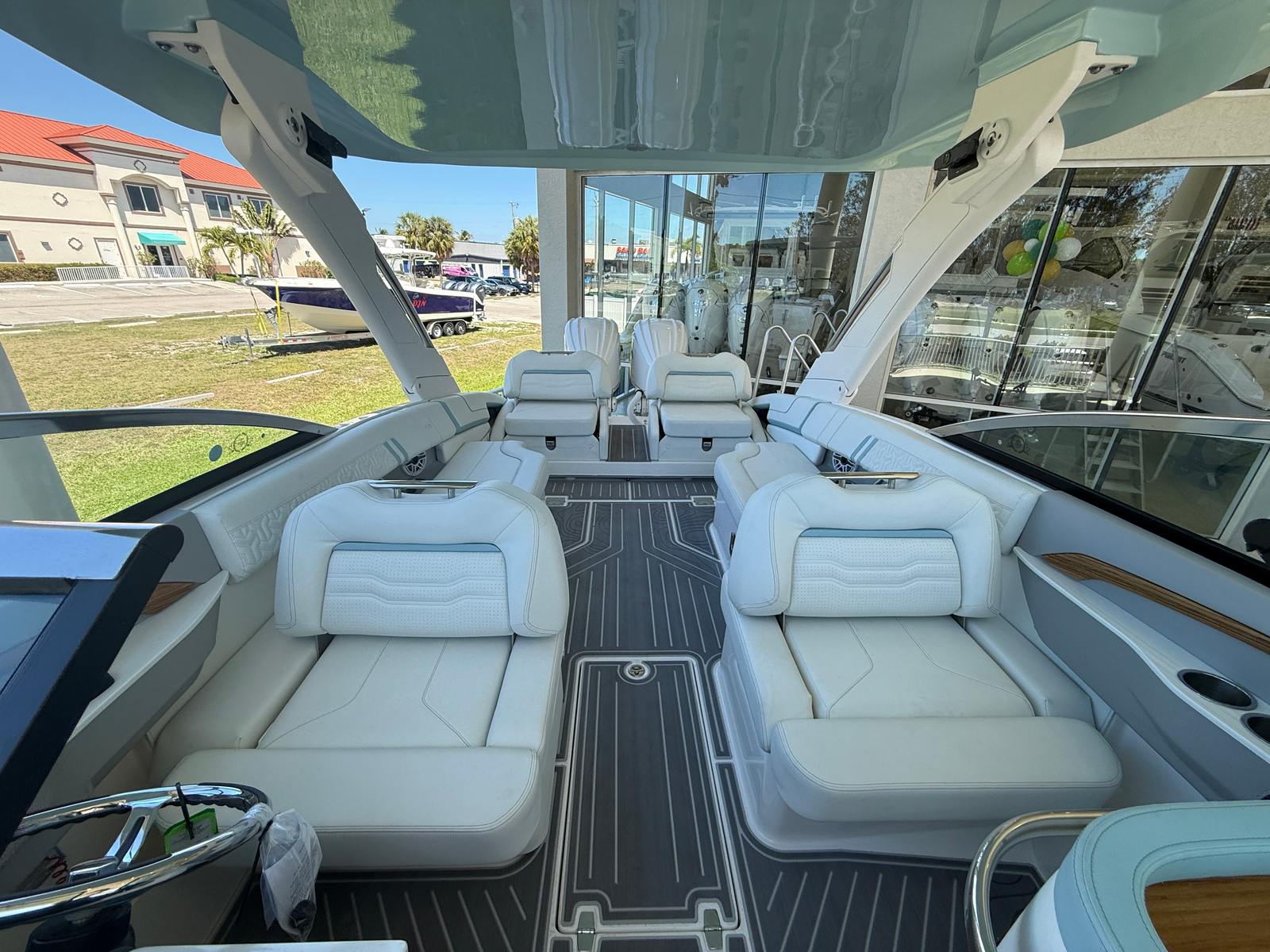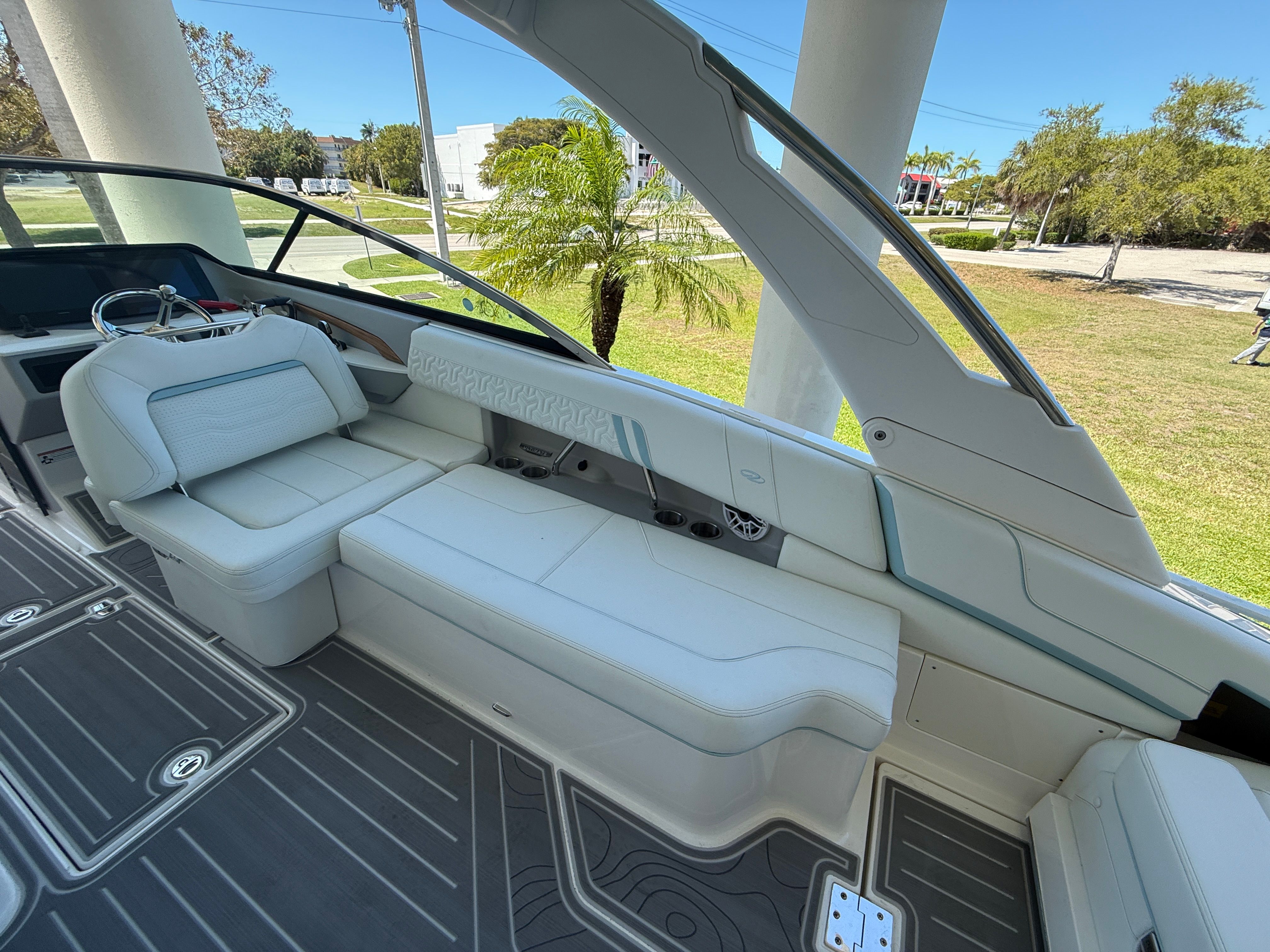 The Regal LX9 Ultimate is loaded with features that enhance both its functionality and its appeal. The hull’s Tahiti Beach White color exudes elegance, while the Belle Isle Blue bootstripe adds a touch of sporty sophistication. The interior is a masterpiece of design, with Pure White upholstery in zones 1 through 4, complemented by Belle Isle Blue accents in zones 5 and 6. This harmonious color palette creates a fresh, inviting atmosphere that is both modern and timeless.Special features include the twin Yamaha F250 engines with integrated steering, ensuring superior handling and reliability. The bow and cockpit covers provide essential protection from the elements, keeping your boat in pristine condition when not in use. Every detail of the LX9 Ultimate is crafted to deliver maximum comfort, style, and convenience.