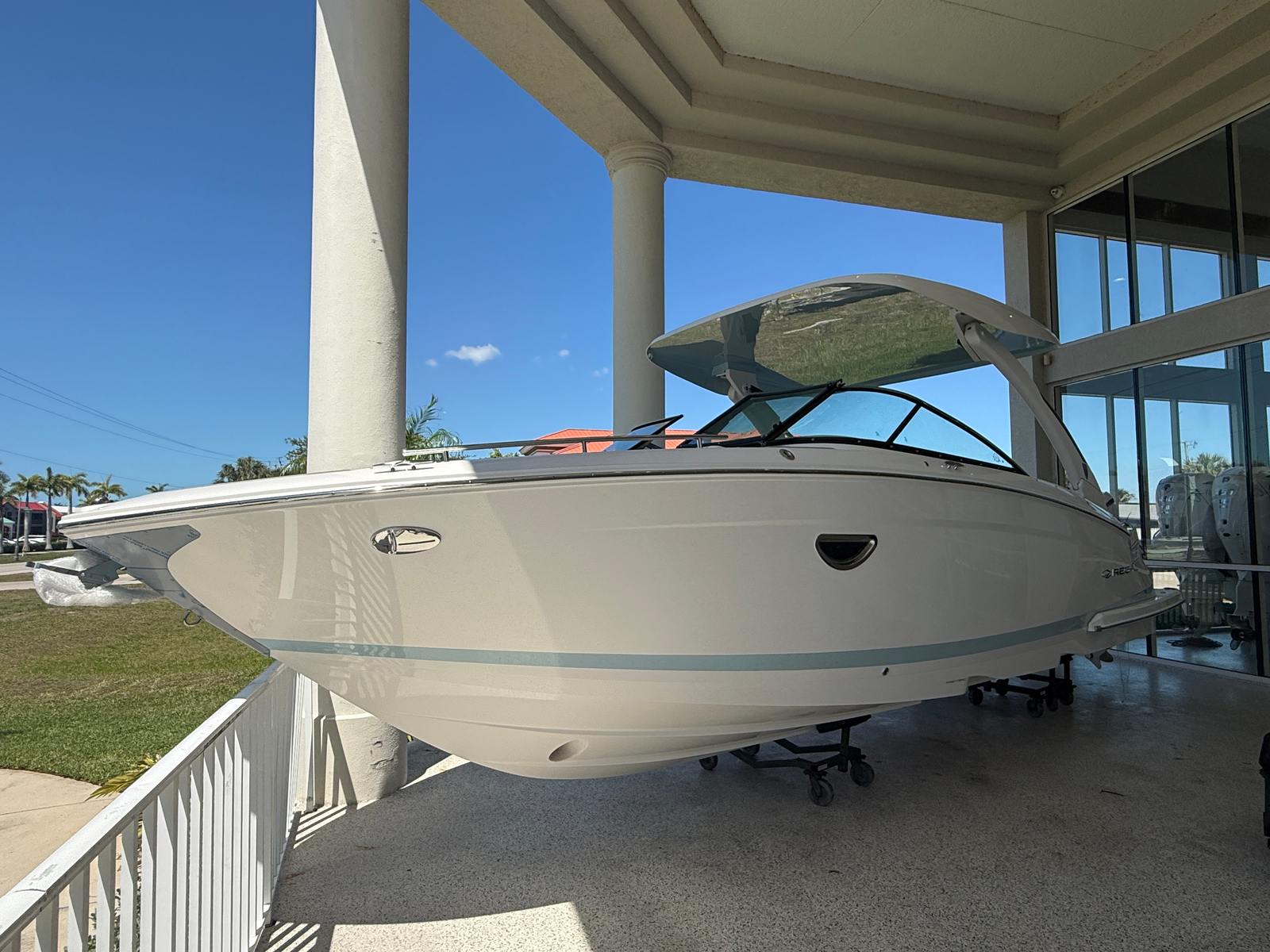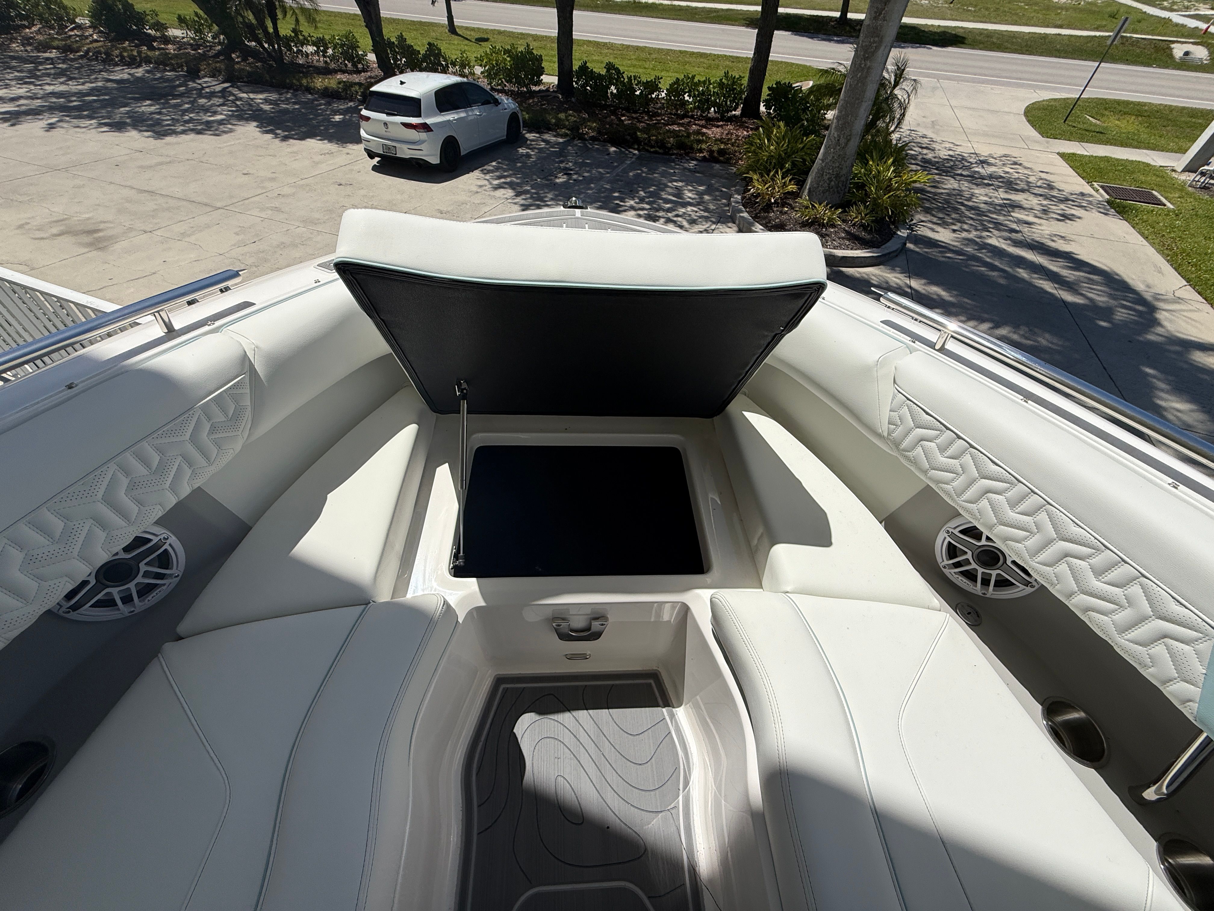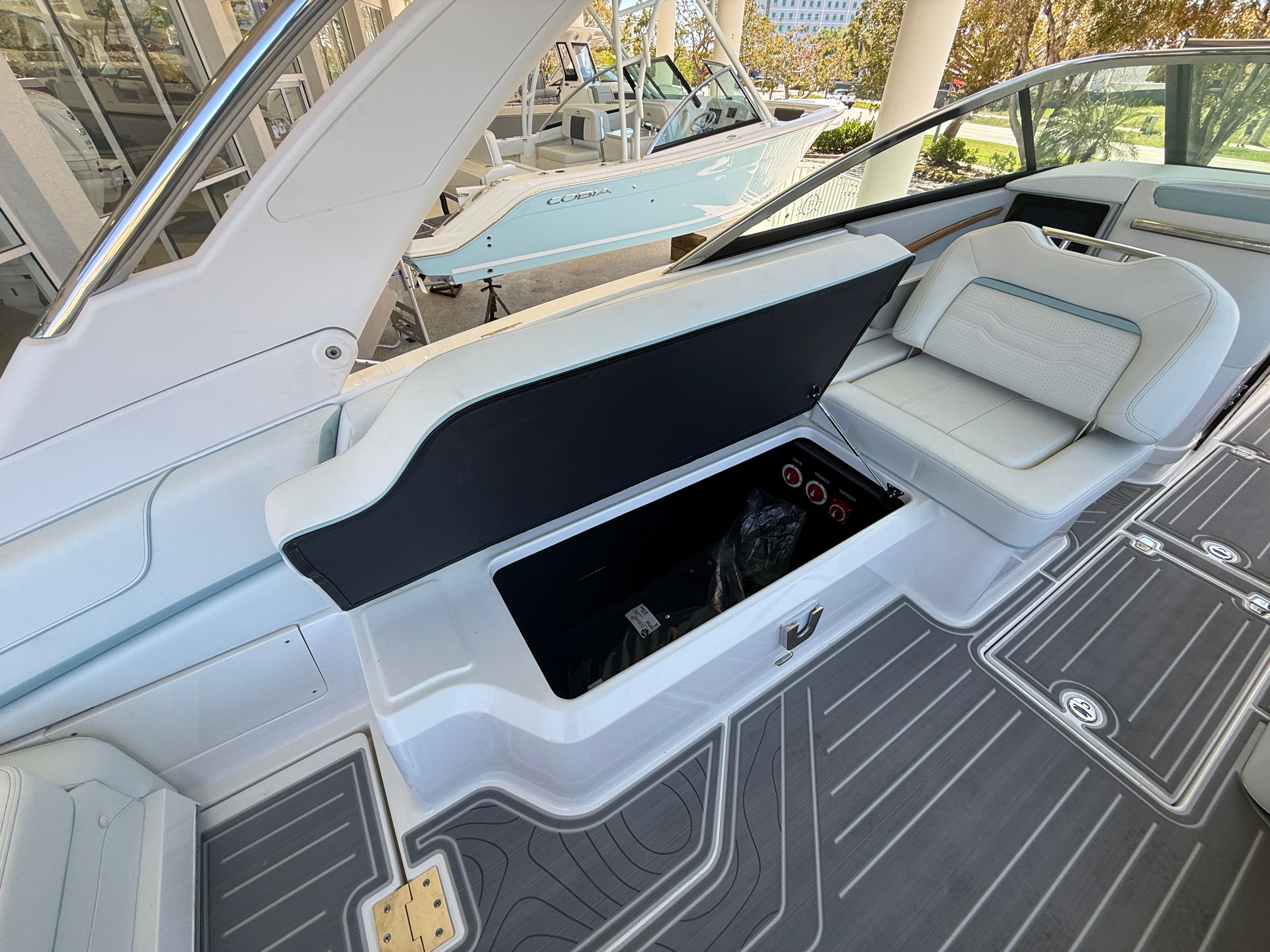 The Regal LX9 Ultimate is loaded with features that enhance both its functionality and its appeal. The hull’s Tahiti Beach White color exudes elegance, while the Belle Isle Blue bootstripe adds a touch of sporty sophistication. The interior is a masterpiece of design, with Pure White upholstery in zones 1 through 4, complemented by Belle Isle Blue accents in zones 5 and 6. This harmonious color palette creates a fresh, inviting atmosphere that is both modern and timeless.Special features include the twin Yamaha F250 engines with integrated steering, ensuring superior handling and reliability. The bow and cockpit covers provide essential protection from the elements, keeping your boat in pristine condition when not in use. Every detail of the LX9 Ultimate is crafted to deliver maximum comfort, style, and convenience.
