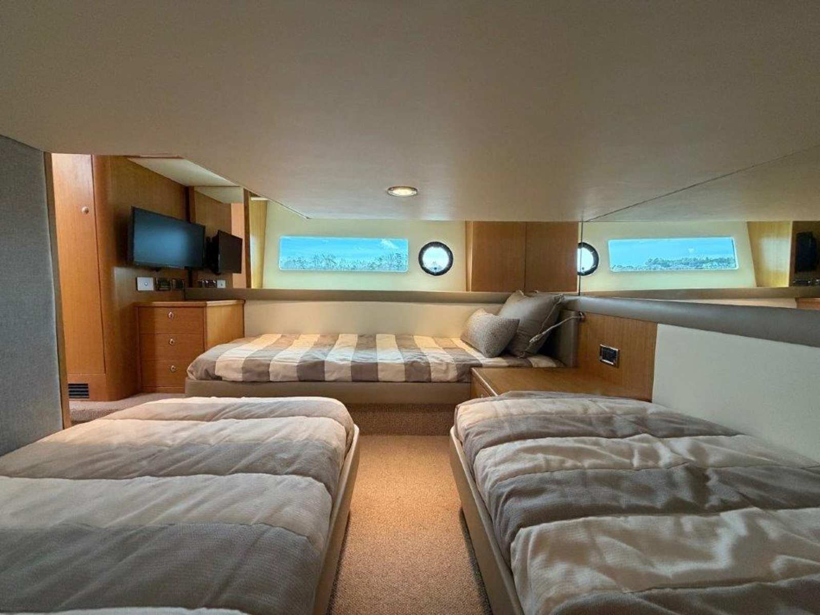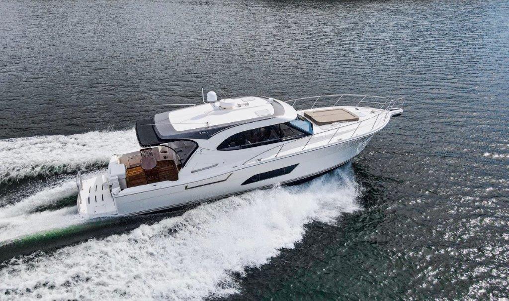 Built with Riviera’s advanced CAD engineering, she features a solid GRP hull, structural core materials, and precision-molded components bonded together for strength and durability. Her hull design includes straight-run aft chine strakes for enhanced speed and control, a moderate V forward entry, and a 14.5-degree deadrise at the transom—keeping the ride smooth and composed in varying conditions.