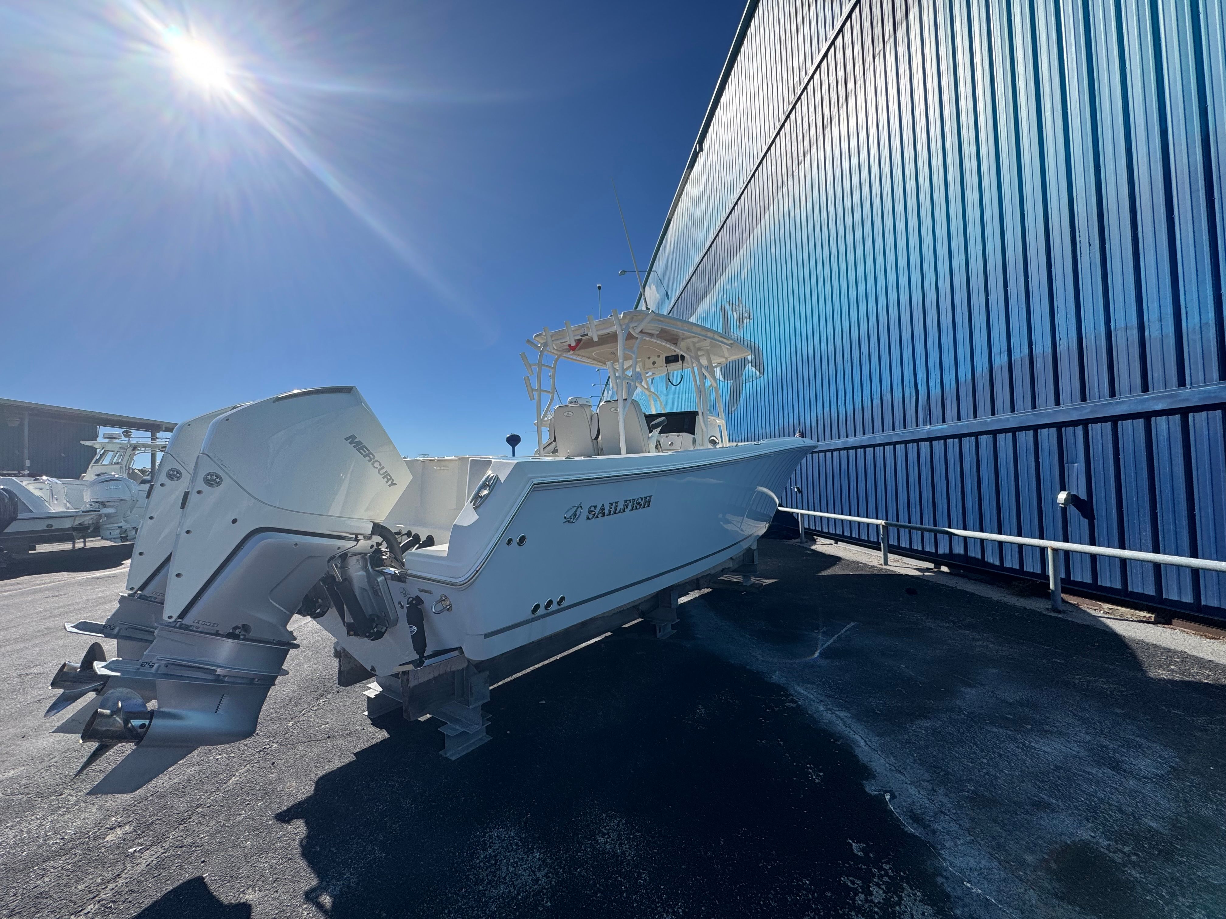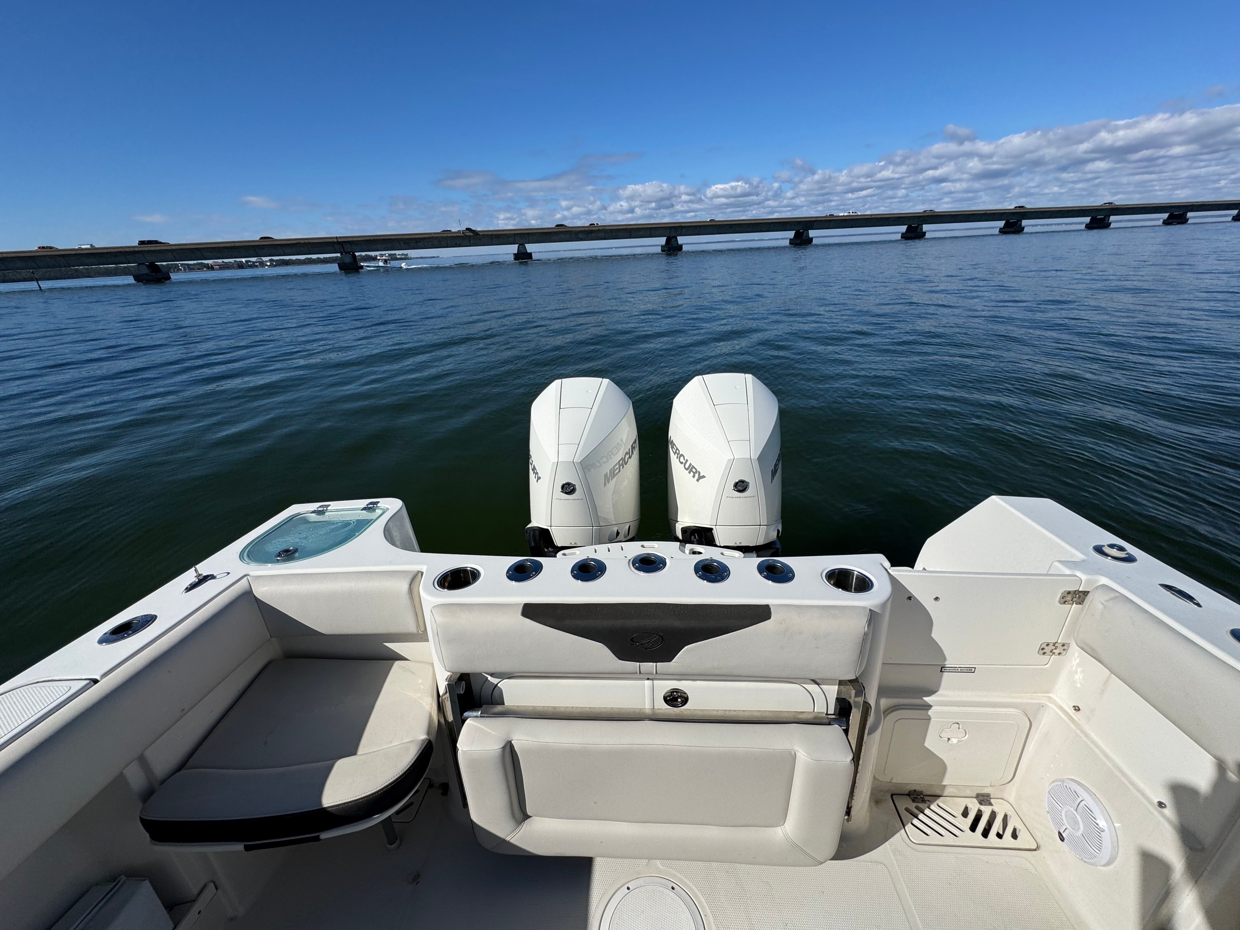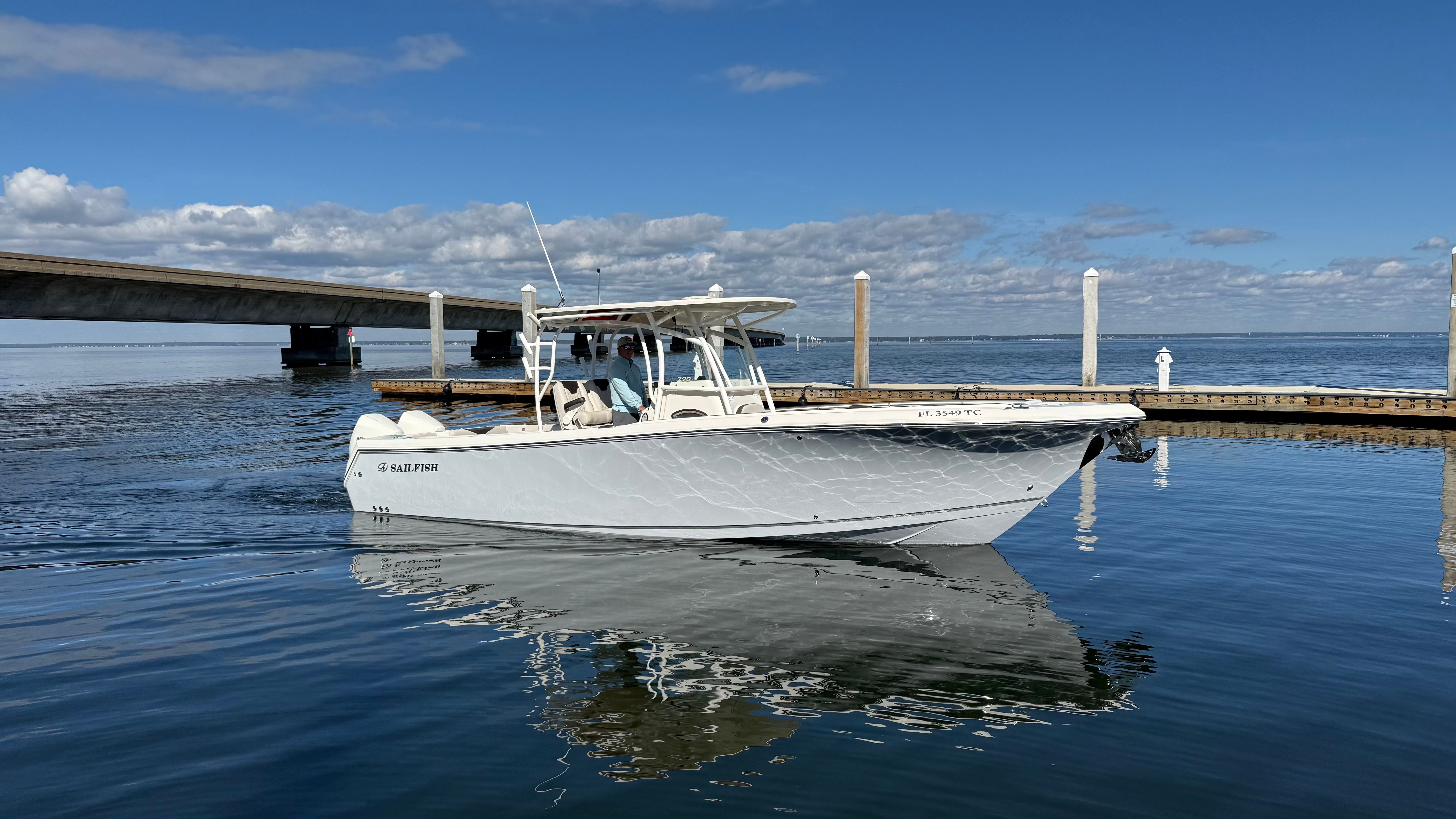 One owner beautiful Sailfish 290CC with only 105 hrs on her Twin white Mercury Verado 300's! Engines have 5 yr extended warranty, 100hr service just performed, this one is truly turnkey and ready to go.