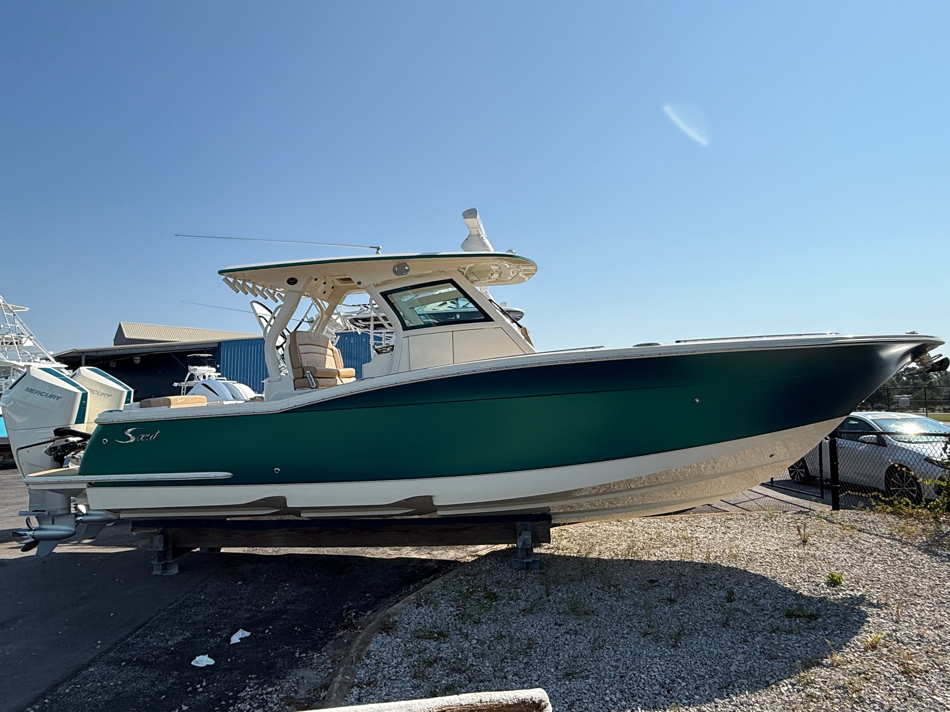 Check out this fully loaded gorgeous 2024 Scout 330 LXF powered with twin Mercury 400 V10's with only 100 hours of use! This boat is very unique as the hull has a custom wrap that is Metallic Green with accent on the motors and the hardtop! It is loaded out with the upgraded GPS screens, upgraded stereo, joystick with Skyhook and much much more! Below is a full list of factory upgrades.