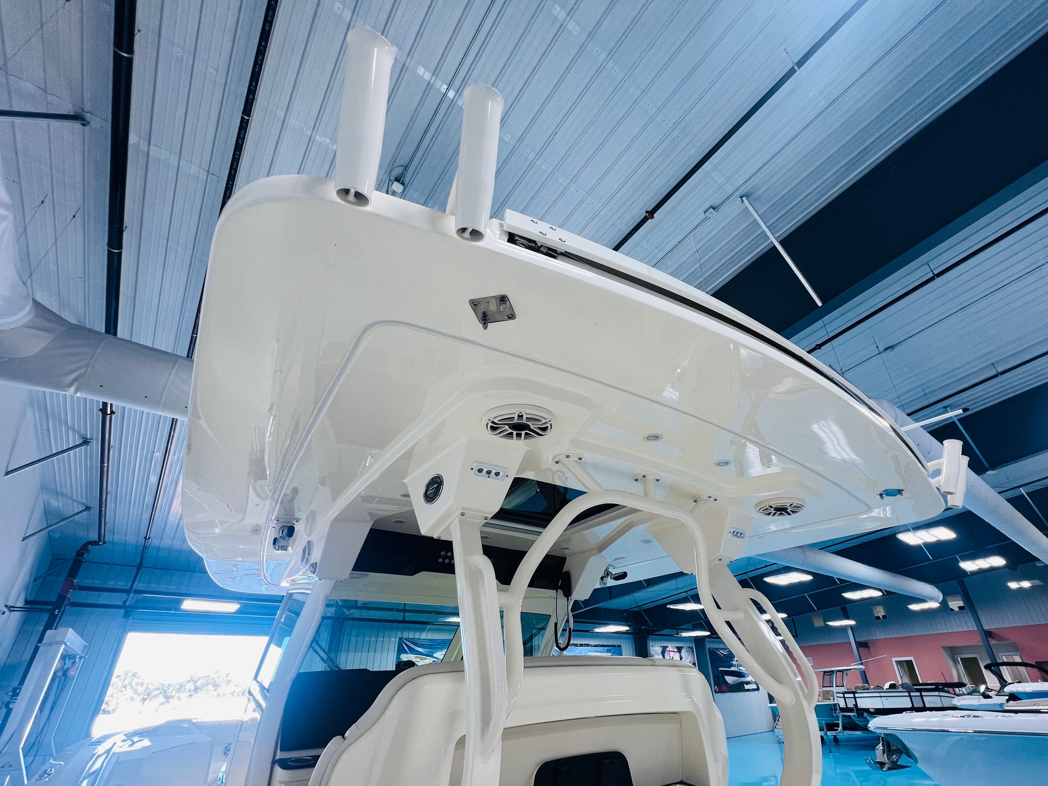 The Scout 377 LXF is packed with premium features designed to elevate your boating experience. Four powder-coated rocket launchers are mounted on the hardtop, offering convenient storage for rods and gear while maintaining a clean, organized deck. The vessel is illuminated by four LED Lumishore underwater lights (SMX 53), with two positioned on the transom and two on the forward step, creating a captivating ambiance for evening cruises and dockside gatherings.Enjoy shade and comfort with the electric Sure Shade integrated retractable aft awning, which provides protection from the sun without compromising style or visibility. The Garmin display upgrade includes three 8616 units, delivering state-of-the-art navigation, system monitoring, and entertainment options at your fingertips. A Lumitec light bar ensures optimal visibility during nighttime excursions, while installed outrigger poles make this Center Console boat a formidable choice for offshore fishing adventures. The standard leaning post offers ergonomic support for captains and crew, enhancing comfort during long days on the water.