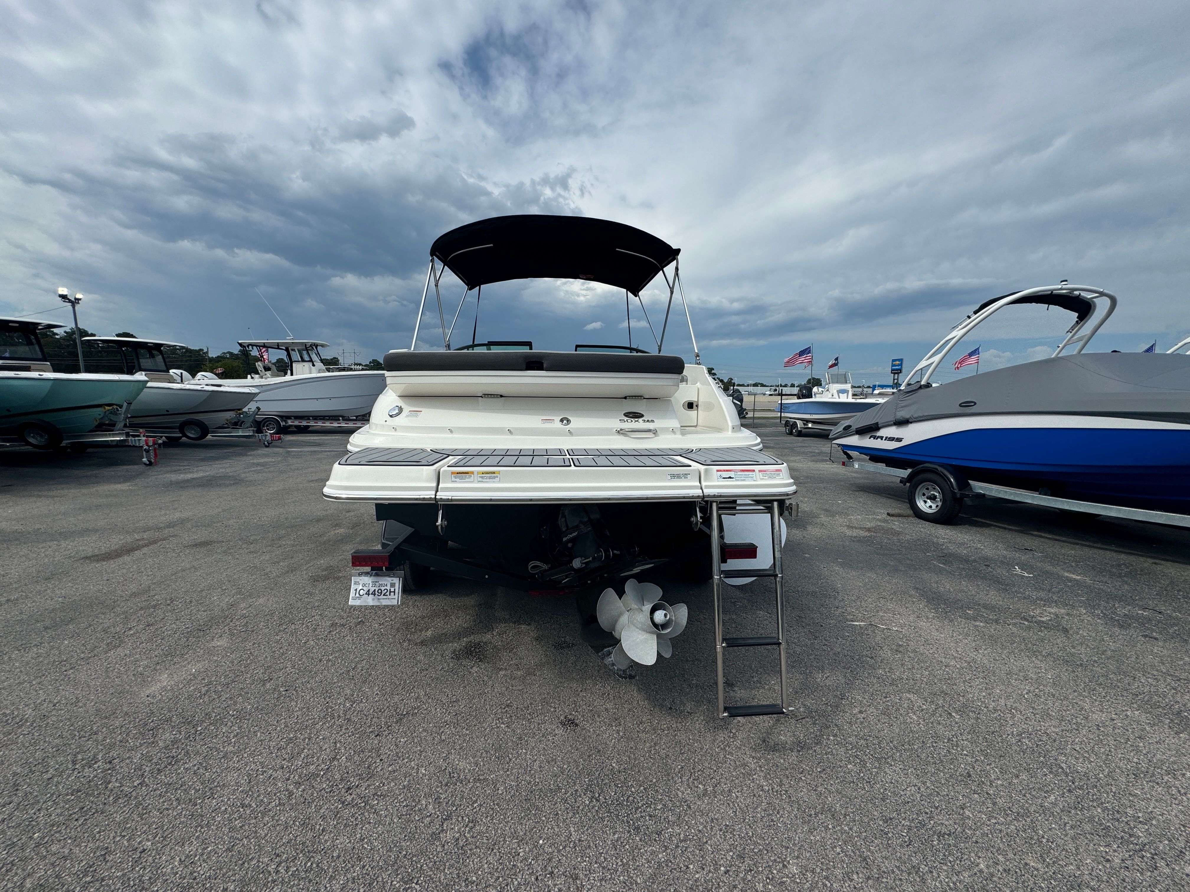 The Sea Ray SDX 240 is designed with practicality in mind, making ownership as enjoyable as the time spent on the water. The tandem axle trailer with swing tongue offers easy towing and maneuverability, whether you’re heading to a nearby lake or exploring new coastal destinations. The cover protects your boat from the elements, reducing maintenance and preserving its appearance. Annual service means you can trust the engine’s reliability, while the dual prop system provides efficient fuel consumption and improved handling. Docking is a breeze thanks to the responsive controls, and the spacious deck offers plenty of room for gear, coolers, and water toys.