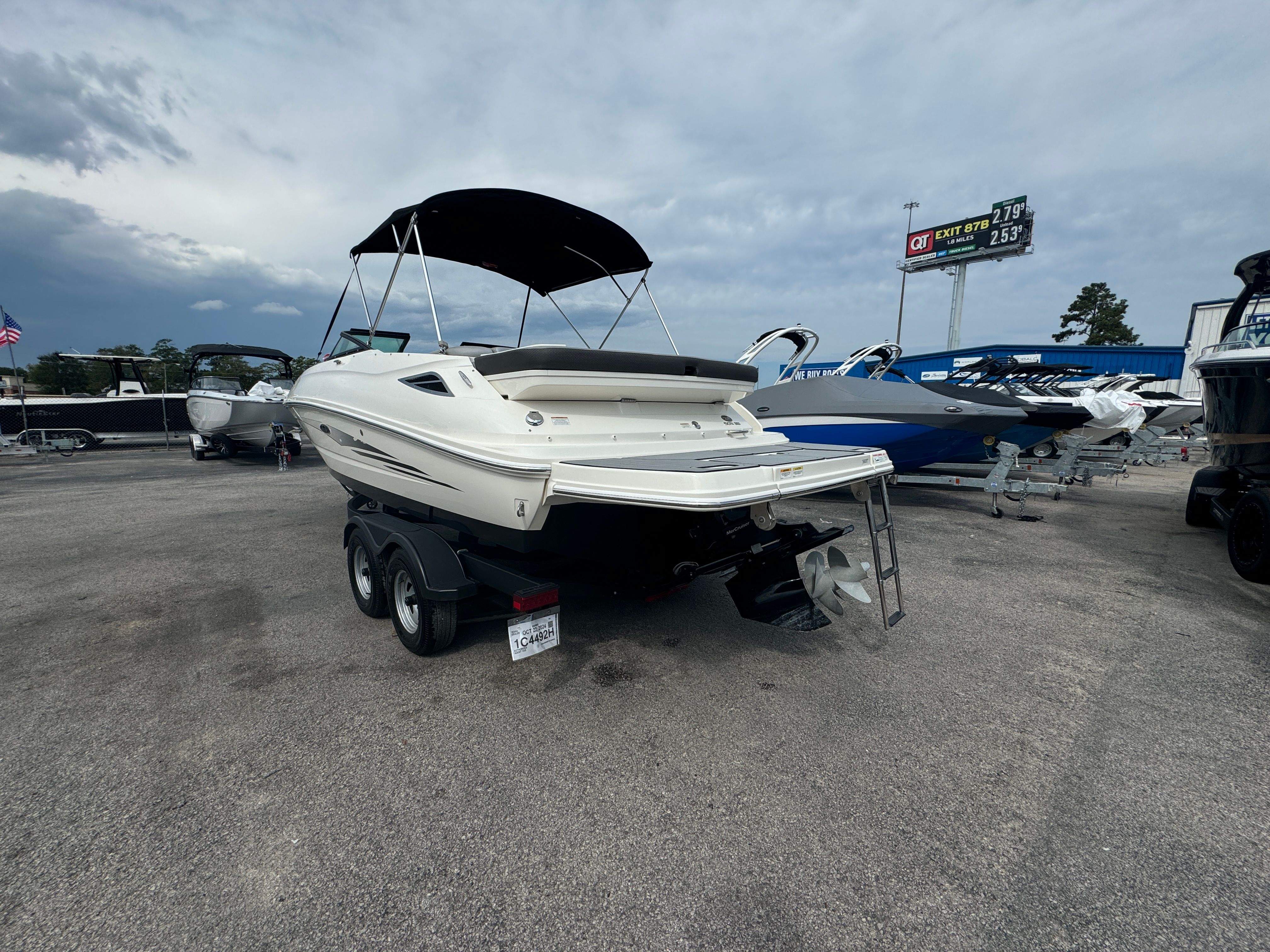 This Sea Ray boat for sale comes loaded with special features designed to enhance your boating experience. The Bimini top provides shade and protection from the sun, allowing you to stay comfortable during long days on the water. The Bluetooth stereo system lets you set the perfect soundtrack for your adventures, whether you’re relaxing or celebrating with friends. A cover helps protect your investment when the boat is not in use, keeping it looking its best season after season. The tandem axle trailer with swing tongue makes transportation and storage a breeze, offering flexibility and convenience for owners who want to explore new waterways. Dual prop technology improves handling and efficiency, while annual service ensures the boat is always ready for action.