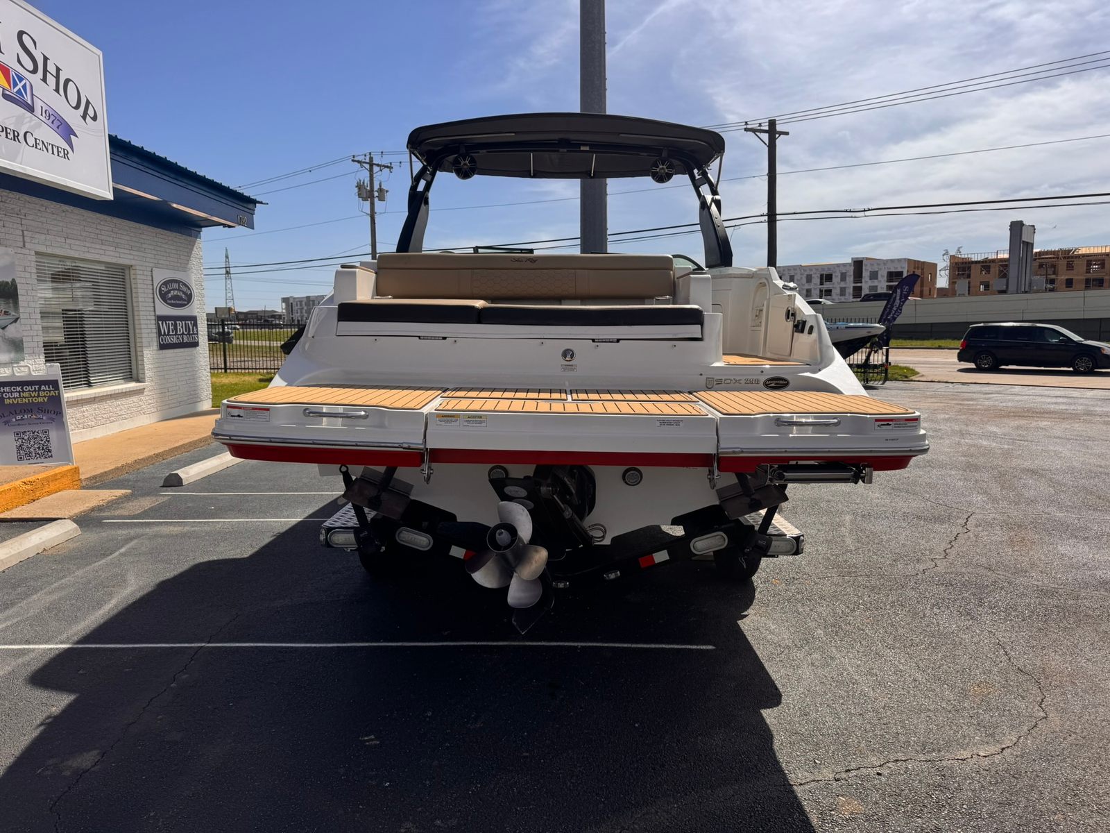 Now available at our Used Boat Super Center in Lewisville, this 2020 Sea Ray SDX 290 is a premium luxury deck boat designed for entertaining, watersports, and long days on the lake. Finished in a freshly buffed red and black gelcoat with a tan interior, this SDX 290 is powered by a MerCruiser 8.2L V8 producing 380 horsepower with only 82 hours and dual stainless steel 3-blade props.