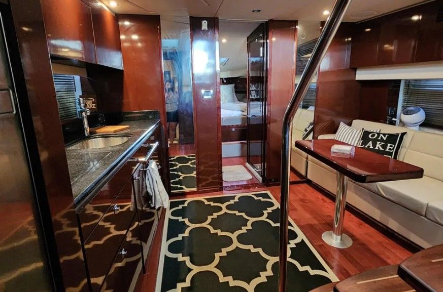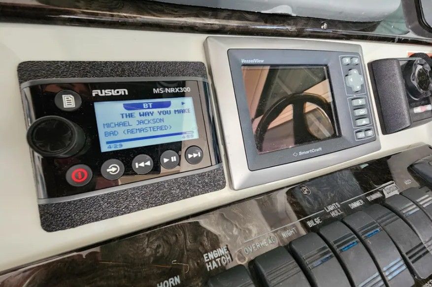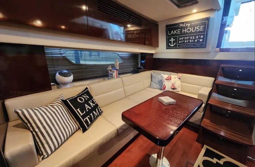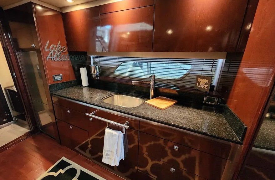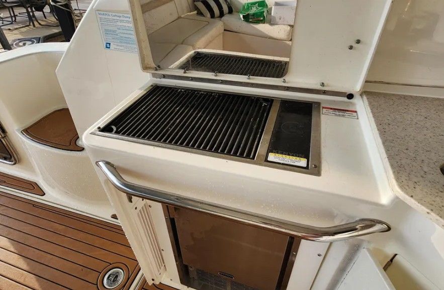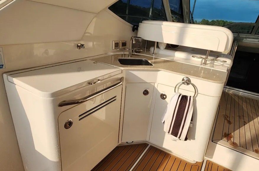 Powered by twin Cummins QSB 480 diesel engines with pod drives, this Sundancer delivers confident performance and remarkable joystick maneuverability, especially in tight spaces or while docking. Both pods have been recently serviced. The engines have approximately 800 hours, and the 15kW Onan generator has around 600 hours, with recent service completed. The boat has also been buffed and waxed on all fiberglass surfaces.
