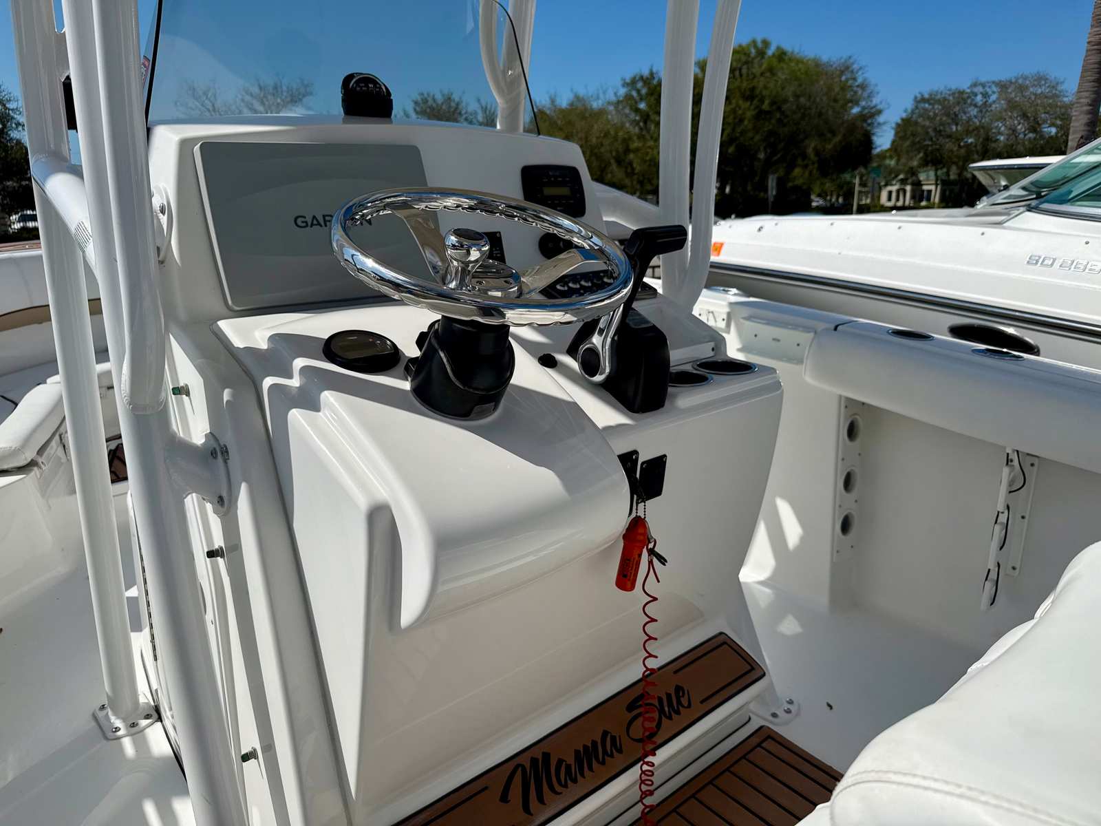 At the helm, you’ll find a Garmin 12-inch navigation display with sonar, providing clear, easy-to-read charting and fish-finding capabilities, along with a Garmin dome radar to enhance visibility and safety when navigating in low-light or changing weather conditions. The boat is also equipped with a jackplate, allowing for improved performance, shallow-water capability, and fine-tuned trim while underway.