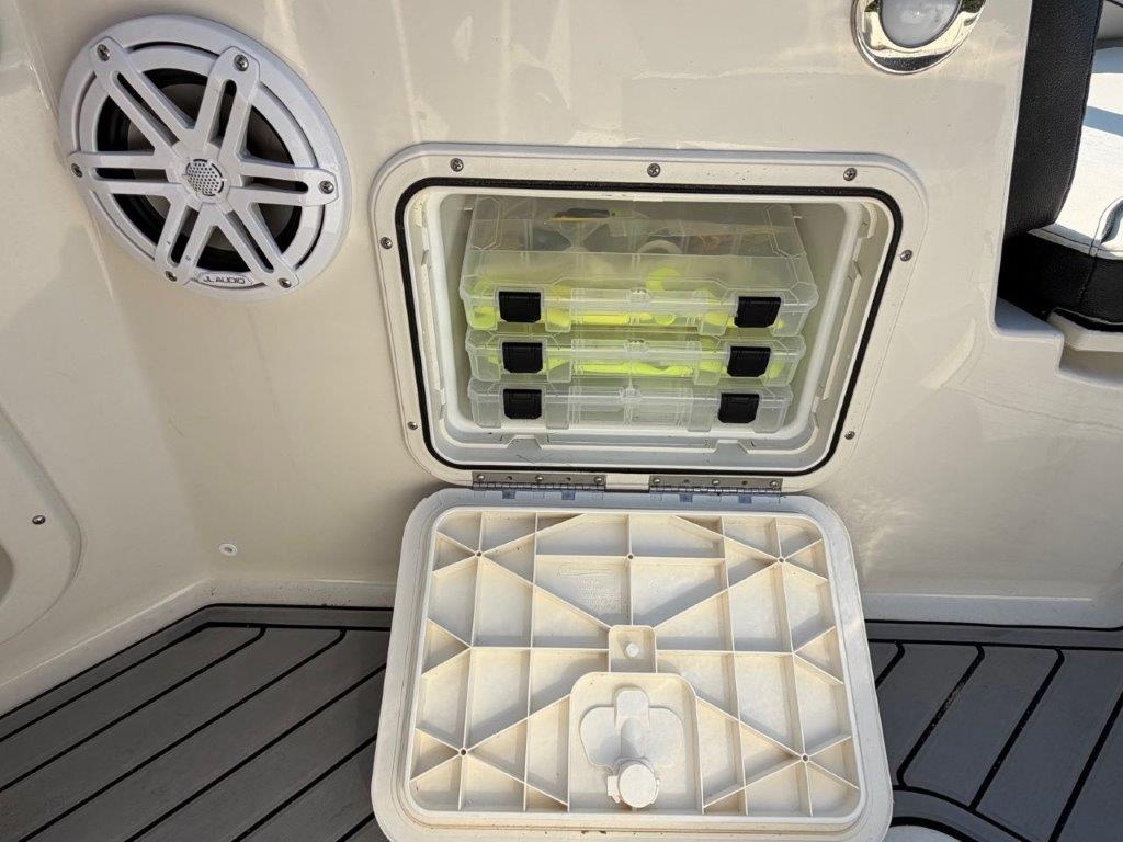 Additional highlights include a self-bailing cockpit, bow seating with cushions, stainless pop-up cleats, raw water washdown, underwater lights, blue LED accent lighting, swim platform, ski tow bar, and a large helm storage compartment that includes a porta potti/changing space. Smart storage is built into the design so the deck stays clean and uncluttered even on longer days out.