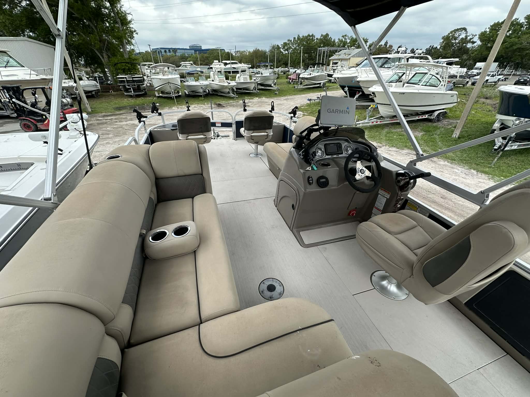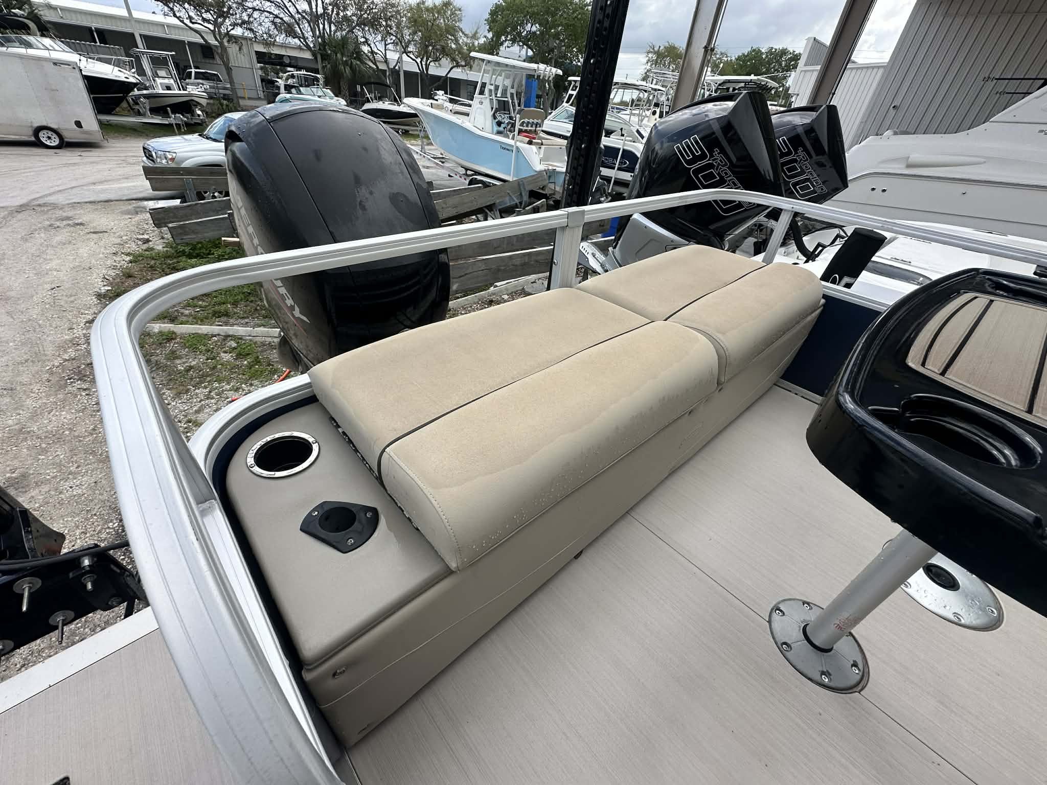This boat is fully rigged for anglers with dual Power-Pole shallow water anchors, multiple livewells, rod holders, and a Garmin 126SV GPS/fishfinder, making it an excellent setup for freshwater or inshore fishing. Comfort features like SeaDek flooring and a Bimini top make it just as enjoyable for relaxing days on the water with family and friends.