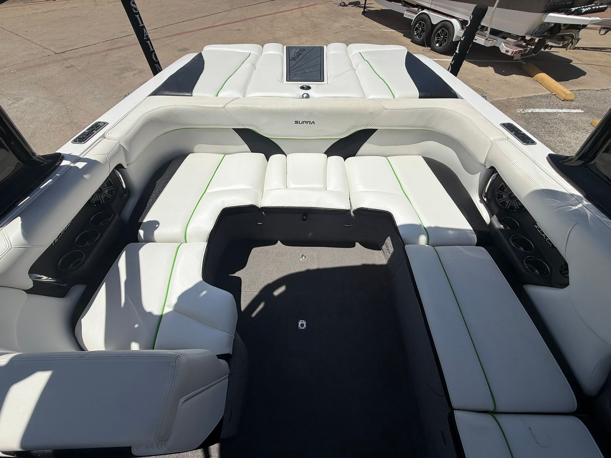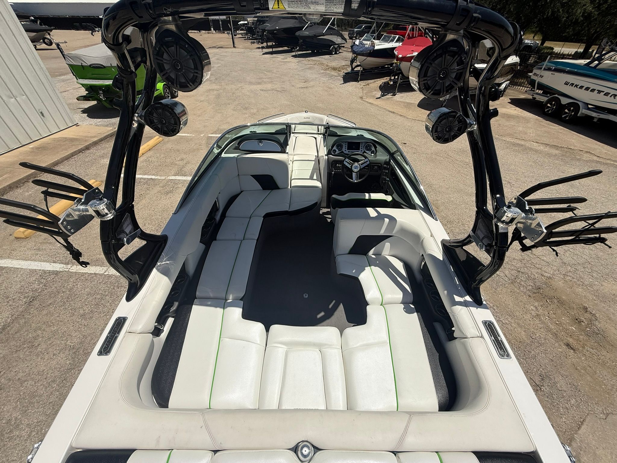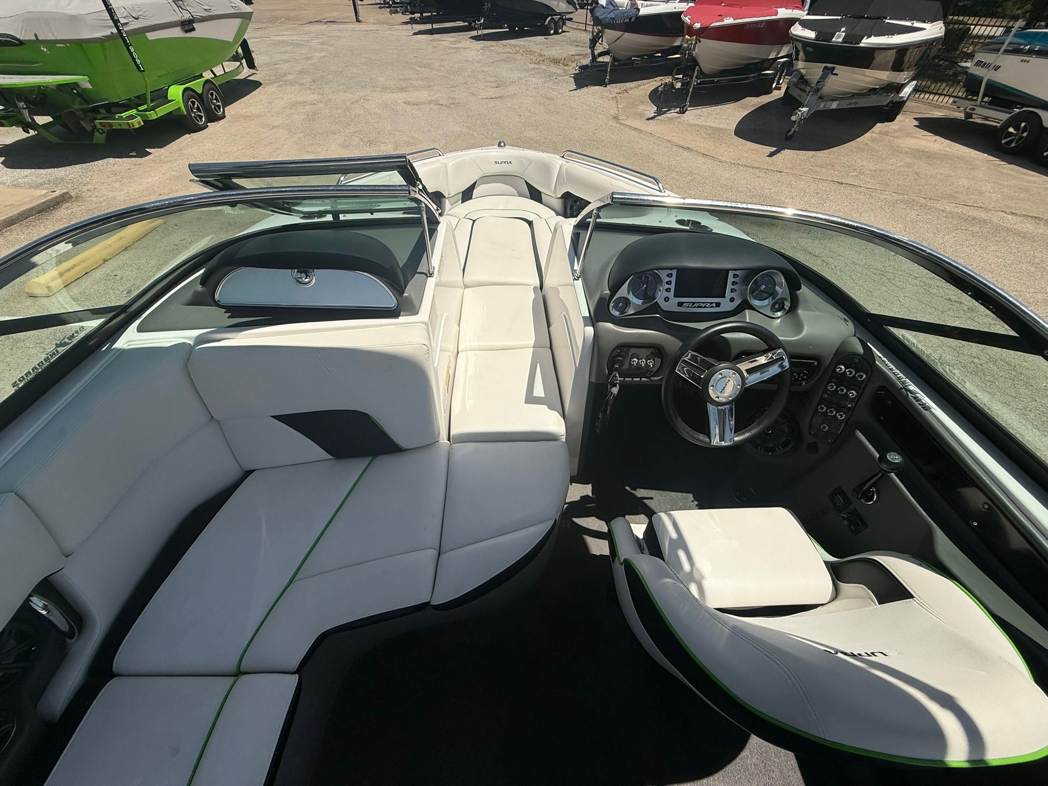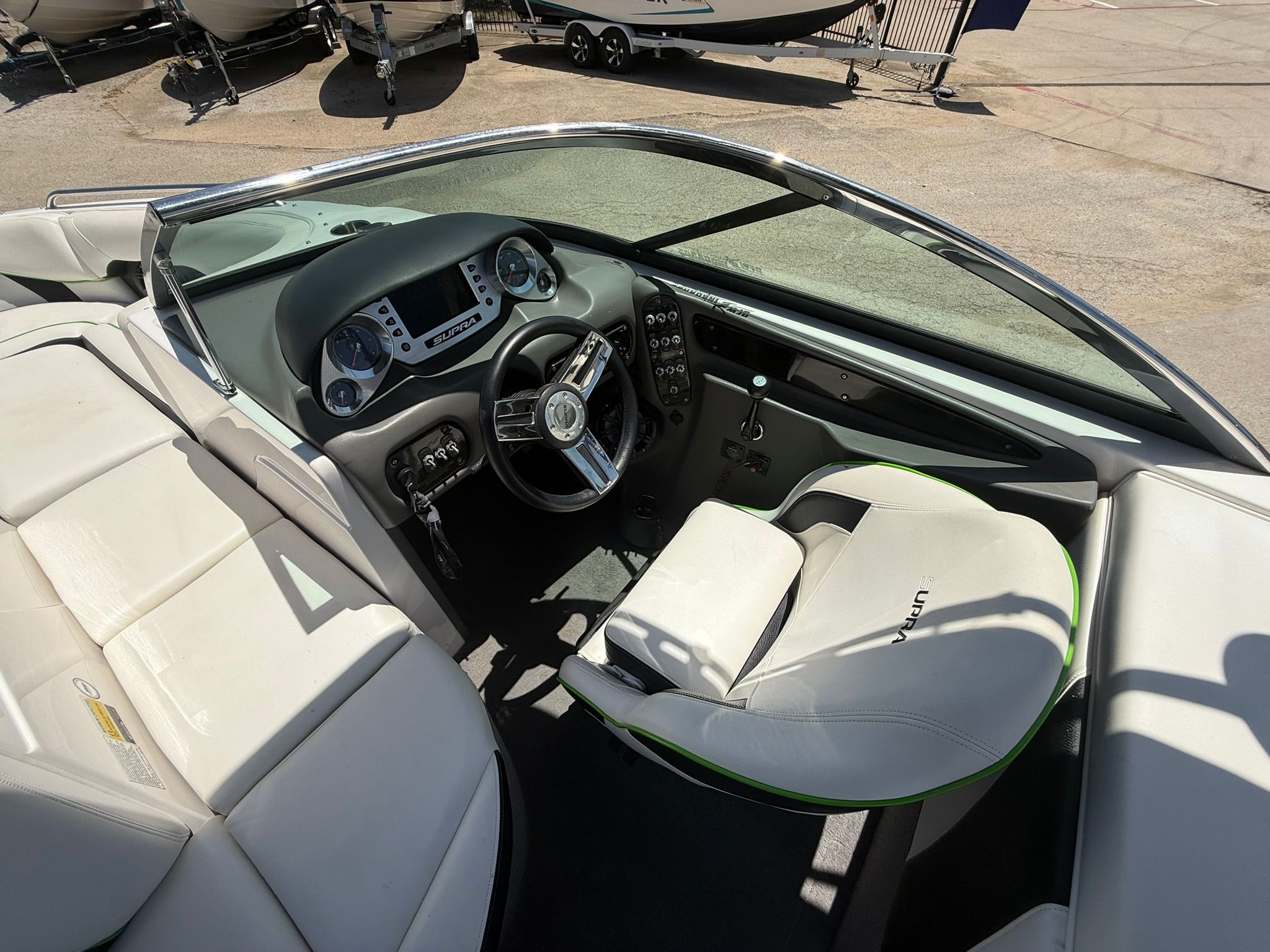 Indmar Fuel Injected 5.7L Engine, 330 HP, 644 Hours, Full Ballast System, Zero-Off GPS Based Cruise Control, Tower w/ Bimini Top, Swivel Board Racks, Upgraded Stereo w/ 4 Tower Speakers, Docking Lights, Transom Stereo Remote, Dual Batteries w/ Switch, Bow & Cockpit Covers, Playpen Style Bow Seating, Depthfinder, Tilt Steering Wheel, Captain's Chair w/ Bolster, Walk-over Transom, Hydraulic Smart Plate, Custom Matching Tandem Axle Trailer w/ Custom 18' Wheels, Spare Tire, Stainless Steel Fenders, Brakes, & Swing Tongue. Excellent Condition! This boat is being offered on consignment at our New Used Boat Super Center location in Lewisville, TX. Please call 972-850-2628 or e-mail for more information or to schedule a viewing.