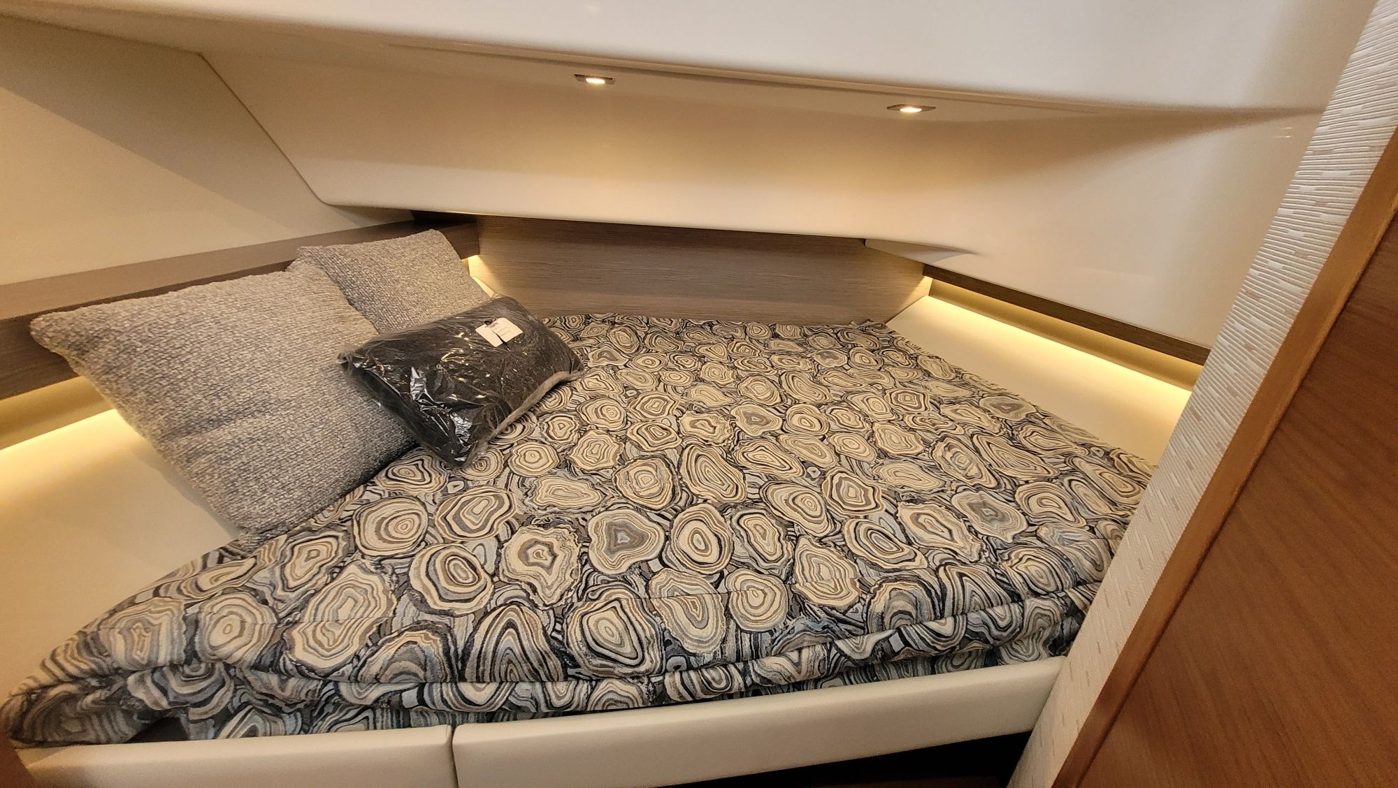 Other notable options include, Panda diesel generator 5KW, water heater, cockpit grill, cockpit TV, Drop curtain enclosure, dramatic lighting package, cool helm air and heat 6k, head macerator system, custom freshwater flush system for the generator and AC unit and custom Yeti cooler storage.